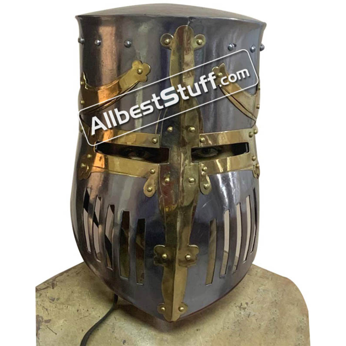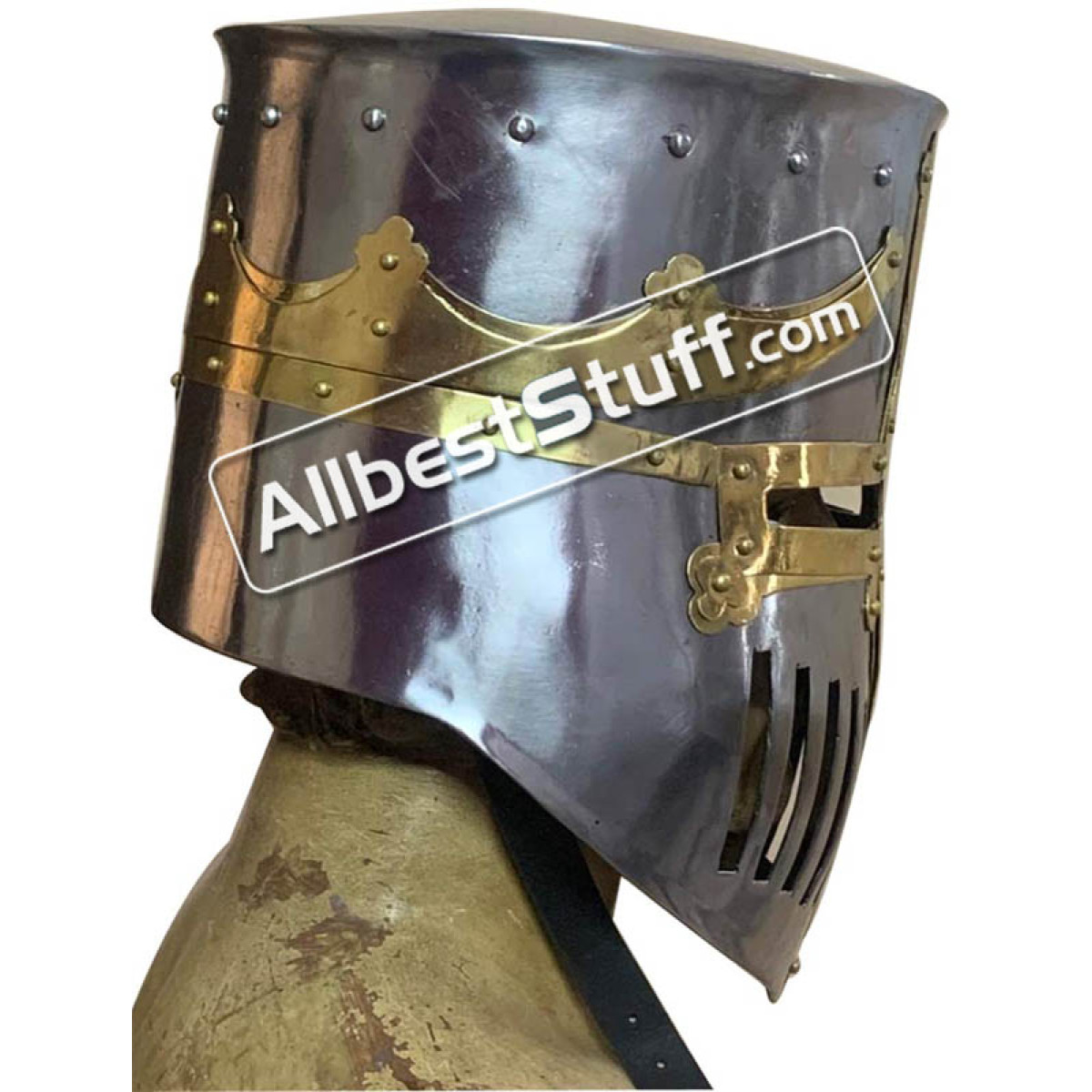 This type of helm, almost akin to a Great Helm in appearance, is really an evolution of the simple pot helm - but with the addition of a face plate, as well as side and back plates to make a helm that fully encompasses the head. Standard Adult Size fully wearable.