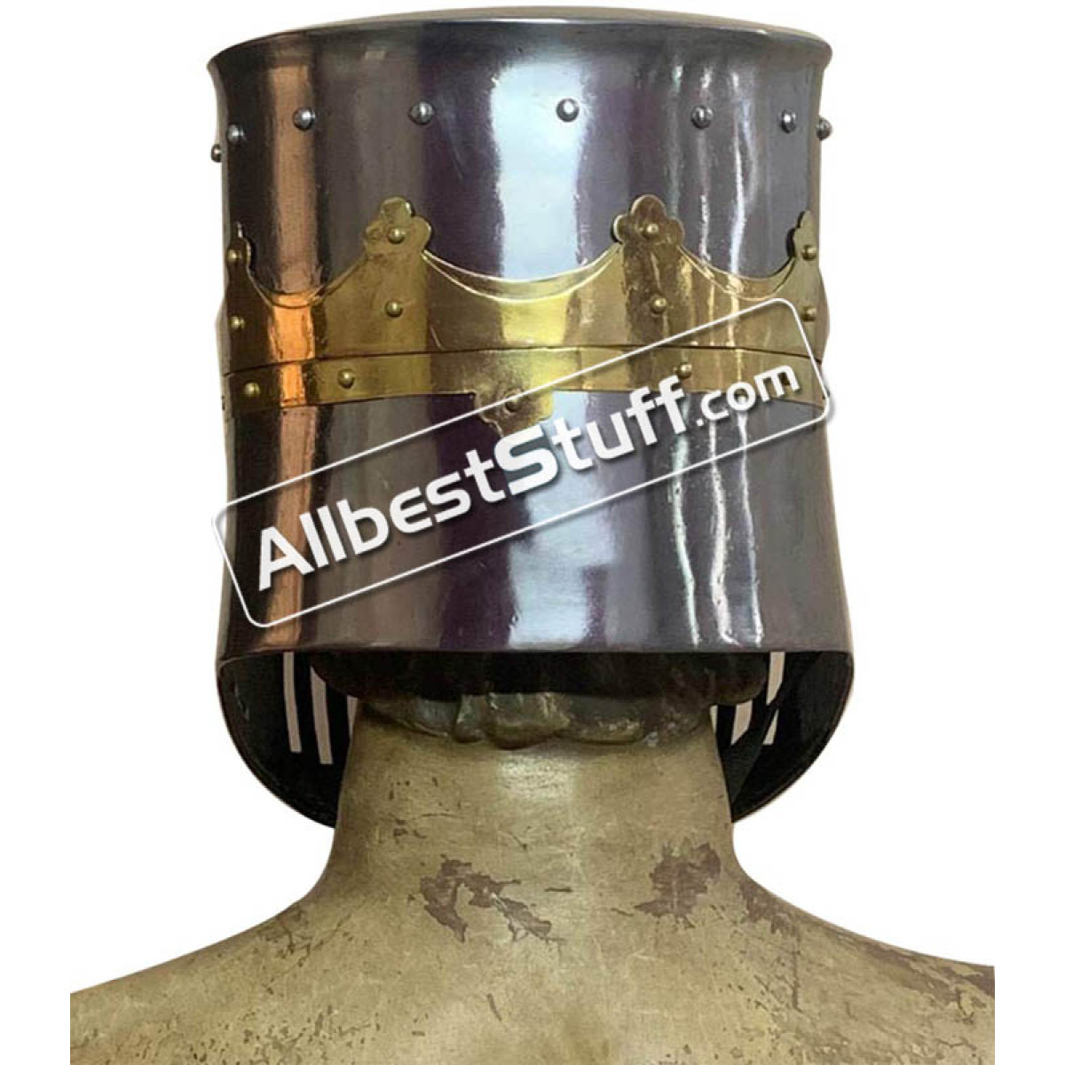This 13th Century Pot Helm is lavishly embellished with a cross and crown of riveted brass onto its 16 gauge steel form. The inside of the helm is blackened and is fitted with a padded, adjustable liner of quilted cotton; the liner can be adjusted to best fit the head. The helm is completed with a leather chin strap that can be adjusted to fit with its antiqued brass buckle.