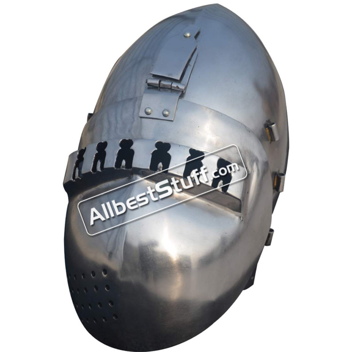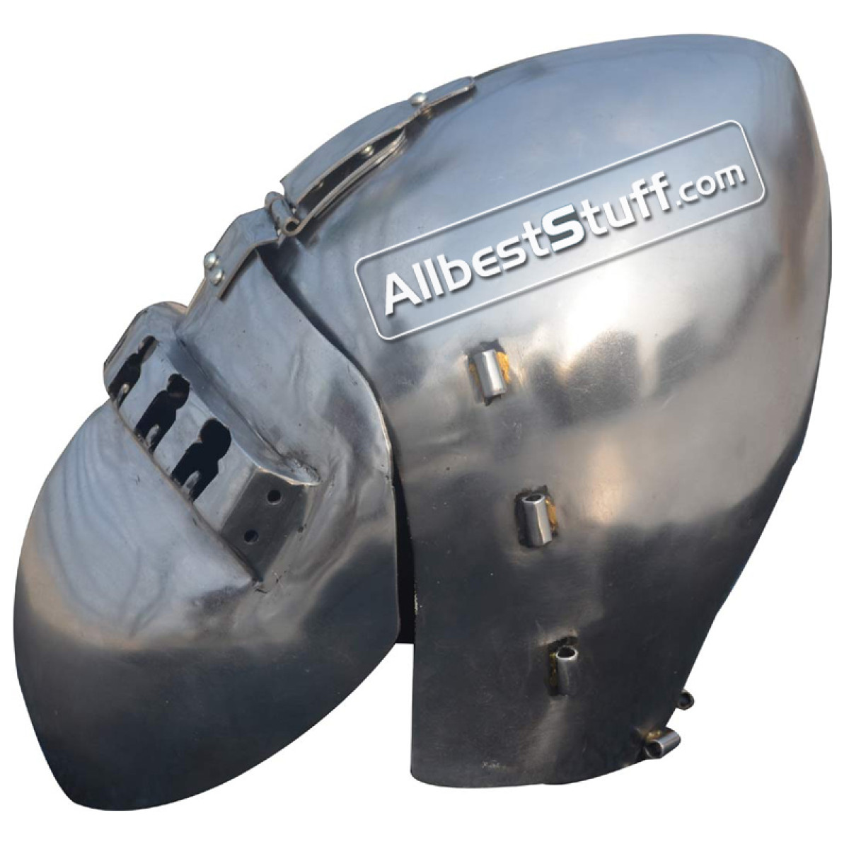 Medieval 14th Century Klappvisor Bascinet Helmet, The Klappvisier Bascinet is characterized by the single central hinge of the removable visor and was common in Bavarian army museum. XIV-XV A.D. The visor typically covered the parts of the face not protected by an aventail, attachment points (vervelles) for which are provided on this helmet, this helmet offers full head protection and is lined and ready for use. Standard Adult Size fully wearable.