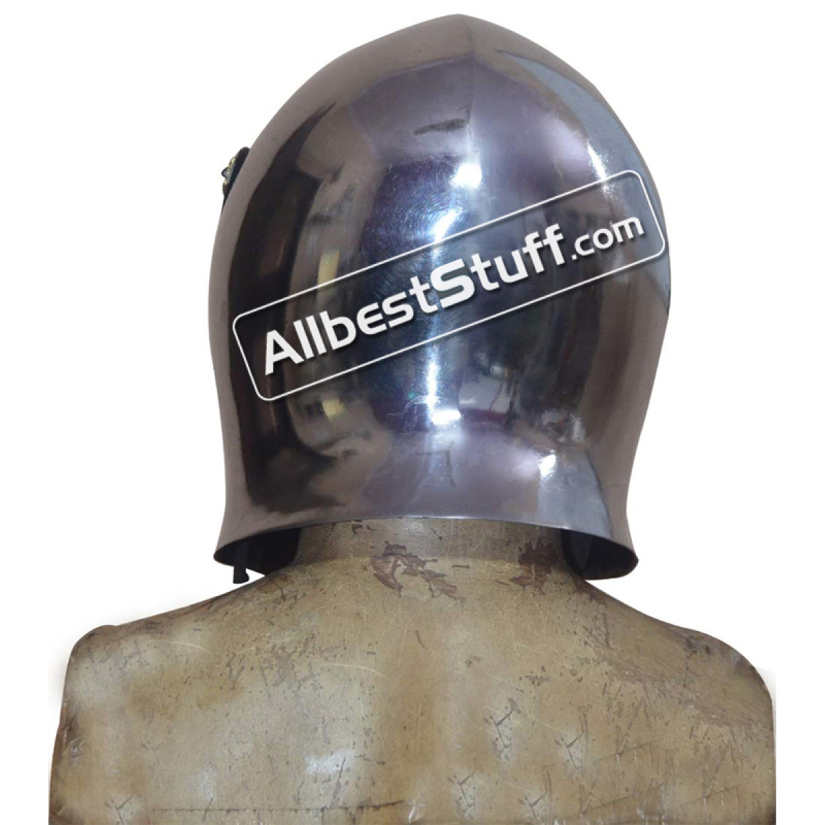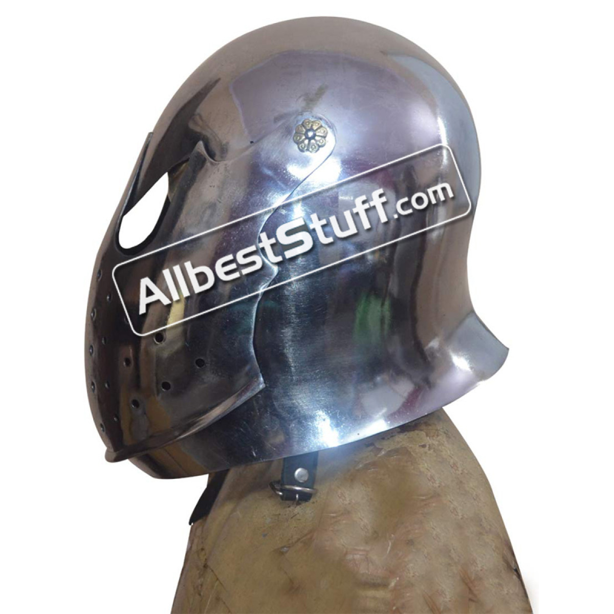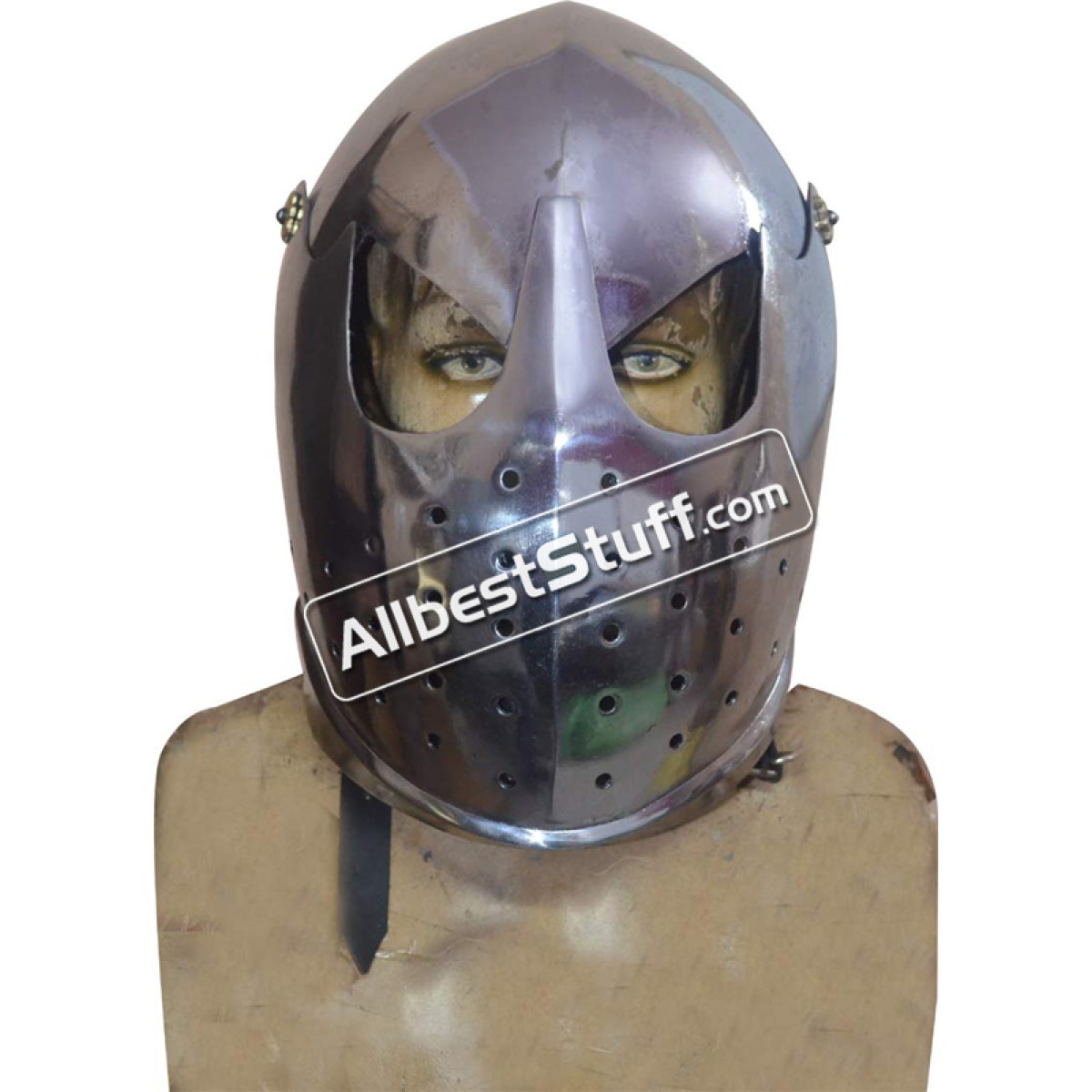 Visored Barbuta helmet has been inspired by the European soldiers. It has been designed to protect the head and face. The leather straps of the Visored barbuta can be tightened beneath the chin to secure the helmet in place. This helmet is made of 16 Gauge mild steel and top-grain leather straps and fittings.