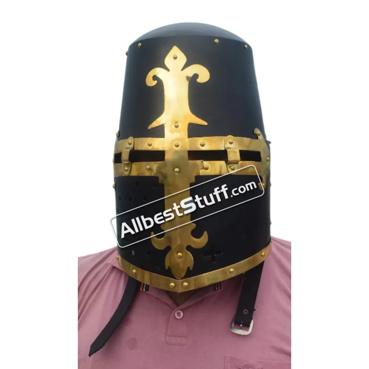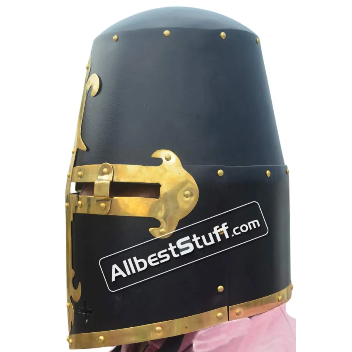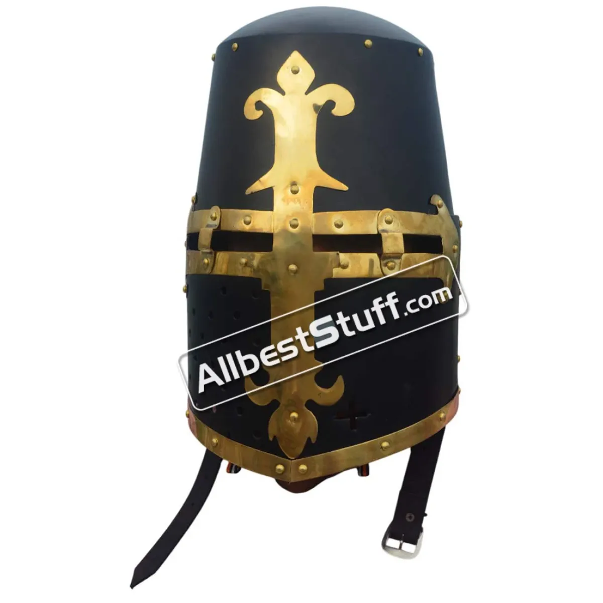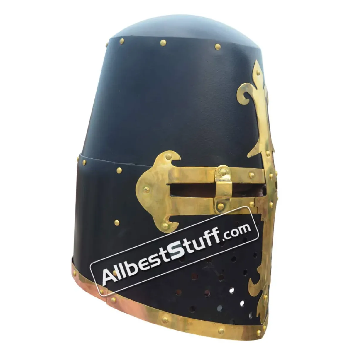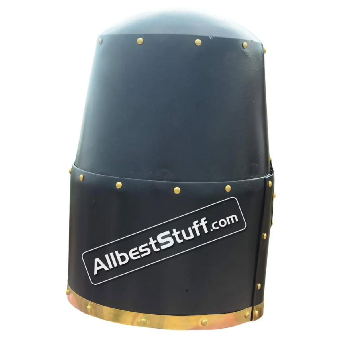 The Great Helmet of Reiter von Kornberg, Nuremberg, reproduction of a Late Medieval Great Helmet of Reiter von Kornberg, Nuremberg owned by the family Reiter von Kornberg and found in their tomb in the Allerheiligenkirche Kleinschwarzenlohe, Germany. the reconstruction is hand made of 16 Gauge steel. All steel parts have been riveted with brass rivets as well as the brass fittings on the front. These just were painted on the original piece. Use a heavy inner padding inside for protection. Standard Adult Size fully wearable.
