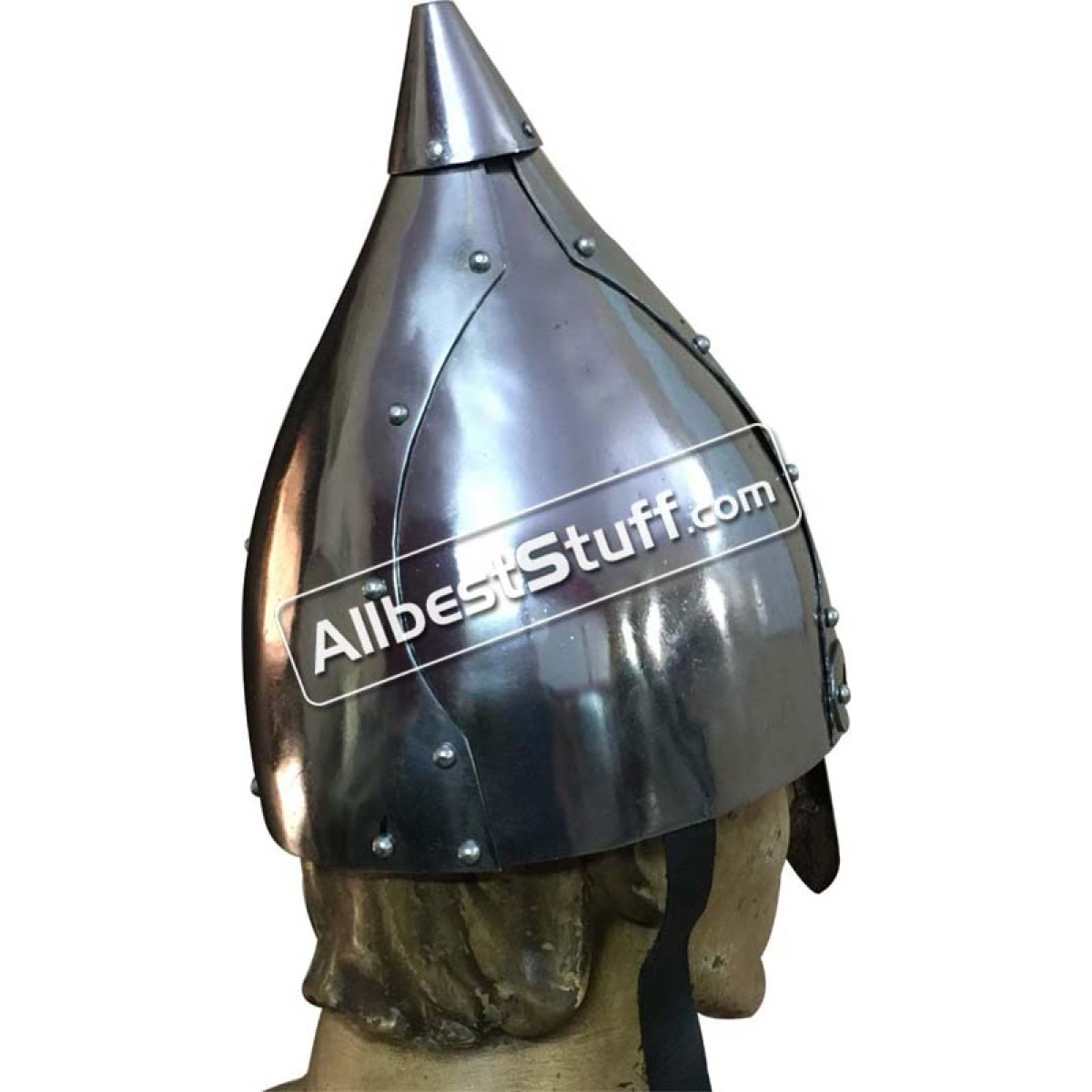 Medieval 8th Century Early Slavic helmet 14 Gauge steel. Replica of a Slavic nasal helmet of the 8th Century. This kind of helmet was very popular not only with the Slavic tribes but also with the Russian, the Varangian and the Khazars . The helmet is made of 14 Gauge thick overlapping steel plates and riveted. This is a very robust construction. The helmet is fully battle-ready. Standard Adult Size fully wearable.