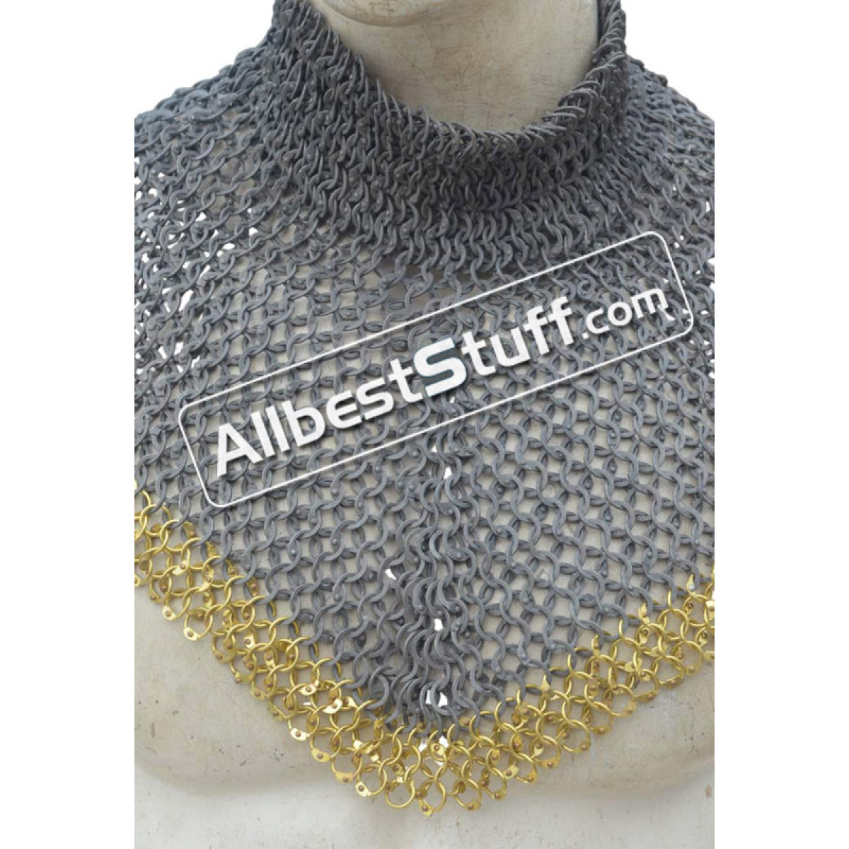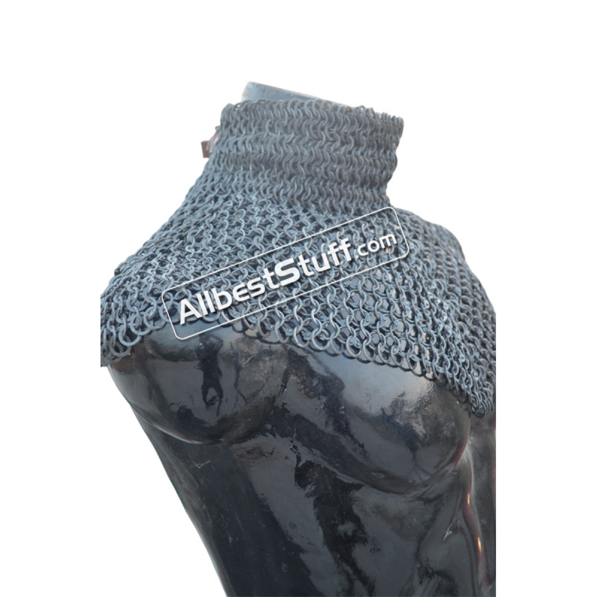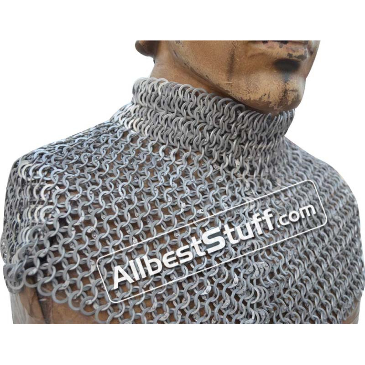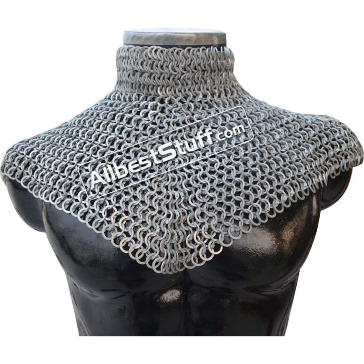 Medieval Stylish Chain Mail Collar with high neck. this piece still uses the same quality materials and finishing techniques to create a refined piece of armor. All of the mail rings on this standard are made from Aluminum, We have used the standard mail ring pattern of 4:1 for the largest part of the collar, maille standards would have a tighter weave around the actual neck part, we’ve used a 6:1 weave on the neck, which looks excellent and provides a bit of extra protection due to the denser pattern of rings.