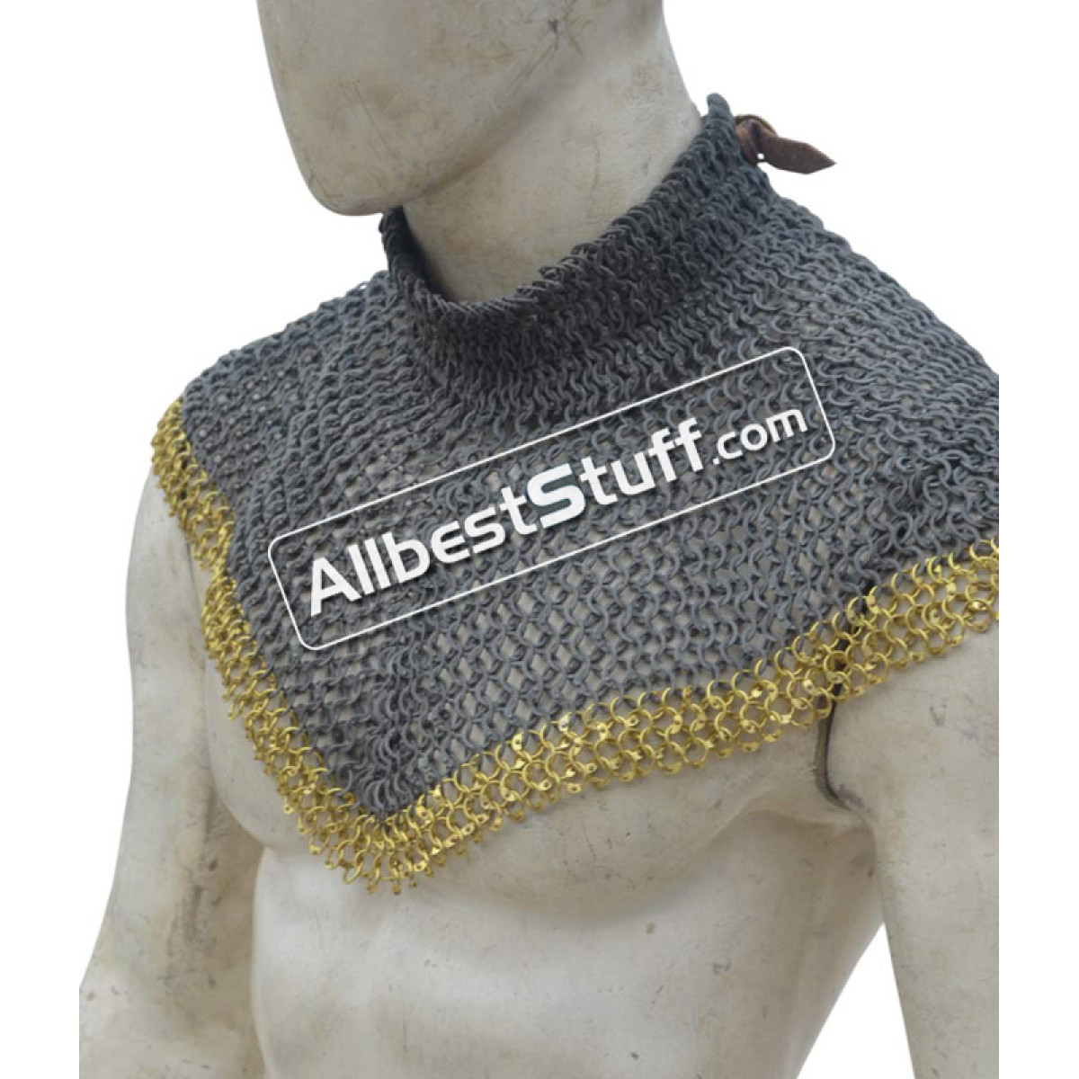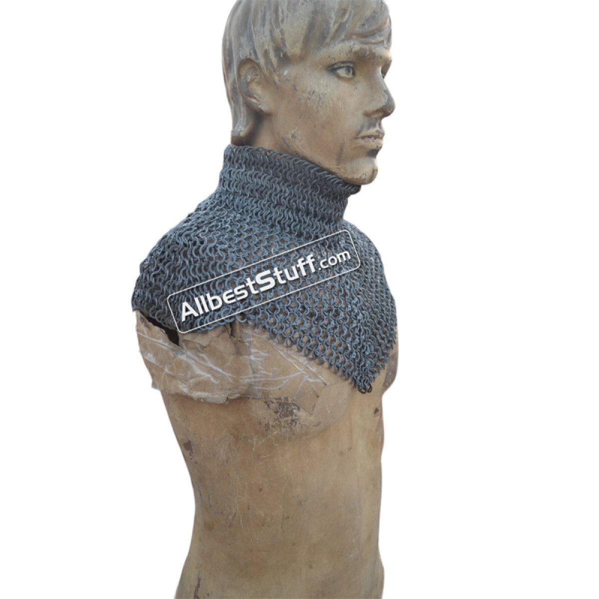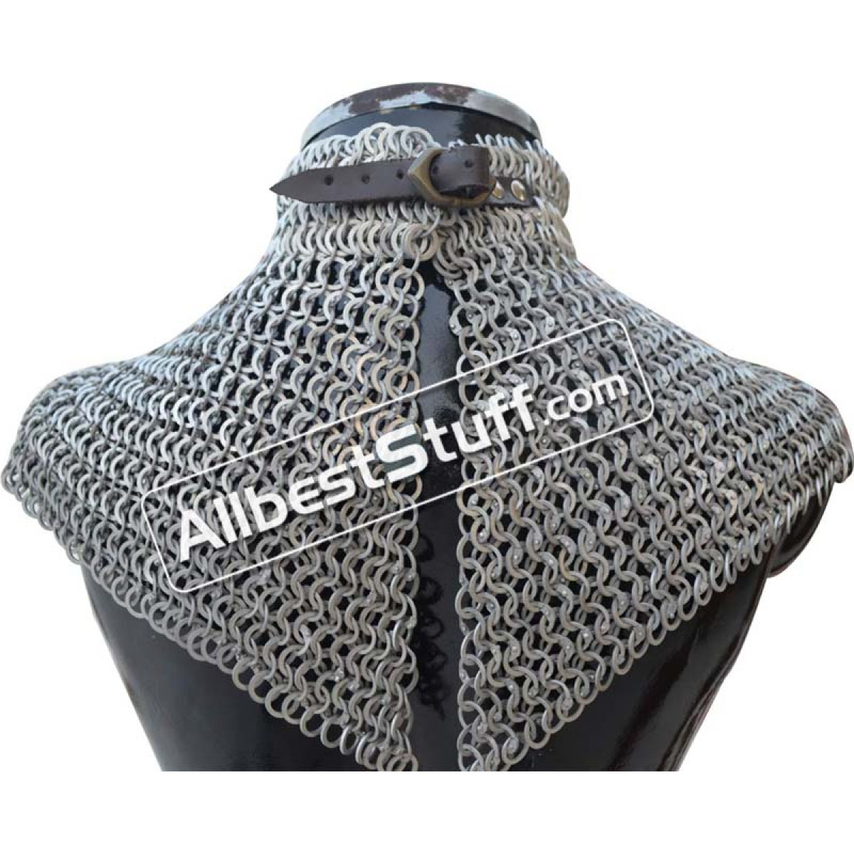 Medieval Stylish Chain Mail Collar with high neck. this piece still uses the same quality materials and finishing techniques to create a refined piece of armor. All of the mail rings on this standard are made from Aluminum, We have used the standard mail ring pattern of 4:1 for the largest part of the collar, maille standards would have a tighter weave around the actual neck part, we’ve used a 6:1 weave on the neck, which looks excellent and provides a bit of extra protection due to the denser pattern of rings.