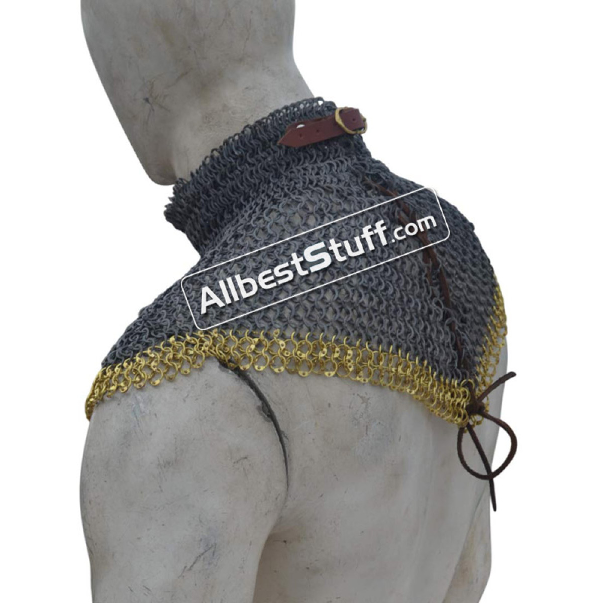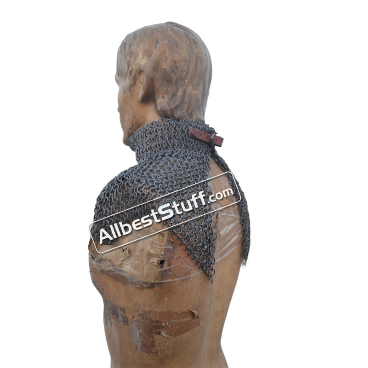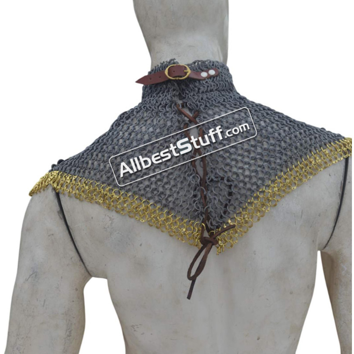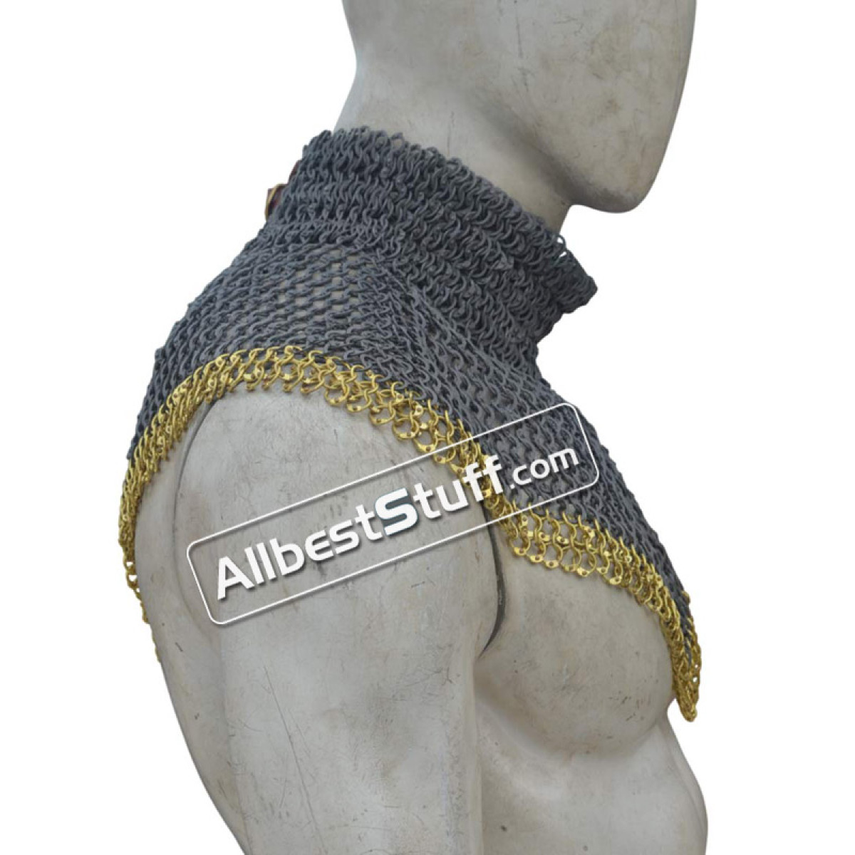 Medieval Stylish Chain Mail Collar with high neck. this piece still uses the same quality materials and finishing techniques to create a refined piece of armor. All of the mail rings on this standard are made from Aluminum, We have used the standard mail ring pattern of 4:1 for the largest part of the collar, maille standards would have a tighter weave around the actual neck part, we’ve used a 6:1 weave on the neck, which looks excellent and provides a bit of extra protection due to the denser pattern of rings.