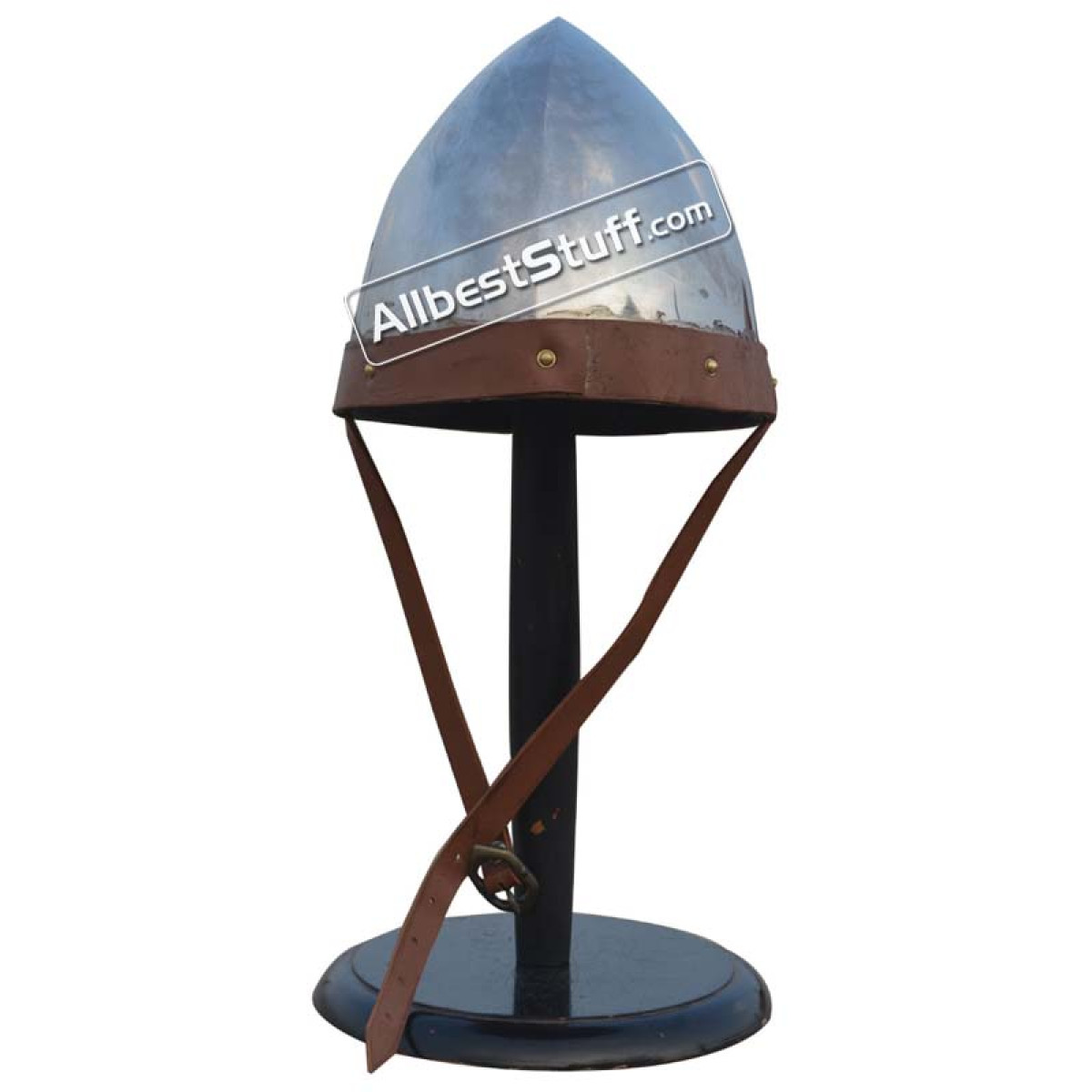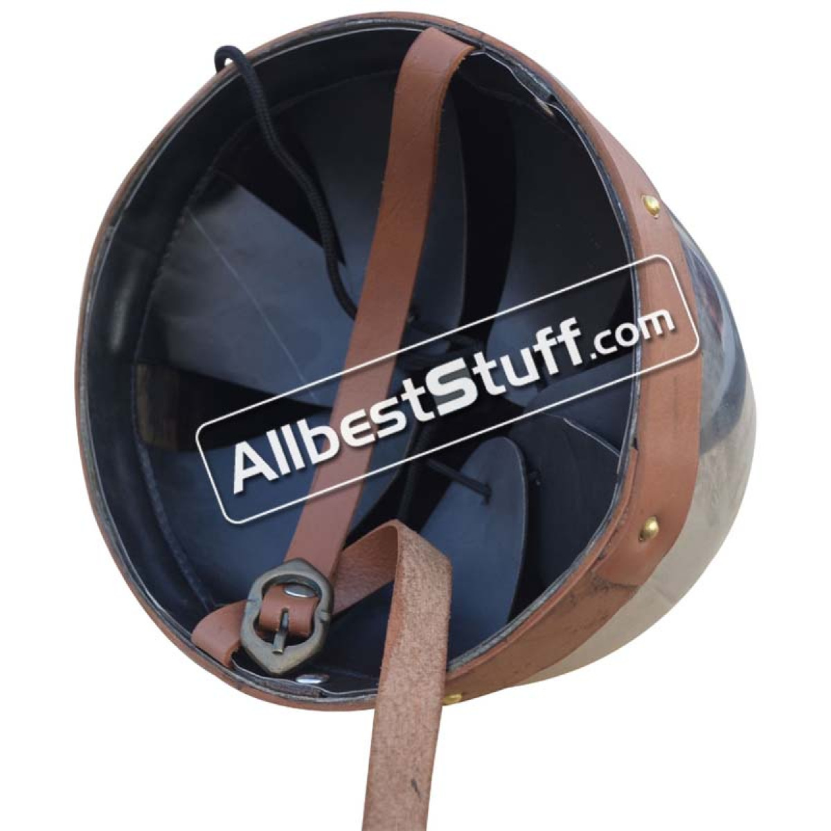 This Archers Domed helmet has no nasal and this is made of 16 Gauge steel. A medieval archers domed helmet is a type of head wear that was worn by archers in medieval Europe. It was designed to protect the head from injury during combat or training, and was often made from a combination of metal and leather.The domed helmet was a popular style of helmet in the medieval period, and was worn by a variety of different types of soldiers, including archers. It typically had a round or oval shape, with a domed top and a wide brim that extended down the sides of the head to protect the ears and neck. Some versions also had a visor or face plate to protect the eyes and nose.Medieval archers wore their domed helmets with other types of armor, such as a breastplate and gauntlets, to protect the rest of their body. The helmet was an important part of their protective gear, as archers were often targeted by enemies on the battlefield due to their strategic importance.