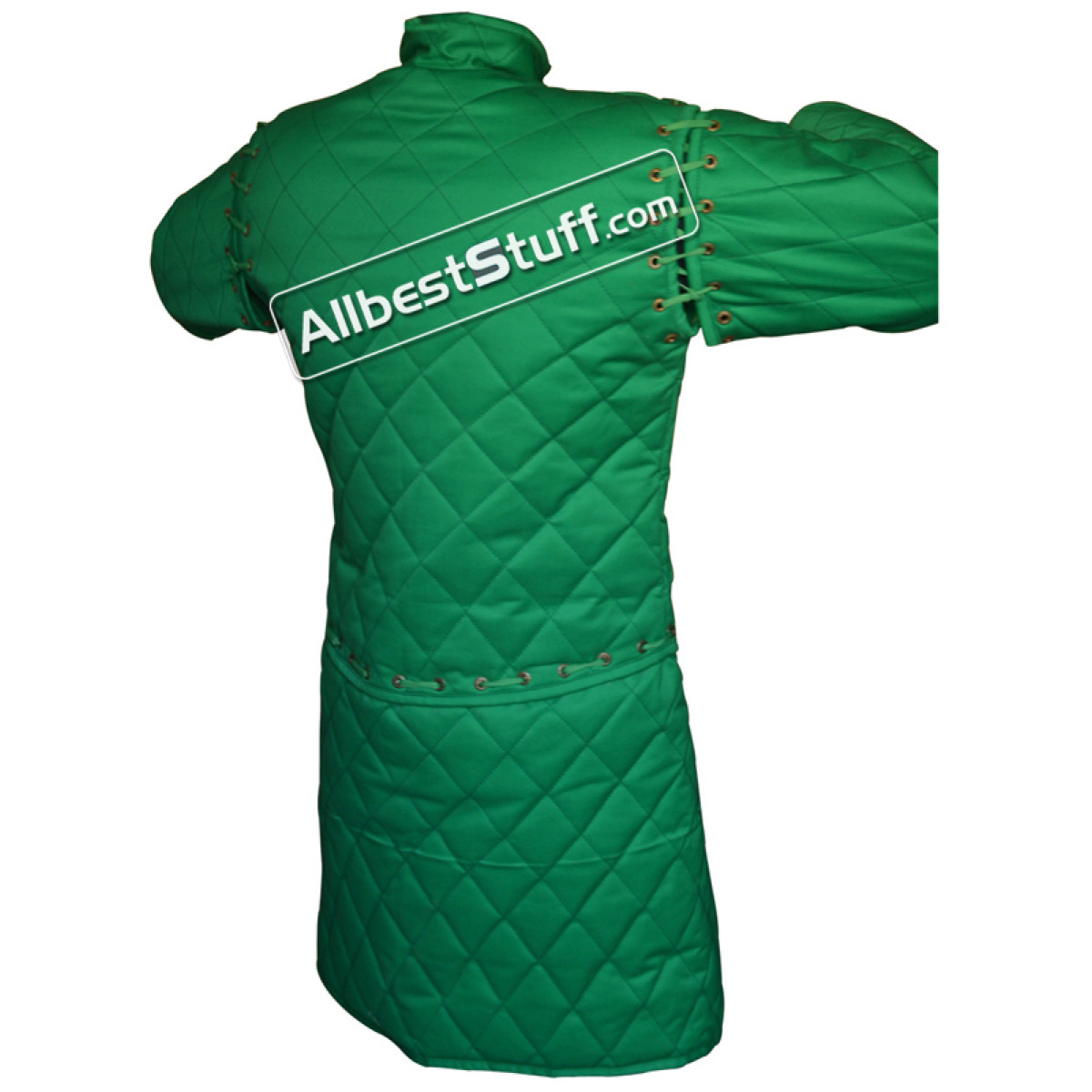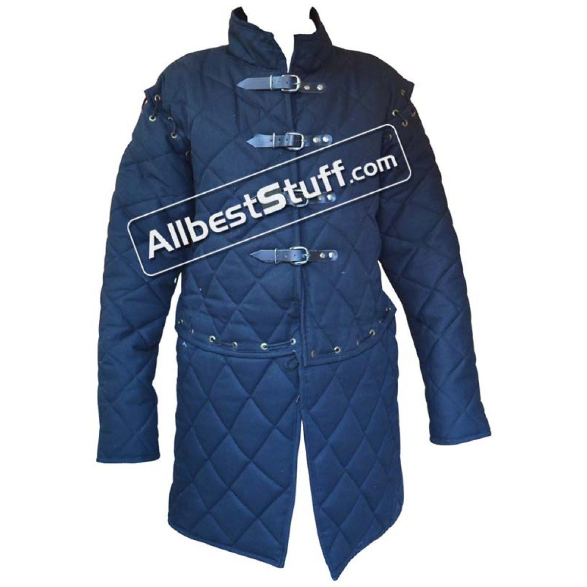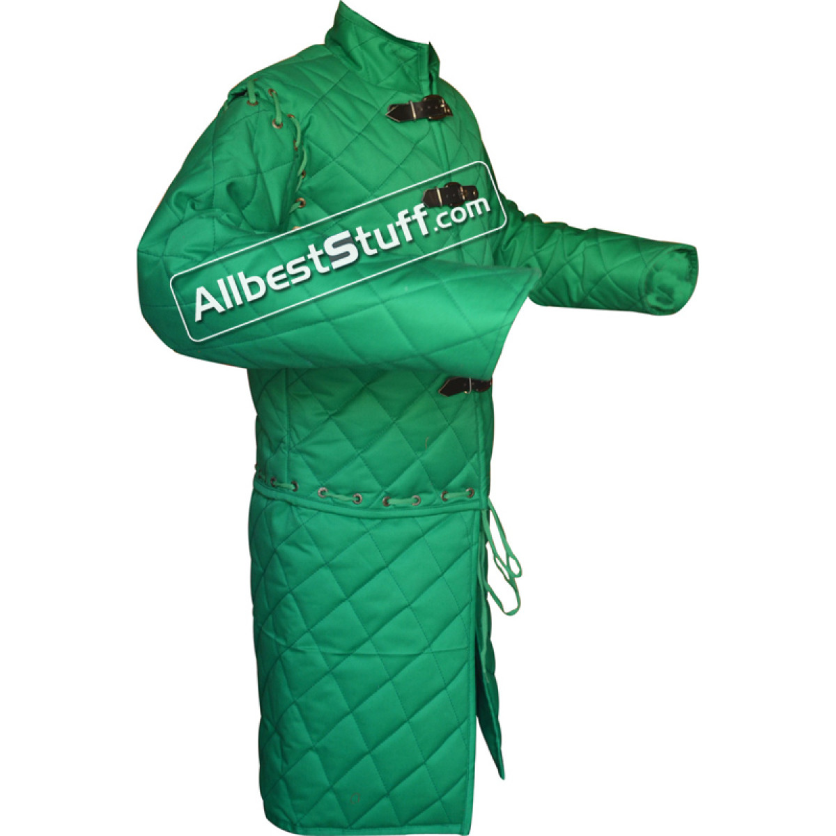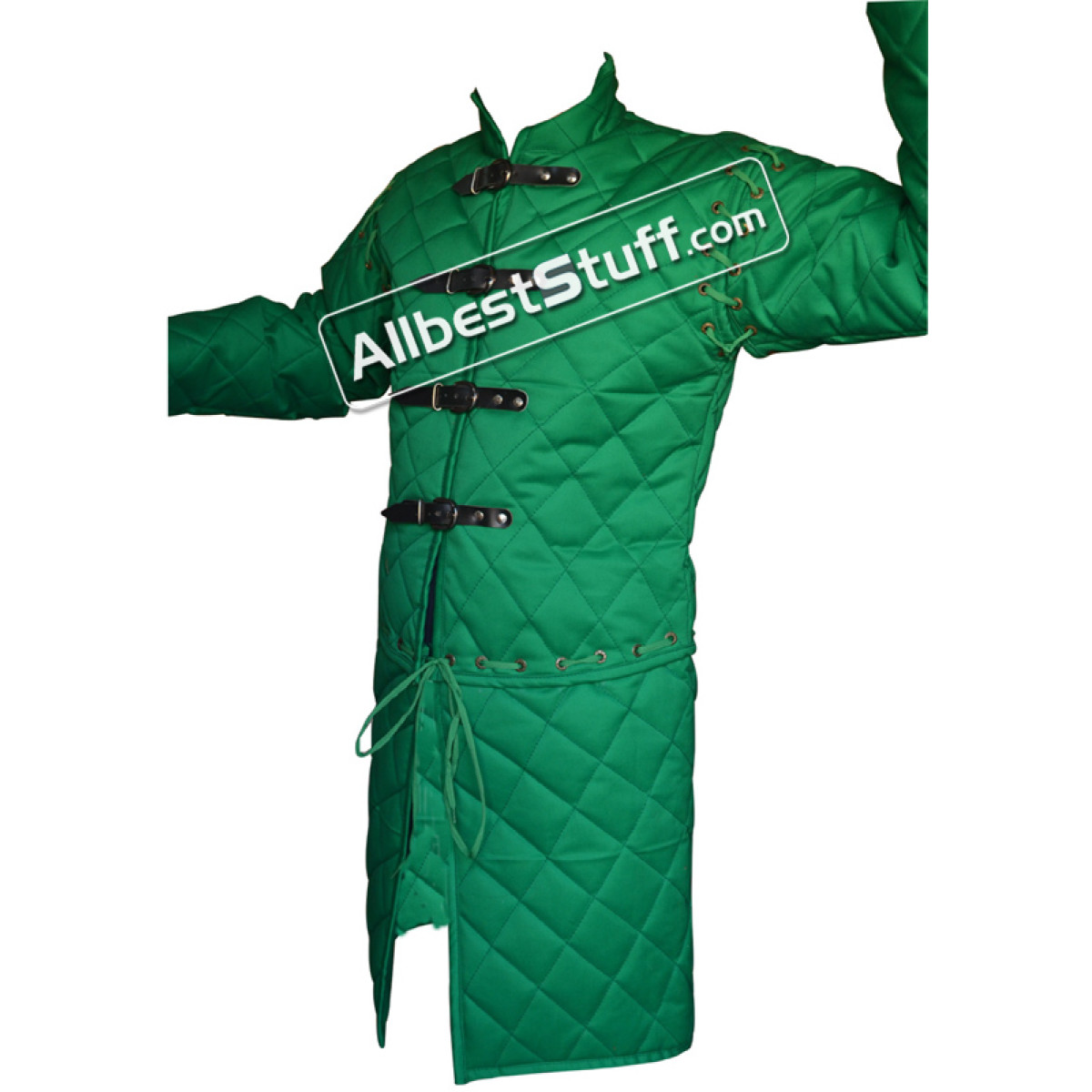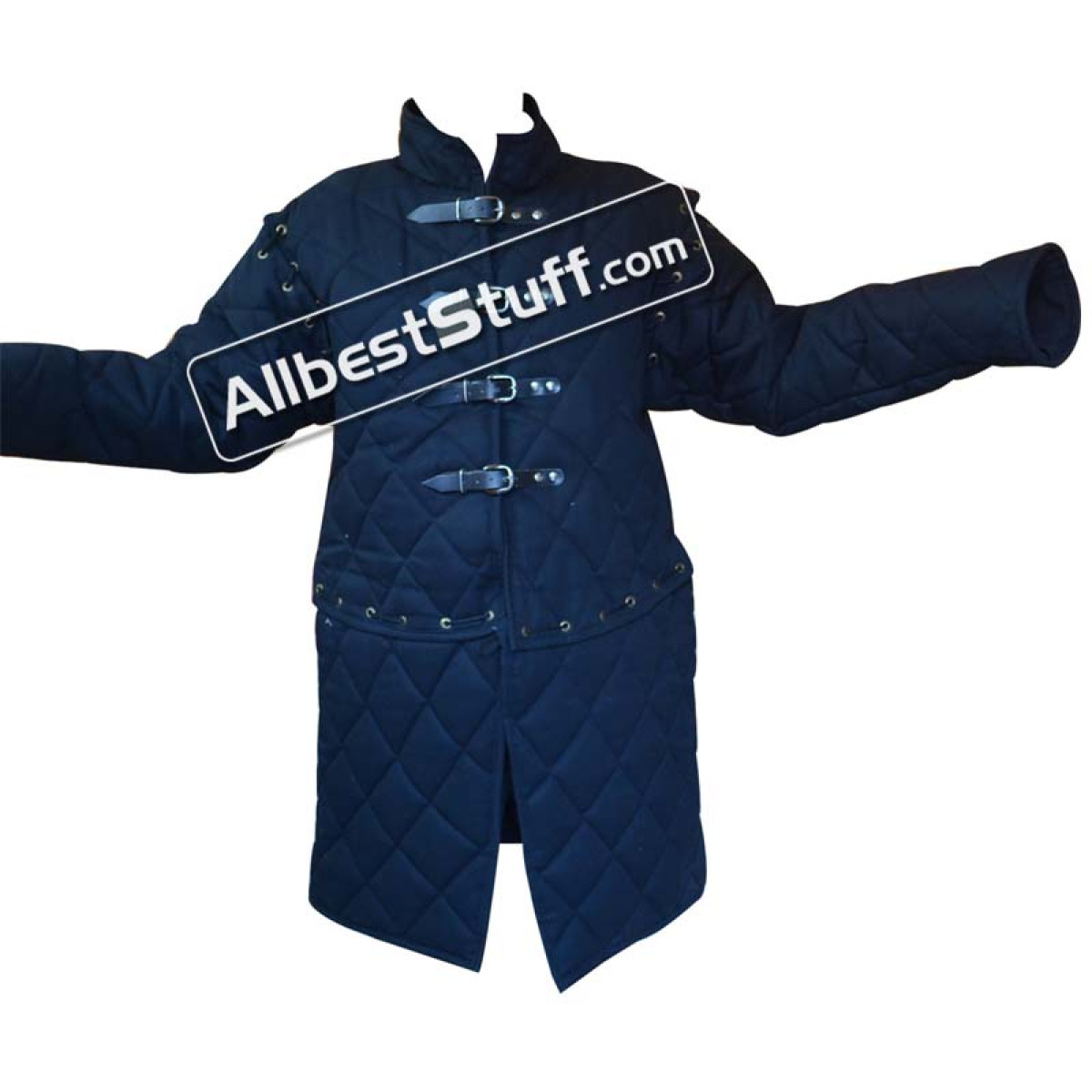 Medieval Arthur Full Sleeve Padded Gambeson made from High Quality thick Cotton, Leather & Solid Brass Buckles for closing and comfort wear. the padded armor includes a gambeson, tassets, and sleeves in a versatile set that can be worn in different combinations. The padded gambeson can be worn under any kinds of armor. The tall collar increases comfort around the neck, as well. The Armor padding is stitched in a pattern that allows mobility and keeps the padding in place. Metal eyelets run along the edges of the arm holes and bottom helm of the sleeveless gambeson, allowing the addition or removal of sleeves as desired.