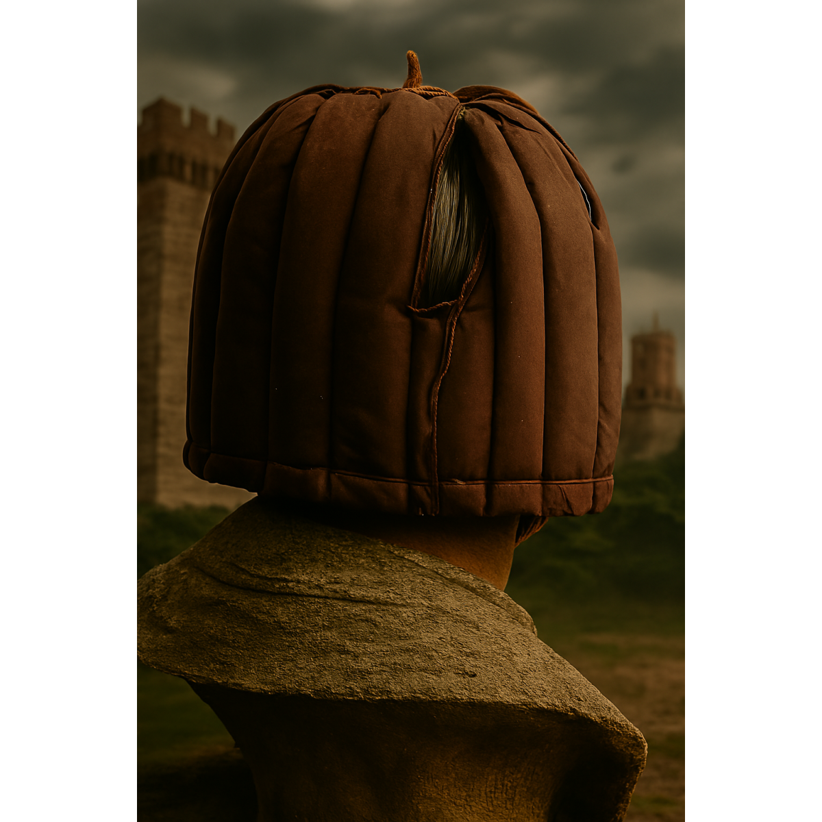 this authentic medieval padded coif, designed for warriors, reenactors, and collectors alike. Crafted from thick, quilted Cotton fabric, this arming cap offers both comfort and protection beneath helmets or chainmail. The segmented stitching and gathered top evoke historical accuracy, while the weathered texture and leather tie add a touch of battle-worn realism.