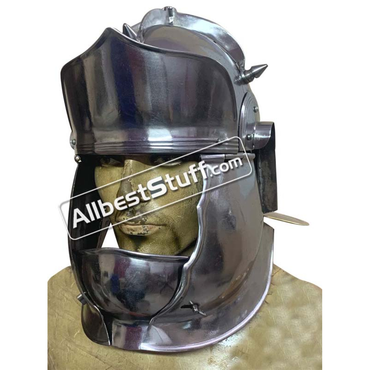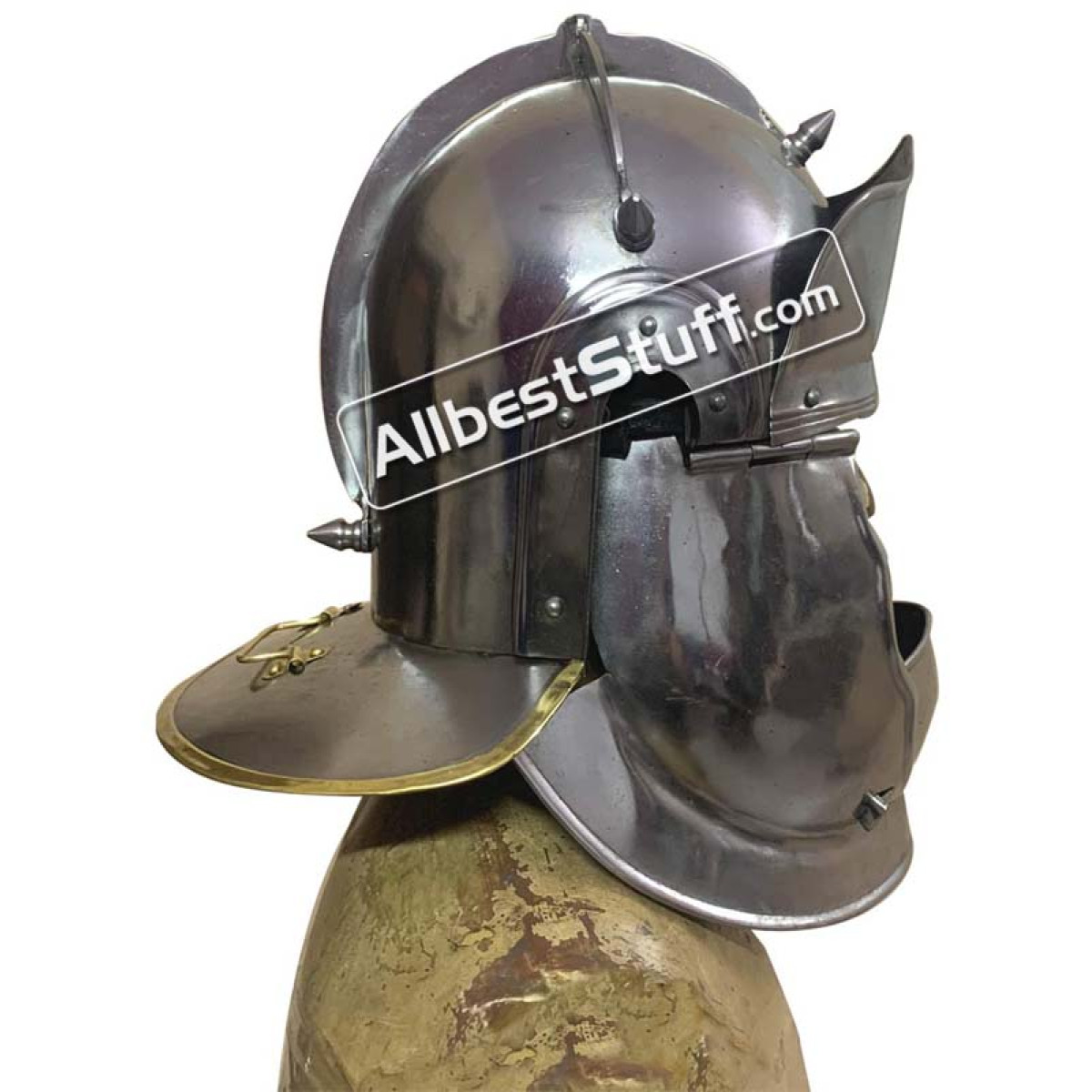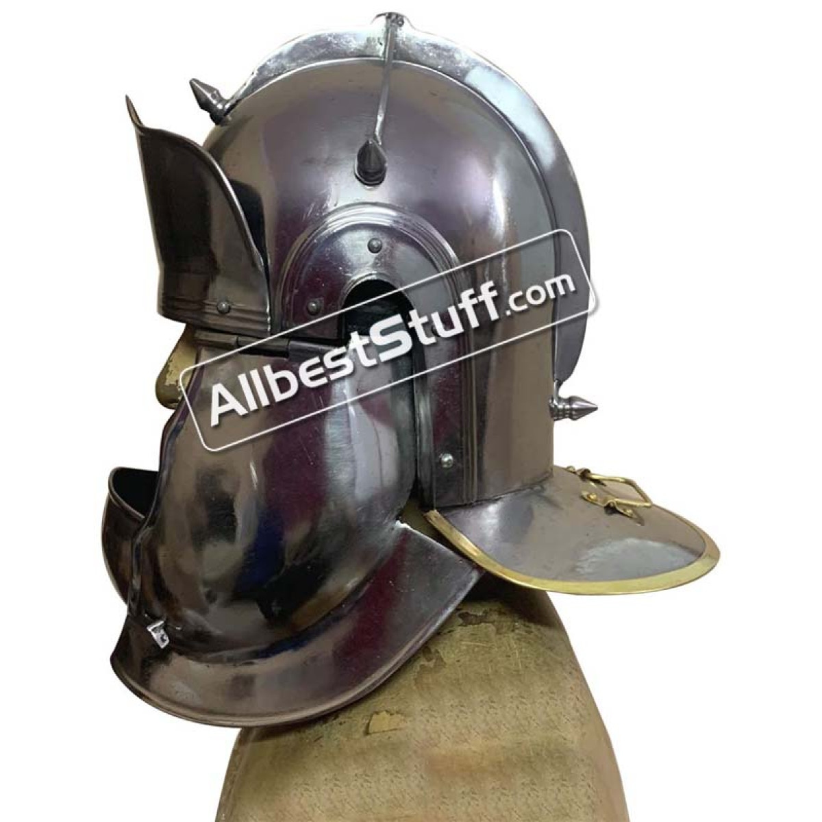Carbon steel is contoured to the authentic shape of the historical helmet This Roman Auxiliary Cavalry Helm is crafted from 20 gauge steel, the helmet is fitted with hinged cheek plates and an integrated plate which guards the lower face. A turn-pin lock locks the cheek plates and face guard into position. Inside the helmet you will appreciate the soft leather suspension liner for it's natural comfort. Leather chin straps are adjustable. Please note this is a light weight thin metal helmet and NOT suitable for combat or fighting although we recommend it for role play and other performance based events.