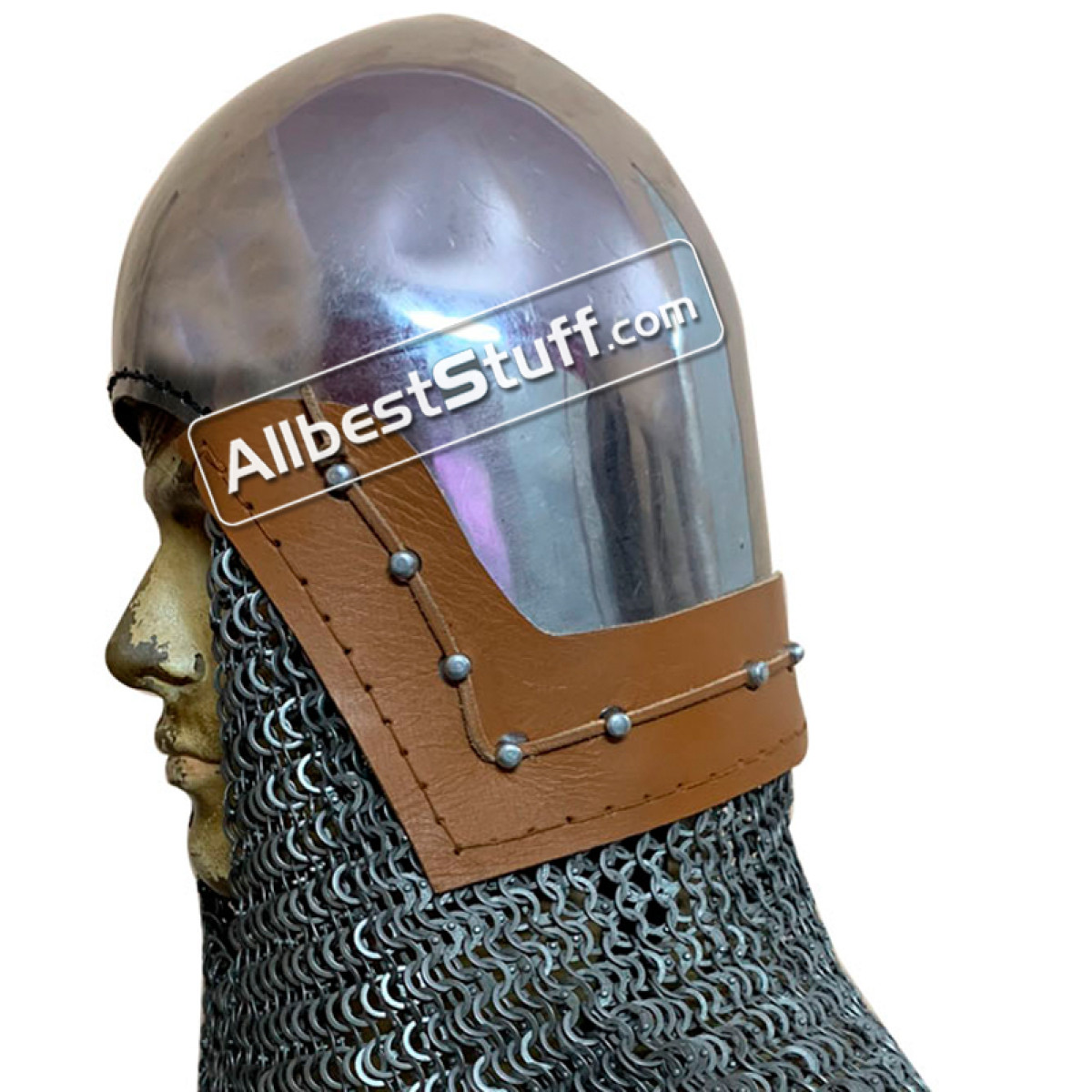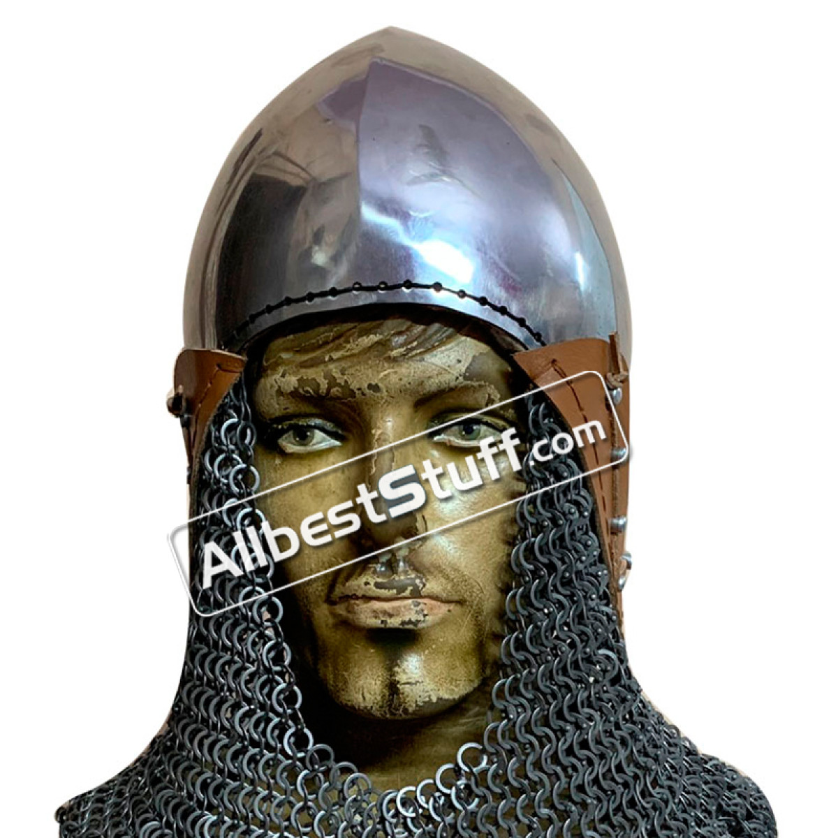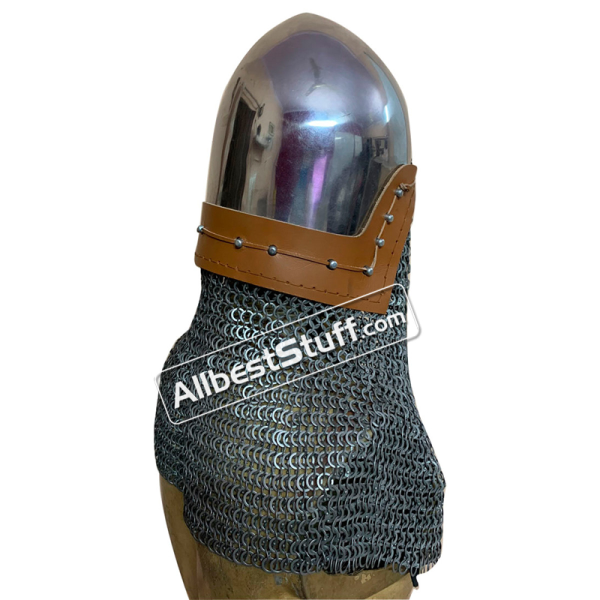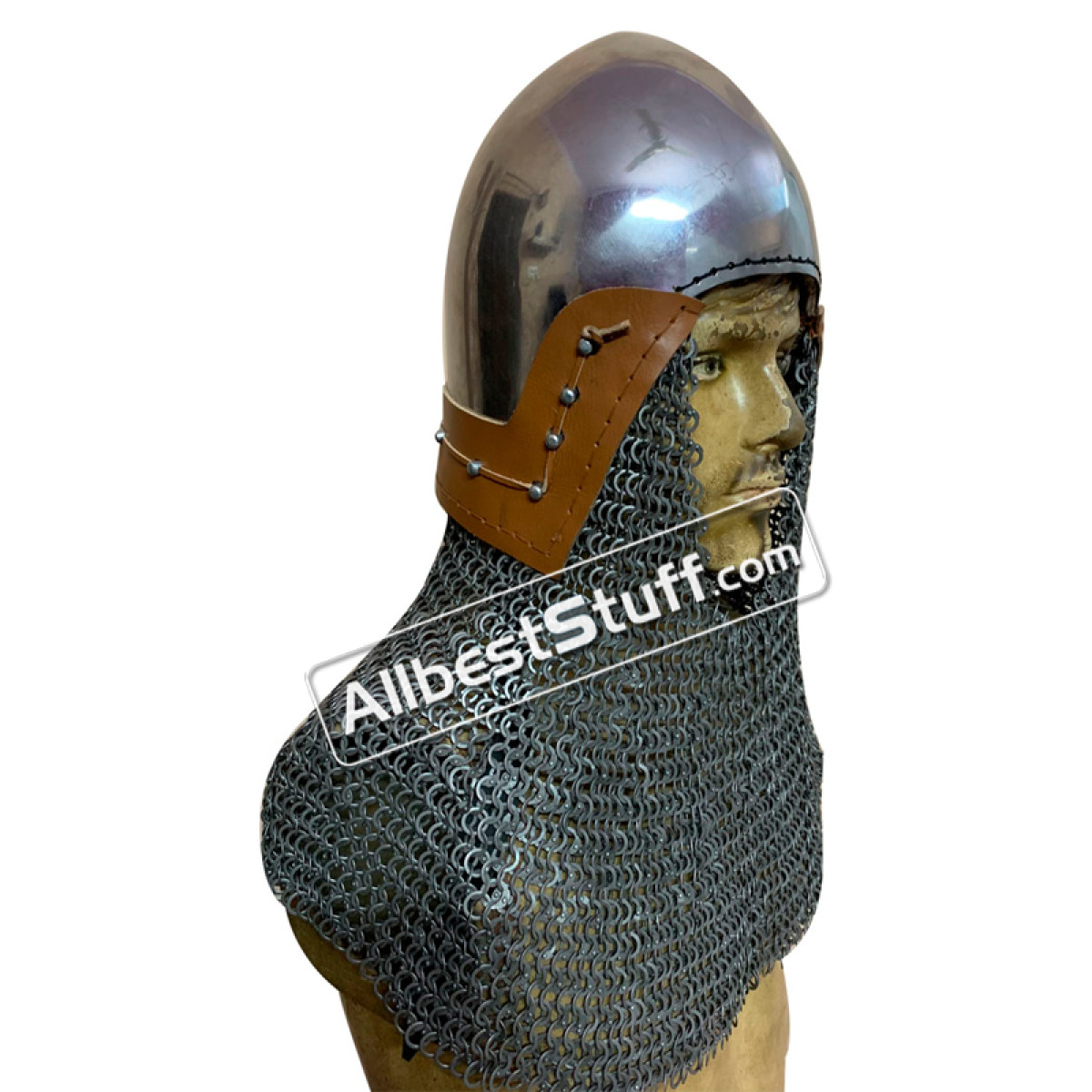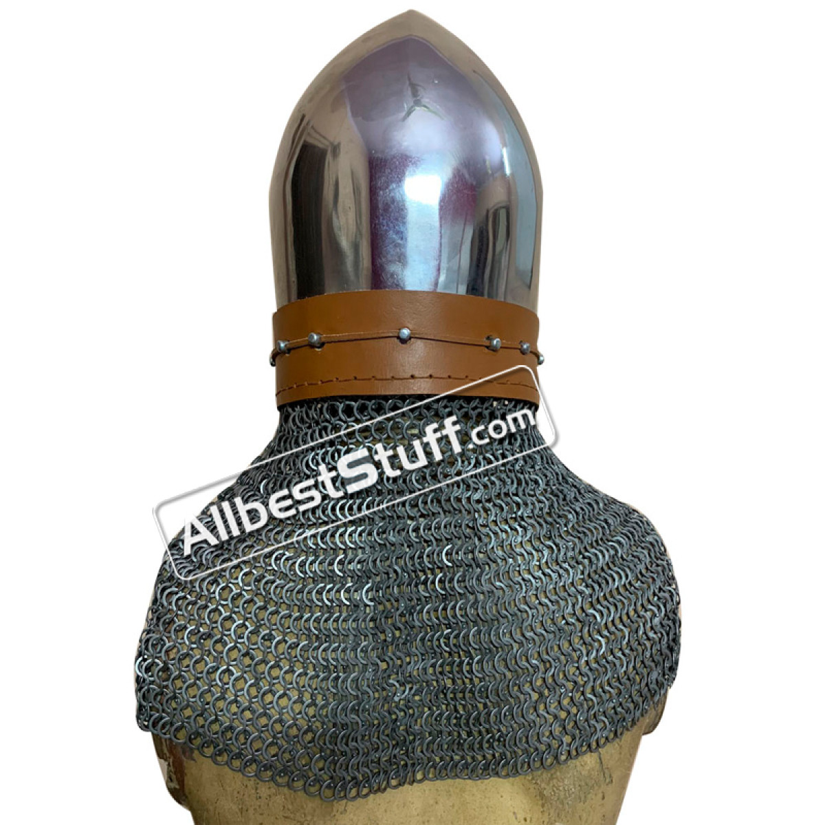 A development upon the bascinet helmet, the aventail was a flexible curtain of mail that covered the throat, neck and shoulders. Bascinet Helmet With Chainmail Aventail And Liner chin Strip, made in 14 Gauge Steel. The Bascinet helmet was developed in the early 14th century from the Secret helmet or “Cerveliere” and was popular right up to the 15th century. Standard Adult Size fully wearable.