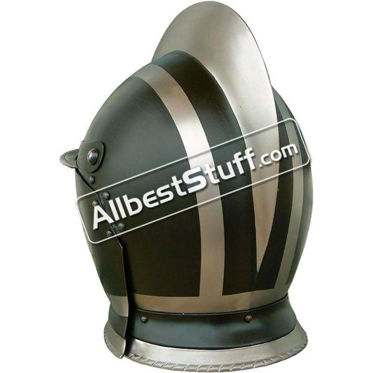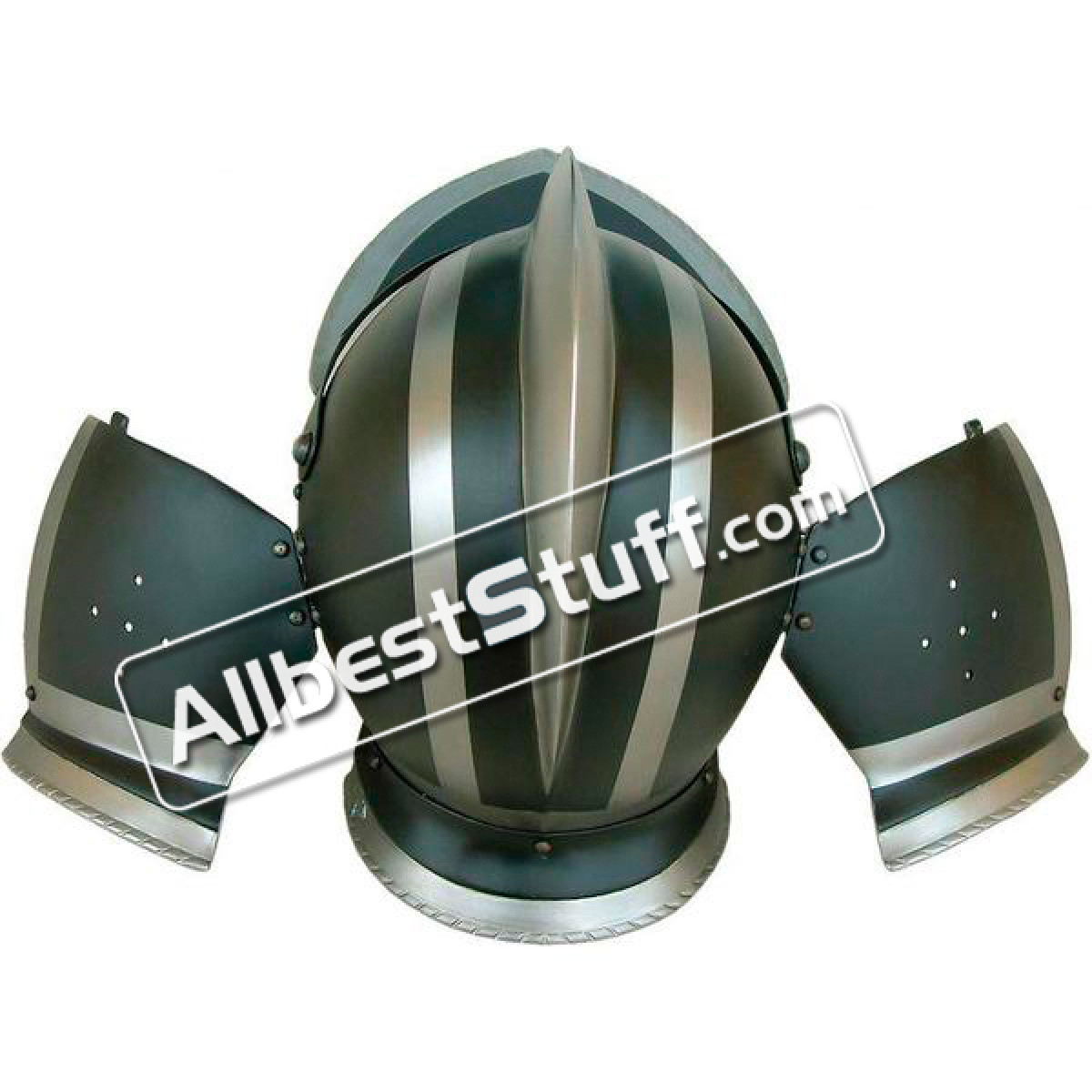 This burgonet is a direct development of the closed helmet or armet. The cheek flaps end in a narrow neck protection and it is provided with an extra edge at the visor for protection from blows in the face.This burgonet is moveable cheek flaps.