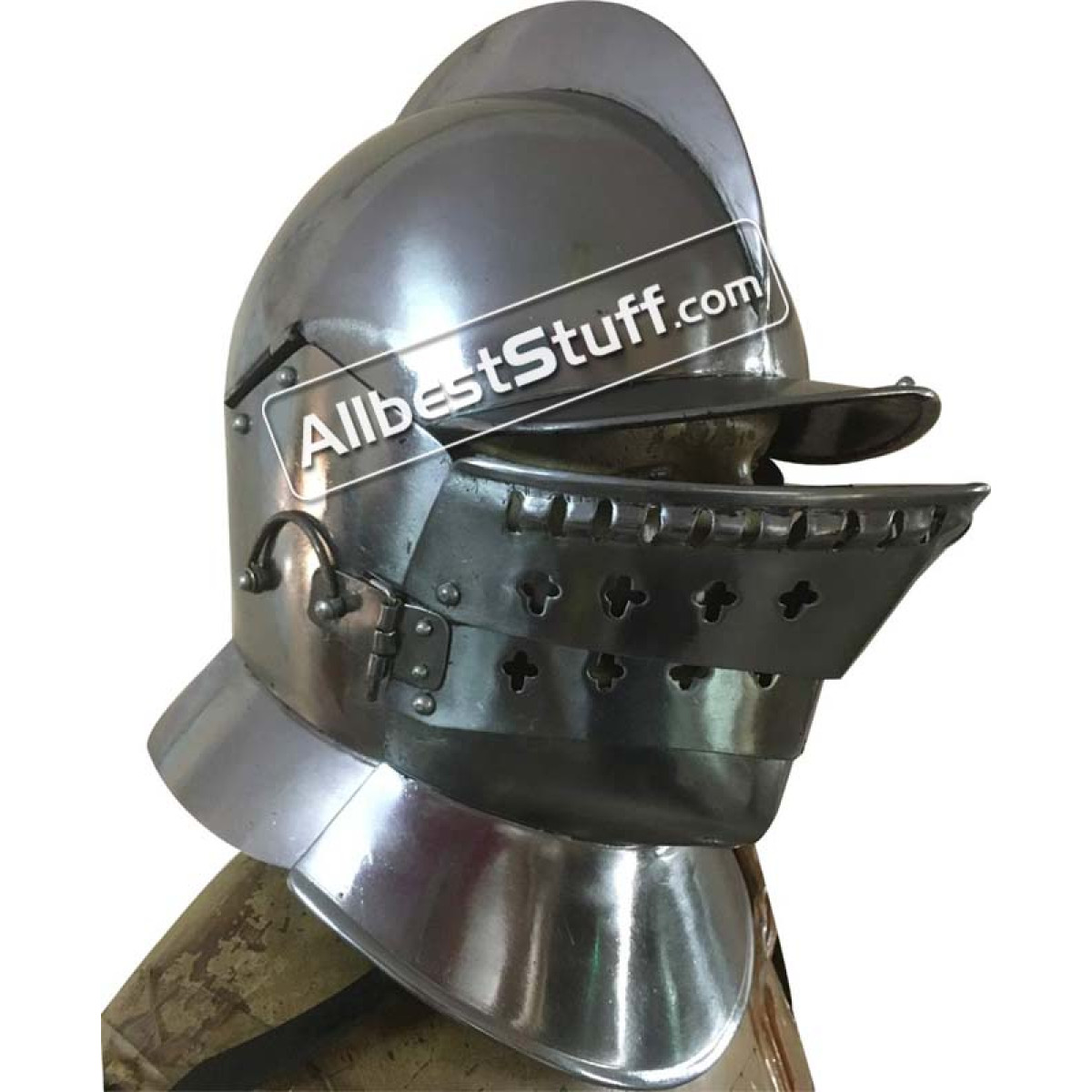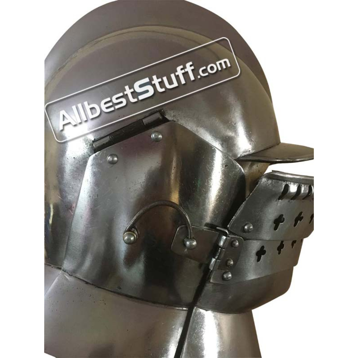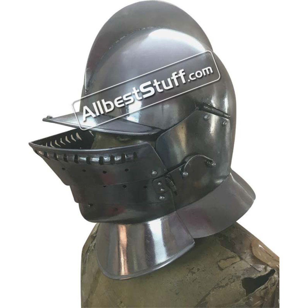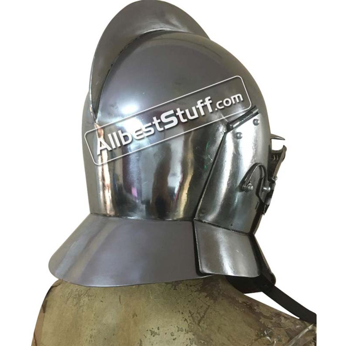 This burgonet is based on 16th century originals. This type of helmet was used until far in the 17th century. It offered optimal protection combined with a good field of view and had great advantages compared to its predecessors. This burgonet has a neck protection