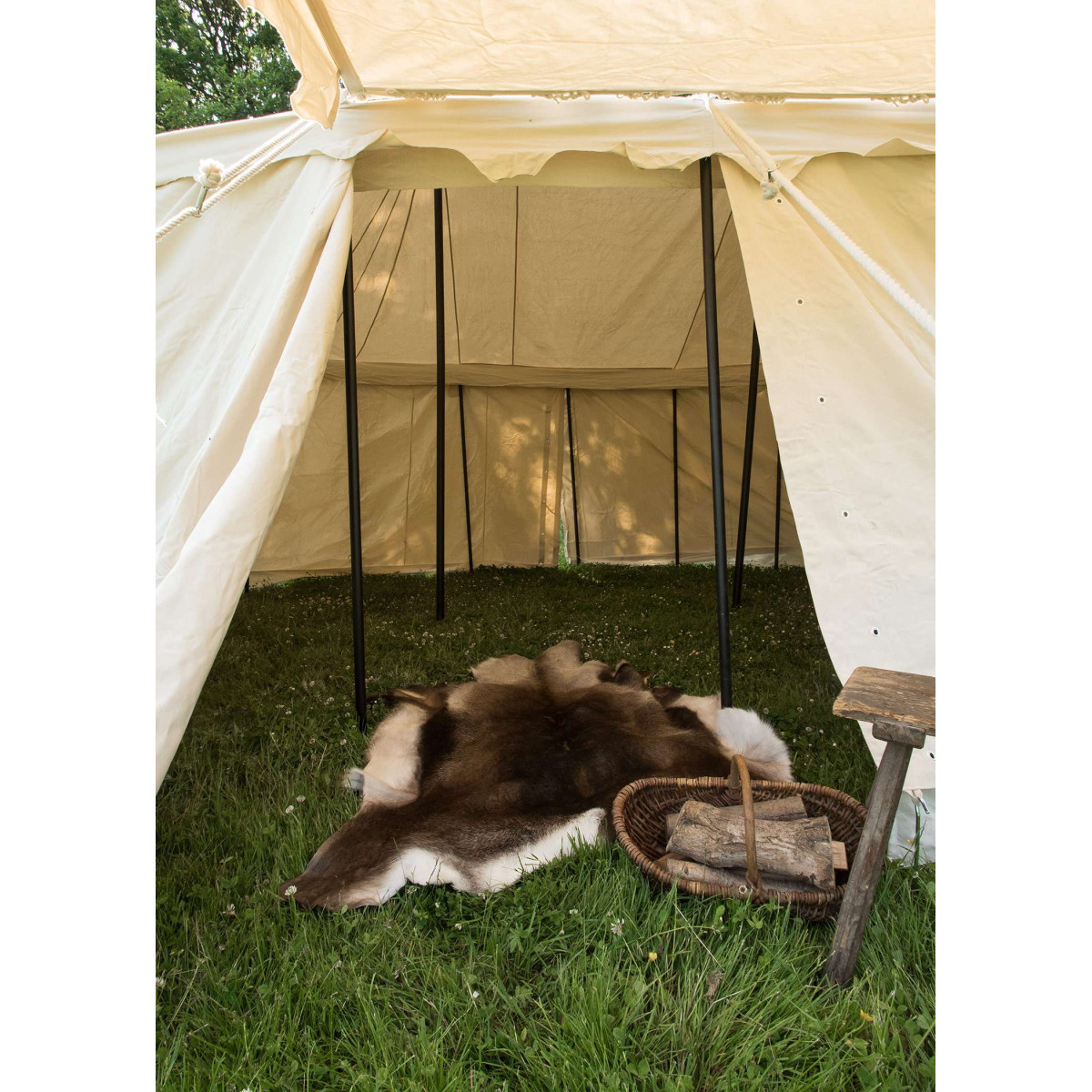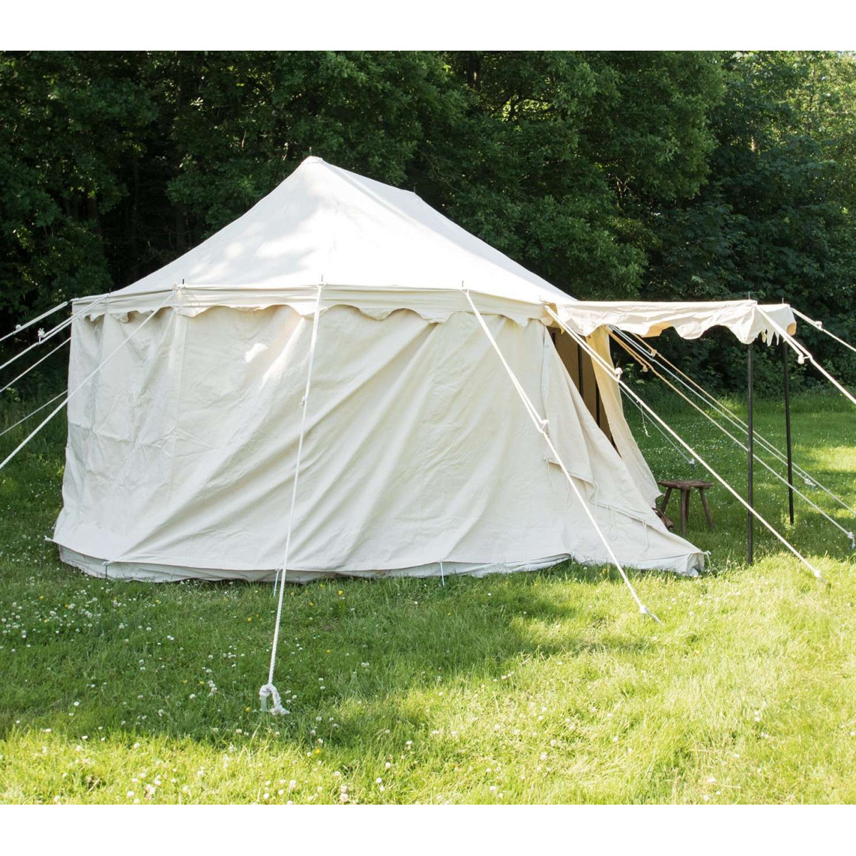 This Medieval Burgundian Tent is spacious, sturdy and functional, suitable for military camps, medieval markets or LARP events. The assembly of this tent can be easily done. Once the roof is up, just hang the two side walls using hooks and eyelets. A strip running all around the tent conceals and seals the junction between the roof and the walls. In this Medieval Burgundian Tent, the lower edge closes with a band that prevents dirt and dust from entering. The separate side wall simply needs to be connected to the roof by means of small hooks. The medieval tent can also be used as an awning by simply leaving the outer side. The awning offers good protection against sun and rain and is designed as a separate piece that can be assembled or disassembled according to your needs.