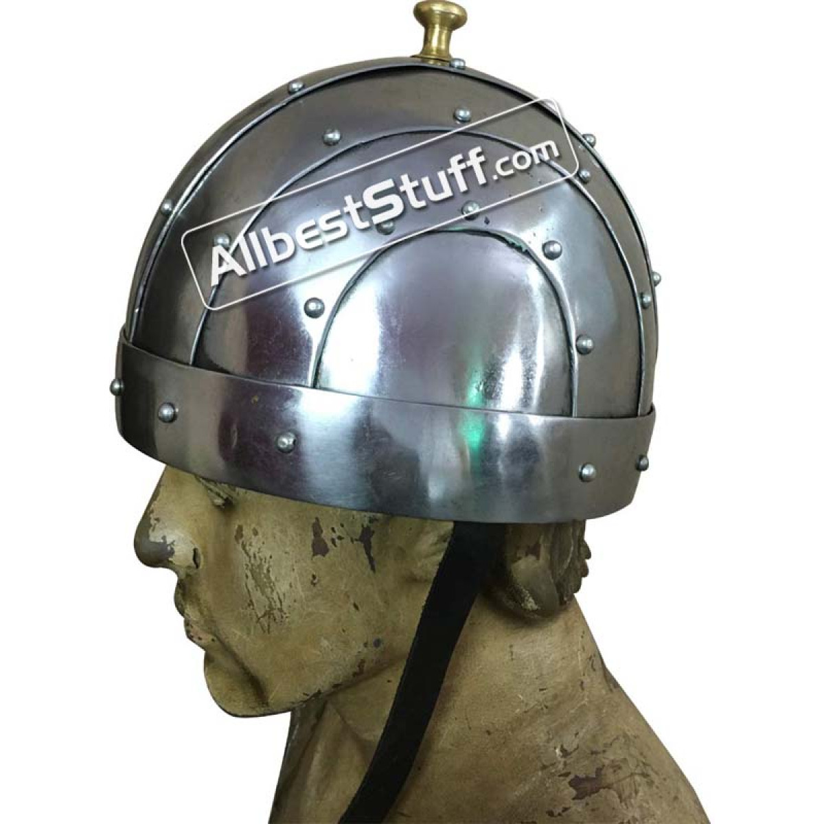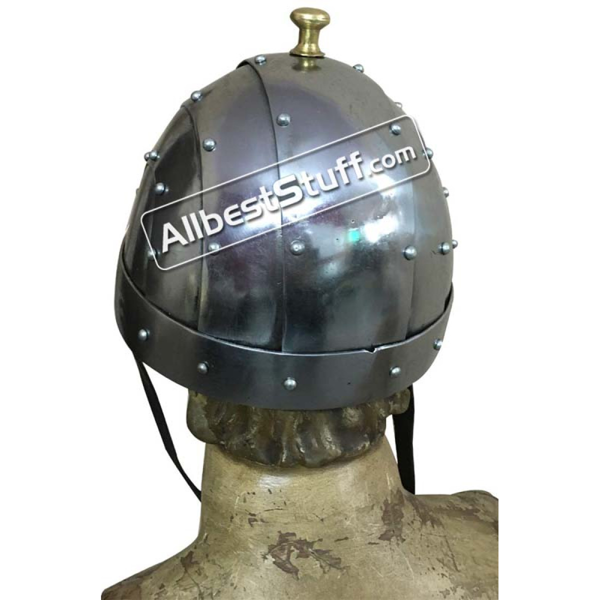 This helmet is made after a 10th century Byzantine helmet. The helmet development of the late Roman models with obvious Persian influences. The calotte is built from 7 riveted and concentrically welded clips. The helmet has a brass peak to attach hair or feathers. Use a heavy inner padding inside for protection. Standard Adult Size fully wearable.