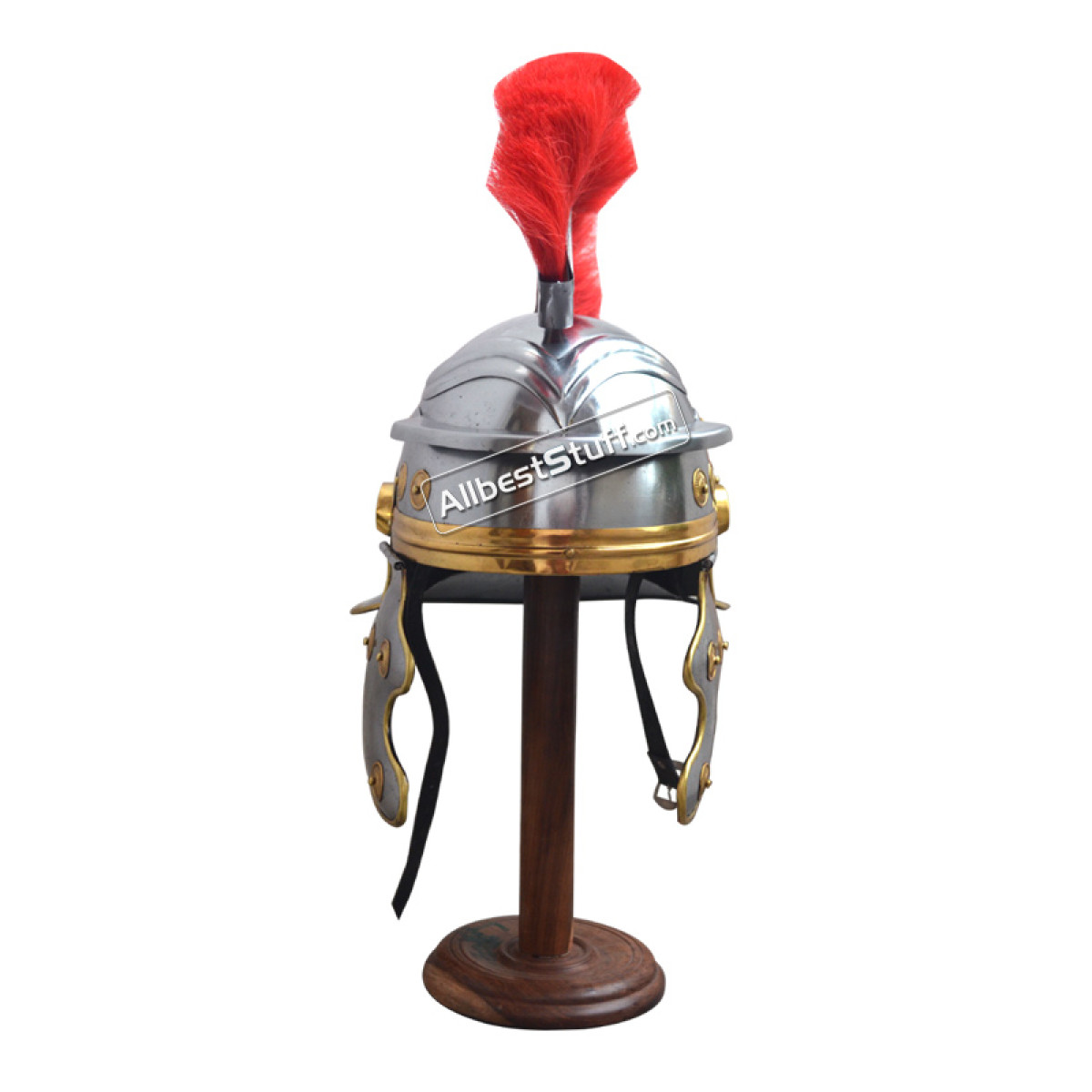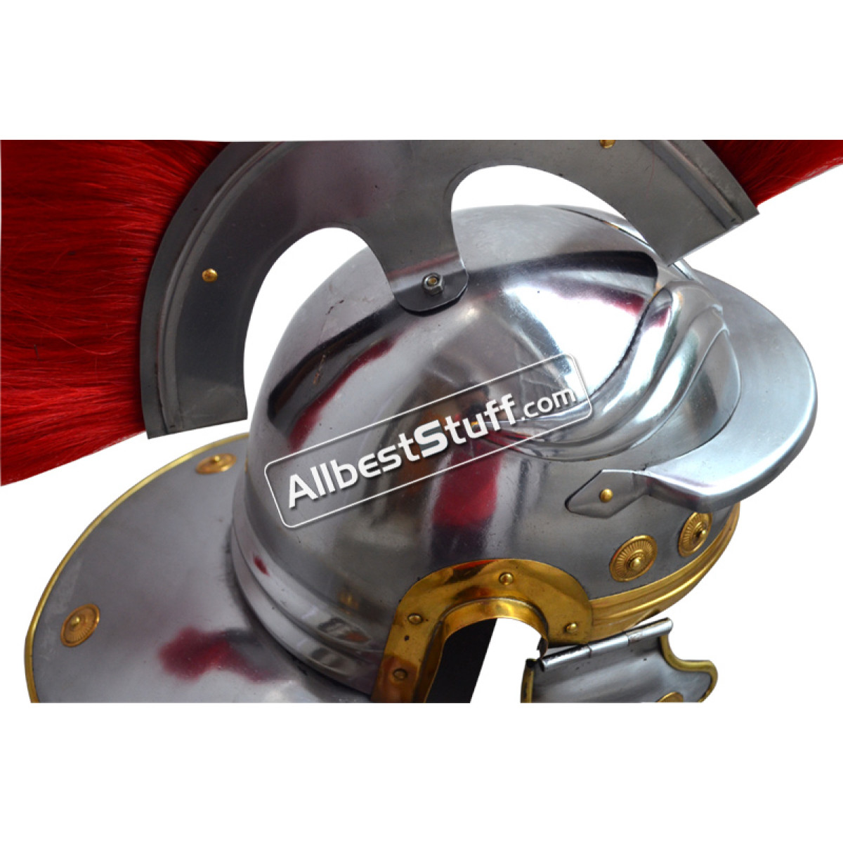 Carbon steel is contoured to the authentic shape of the historical helmet. Around the sides are brass decoration rivets to signify status. The bottom edge of the Roman Imperial Centurion Helmet is trimmed with brass all the way around. At the back is a carbon steel neck shield designed to fit over a gorget. Each side of the face is further protected with a hinged shielding. Inside the helmet you will appreciate the soft leather suspension liner for it's natural comfort. Leather chin straps are adjustable