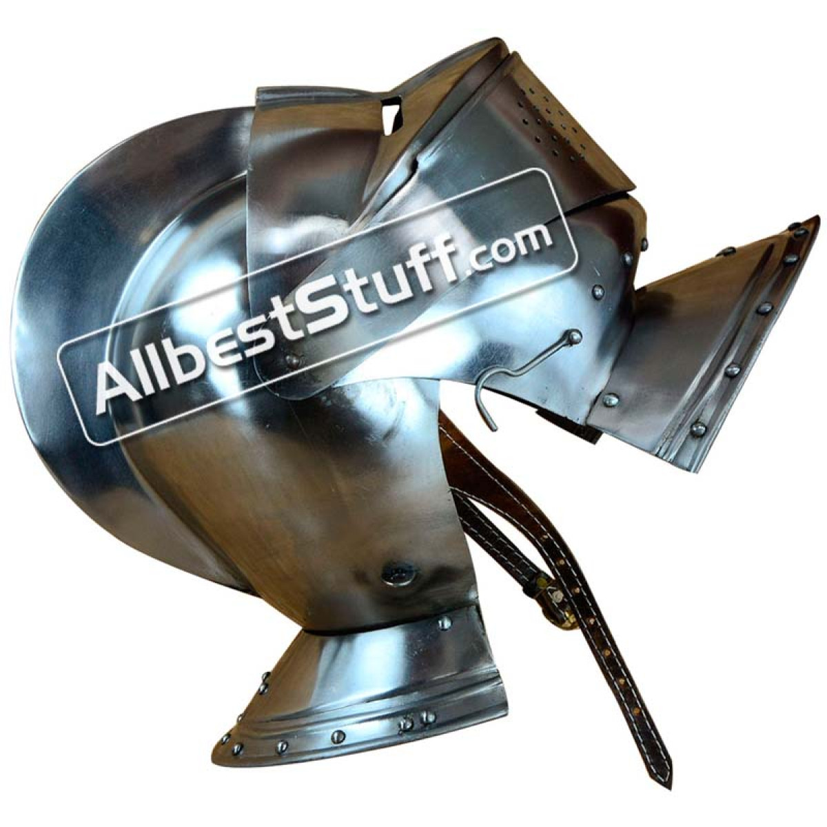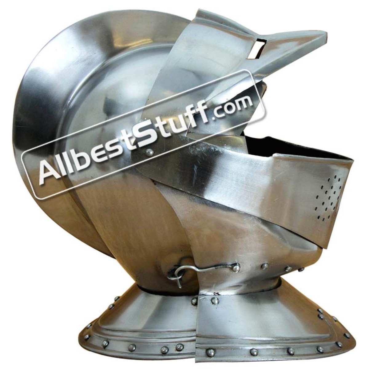 This Closed Helmet Made of 16 Gauge Steel. The two-part visor of the helm is hinged and can swivel upwards, additionally, the wearer has the option to raise only the top half of the visor, leaving the bottom half in place to protect the bottom half of the face. Being a close helm, the entire front half of the helm is hinged to allow to helm to be fitted around the head. The helm is secured closed with a hook. Standard Adult Size fully wearable.