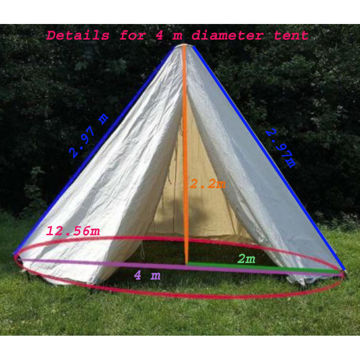 Details for 3 m diameter tent:Size: approx 3 m in diameterCentral height: approx. 2.20 mfloor area: 7 m²Weight: approx. 8 kgFabric: 400 g/m²Natural colorDetails for 4 m diameter tent:Size: approx 4 m in diameterCentral height: approx. 2.20 mfloor area: 12.5 m²Weight: approx. 12 kgFabric: 400 g/m²Natural color
