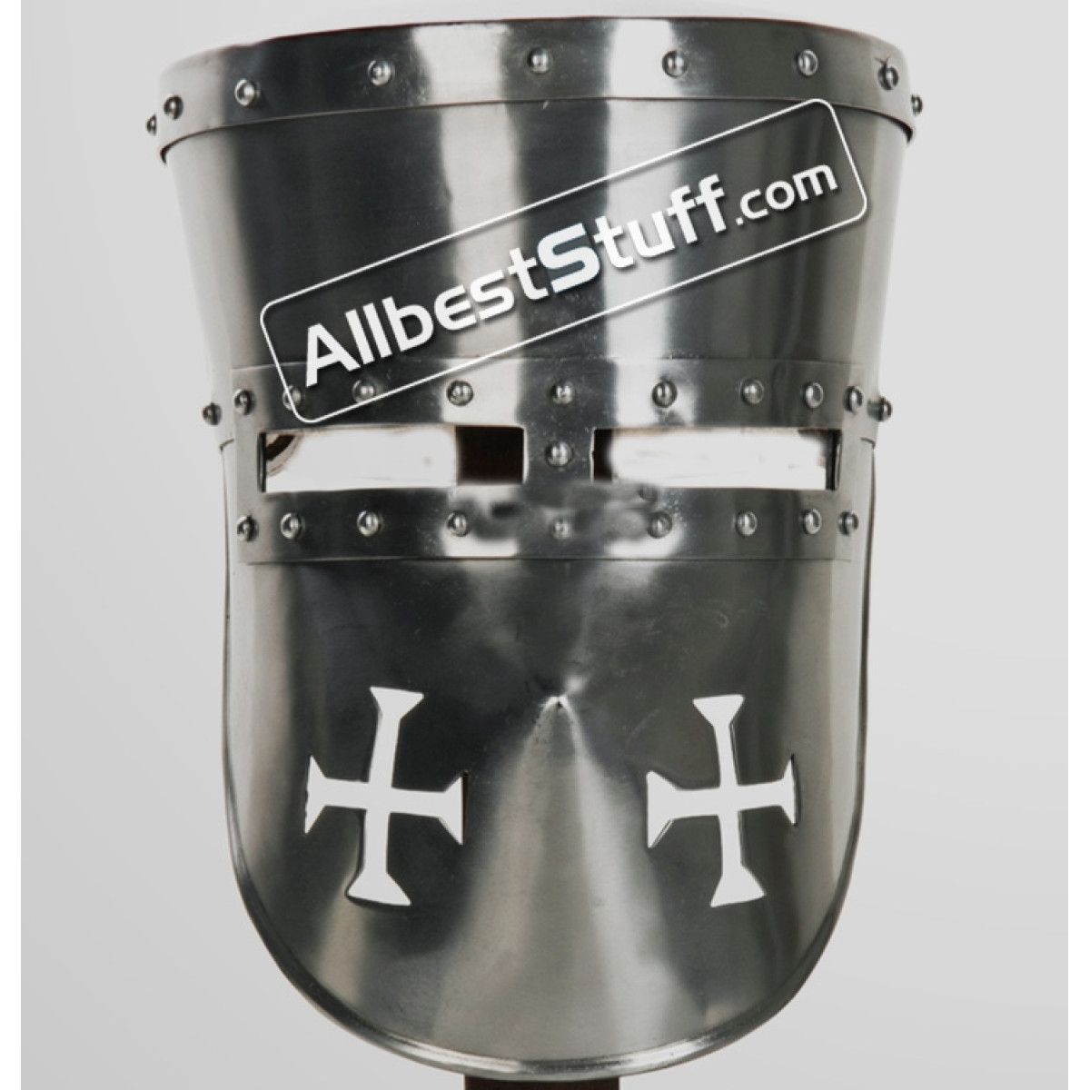This Helmet Crusader Knights Templar Basket Great Helm Functional SCA LARP. This helmet is made of 14 gauge carbon steel and is a classic pattern of great helm style helmets. The front features reinforced eye slits and two Templar cross cutouts along the bottom. Use a heavy inner padding inside for protection. Standard Adult Size fully wearable.