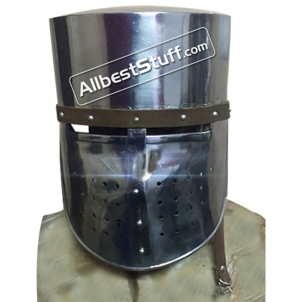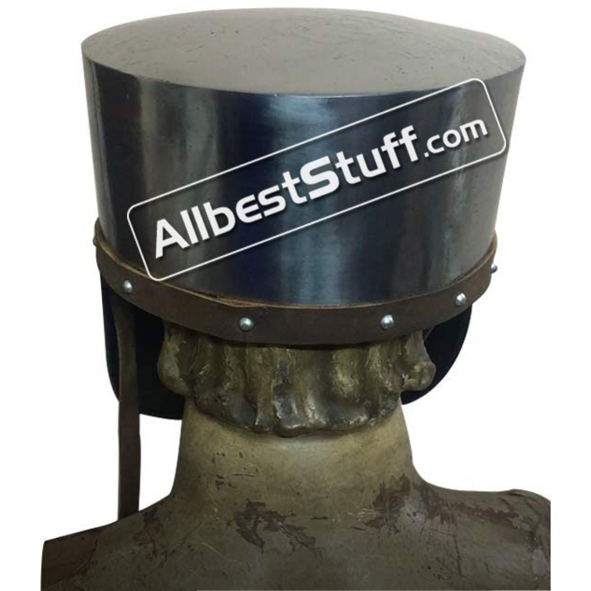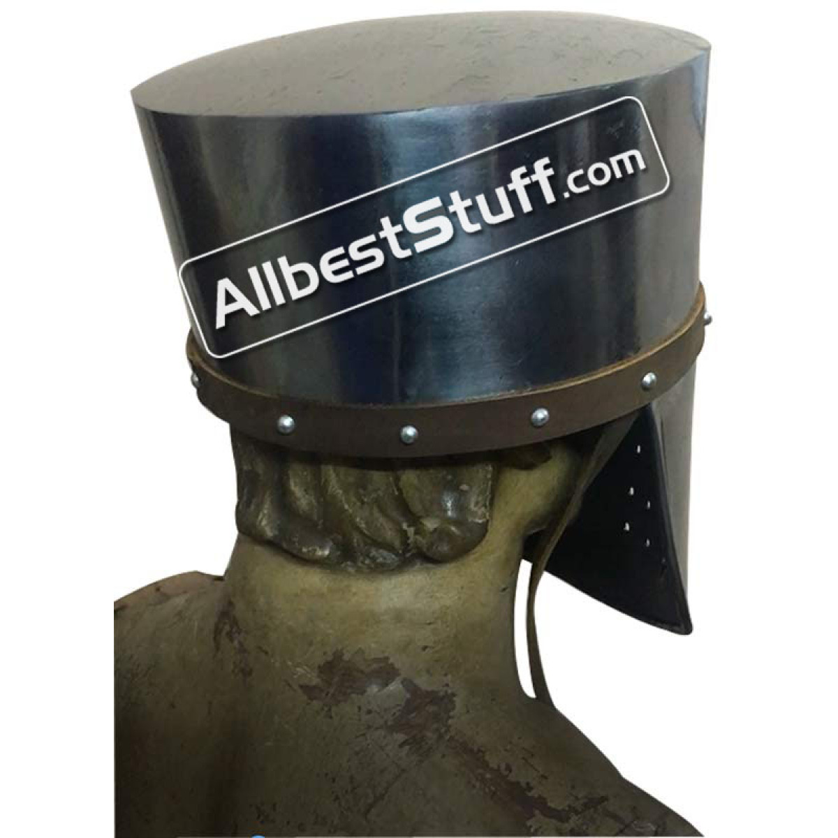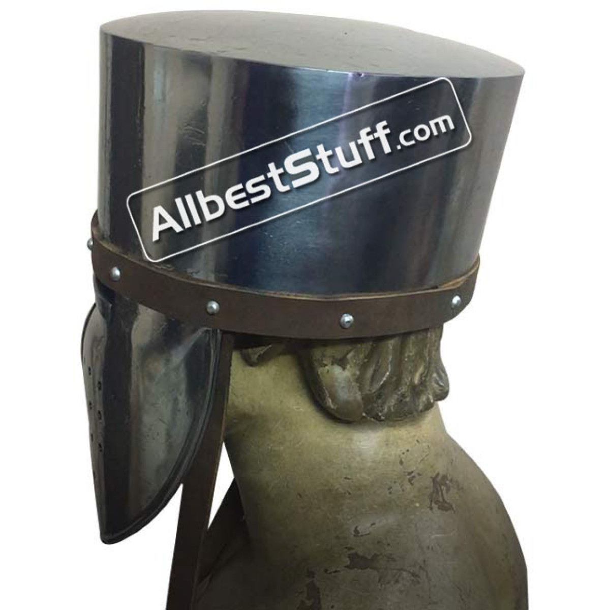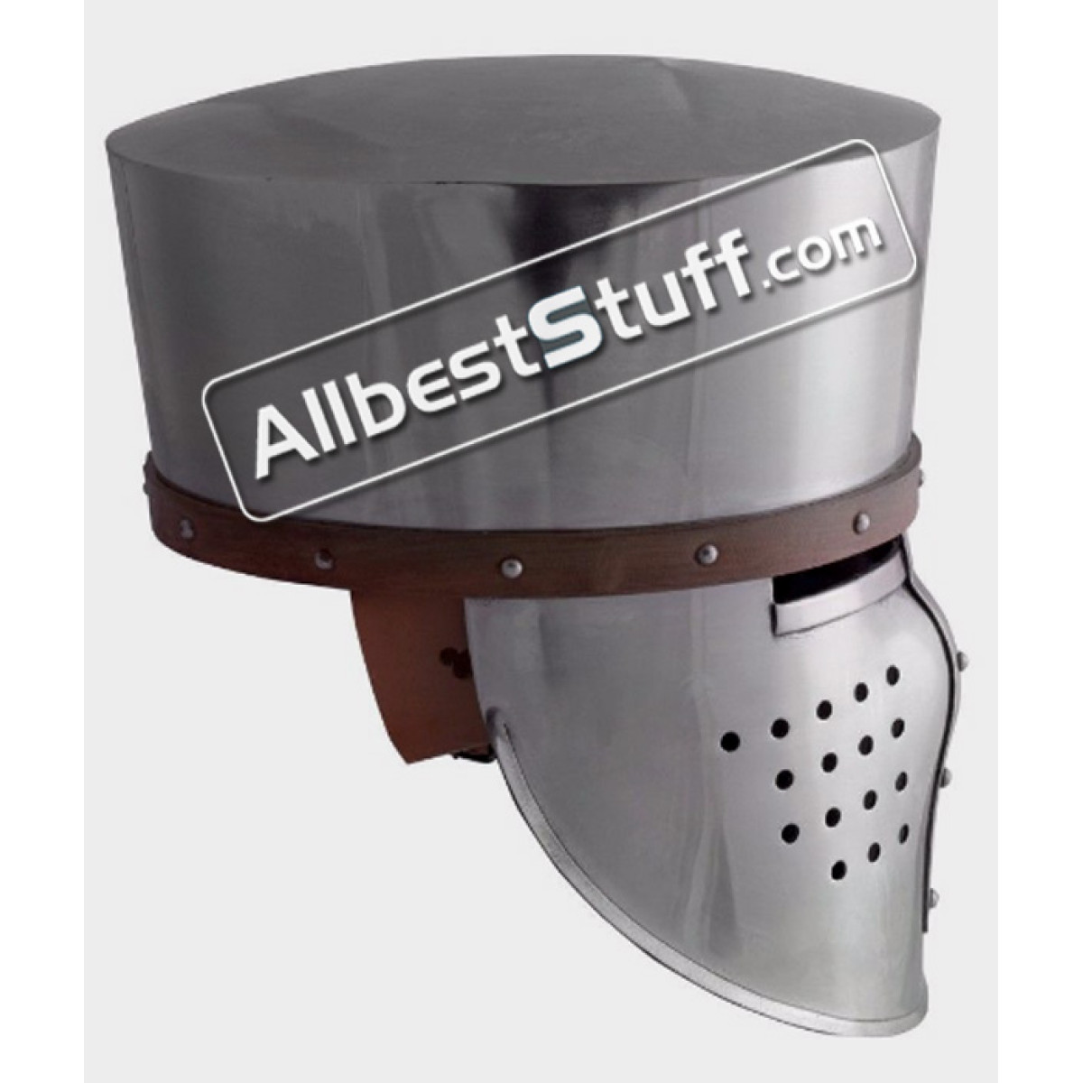 This Helmet reconstruction of a crusader Pot Helm from ca. 1180 a.d., also called bucket helm and barrel helm. The Crusader Pot Helm includes a comfortable leather liner with chin strap and buckle. Use a heavy inner padding inside for protection. Standard Adult Size fully wearable.