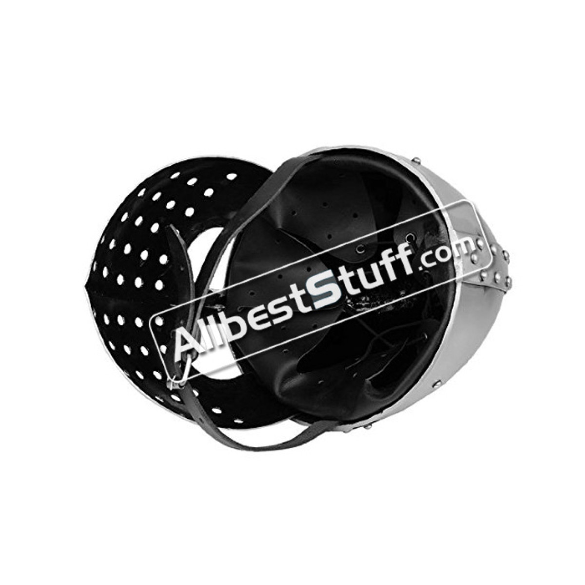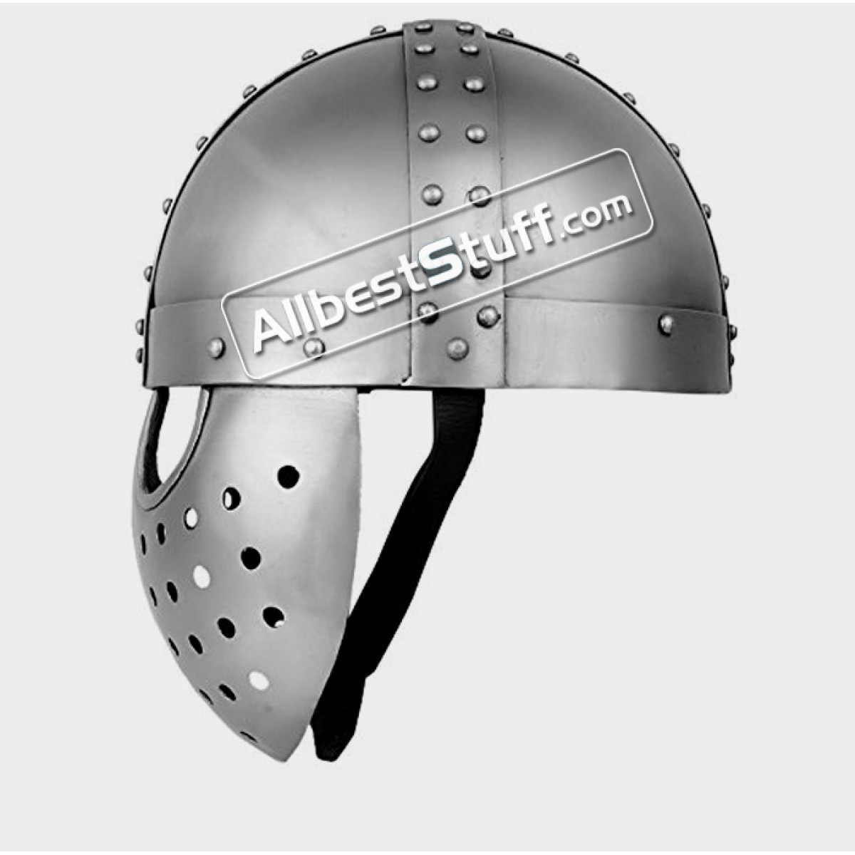 the fully battle-ready reconstruction of a Crusader Helmet with Face Plate was worn by Crusaders during the 12th Century, often with a chain coif. This Crusader Helmet with Face Plate consisting of a calotte with crossed clips, is extremely robust. The large, curved face-plate offers additional protection. The eye openings allow a relatively good field of vision. Use a heavy inner padding inside for protection. Standard Adult Size fully wearable.