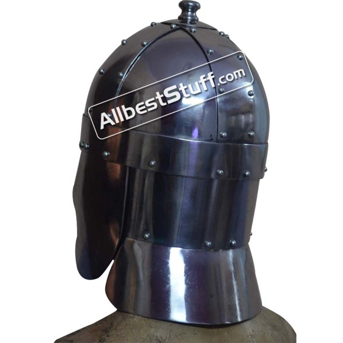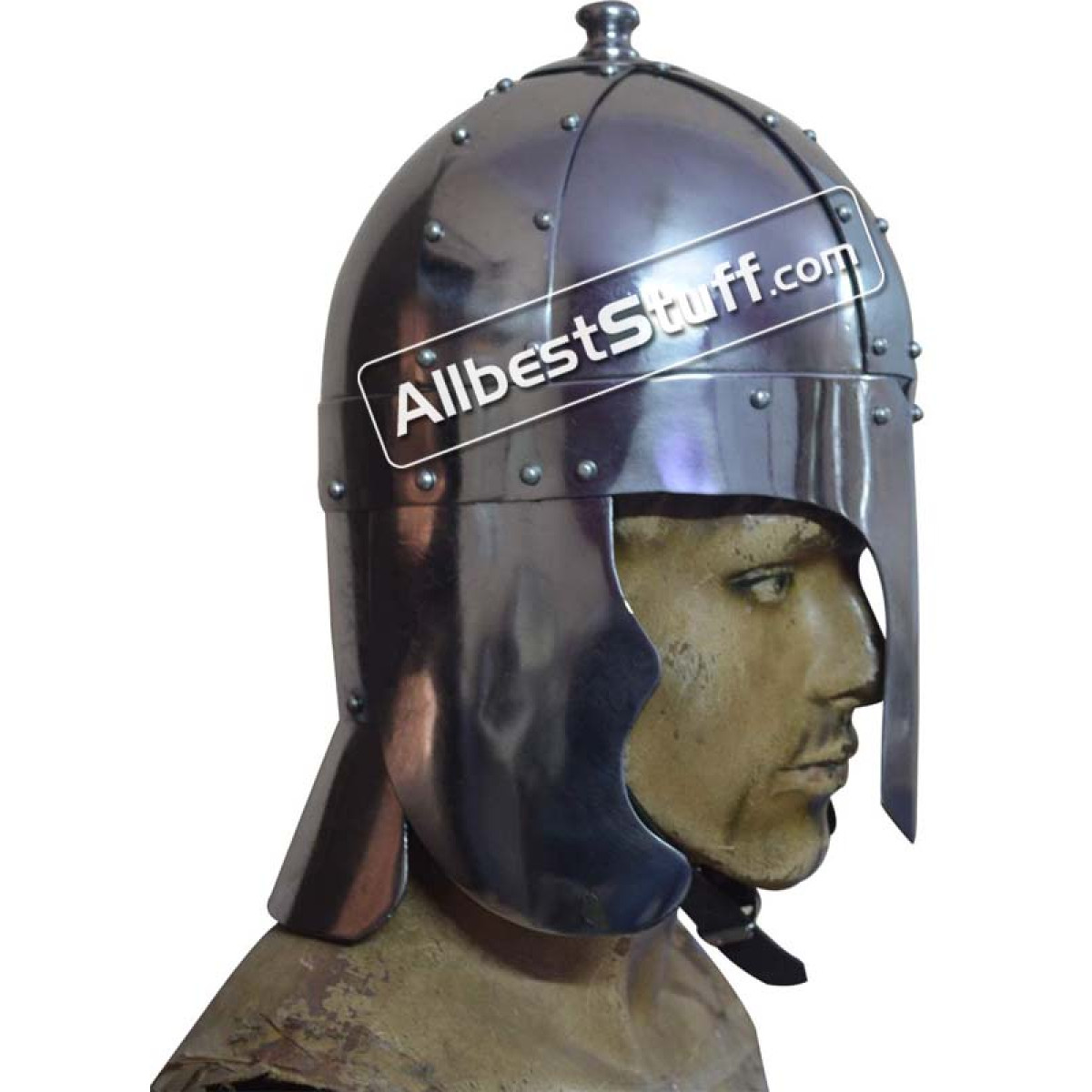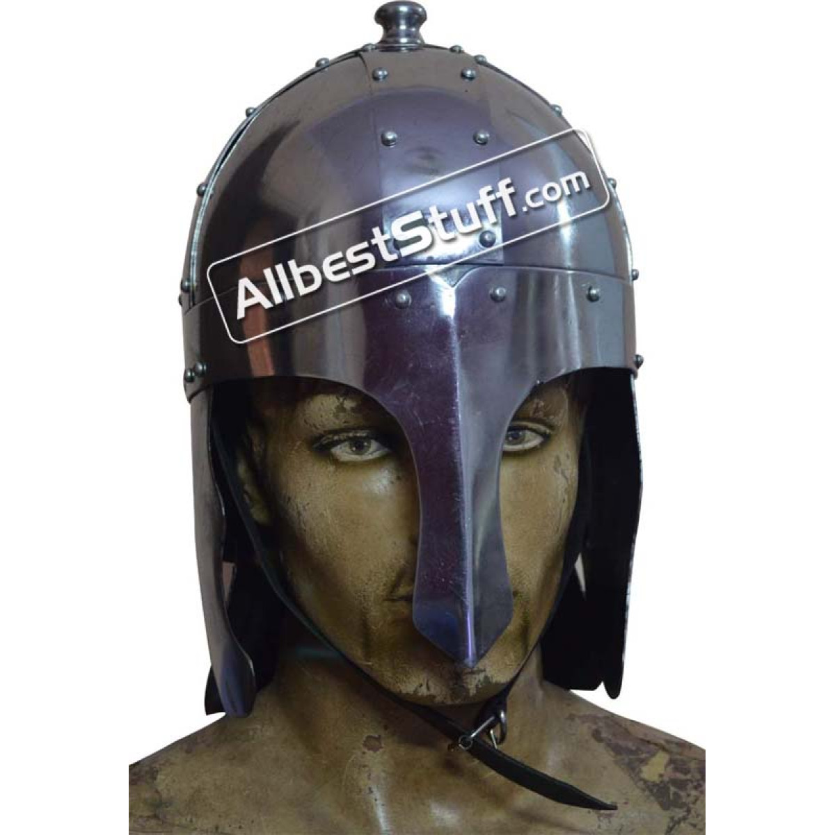 Replica in the style of an early medieval clasp helmet with nasal, ideal for LARP, theater and costuming. This helmet is made of 16 Gauge Steel, helmet shell, cheek and neck protection are driven by hand and riveted together. The helmet has a high-quality, adjustable leather liner and chin strap with buckle.