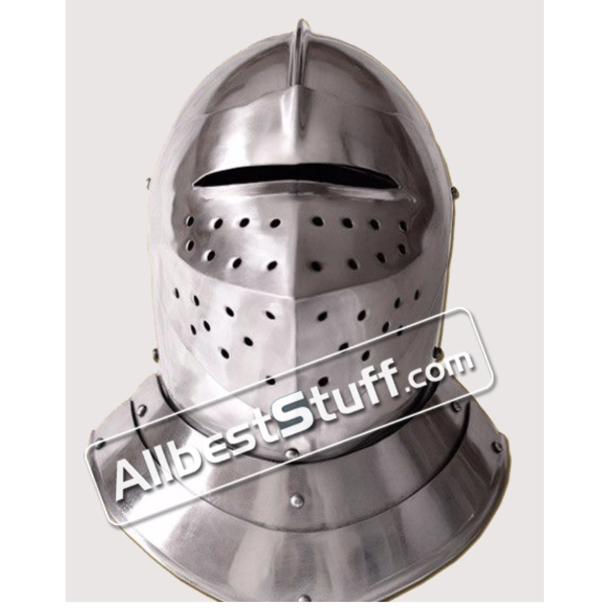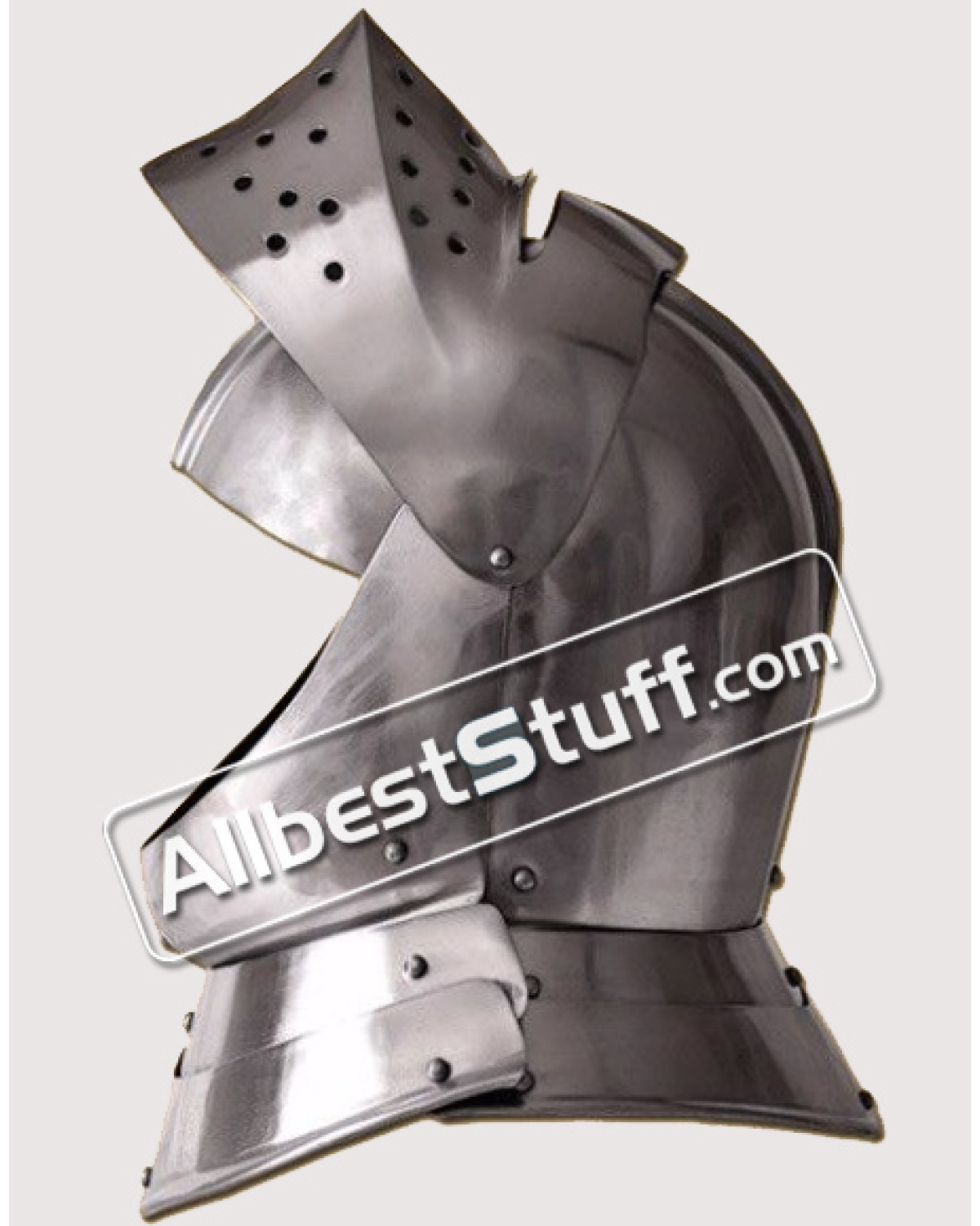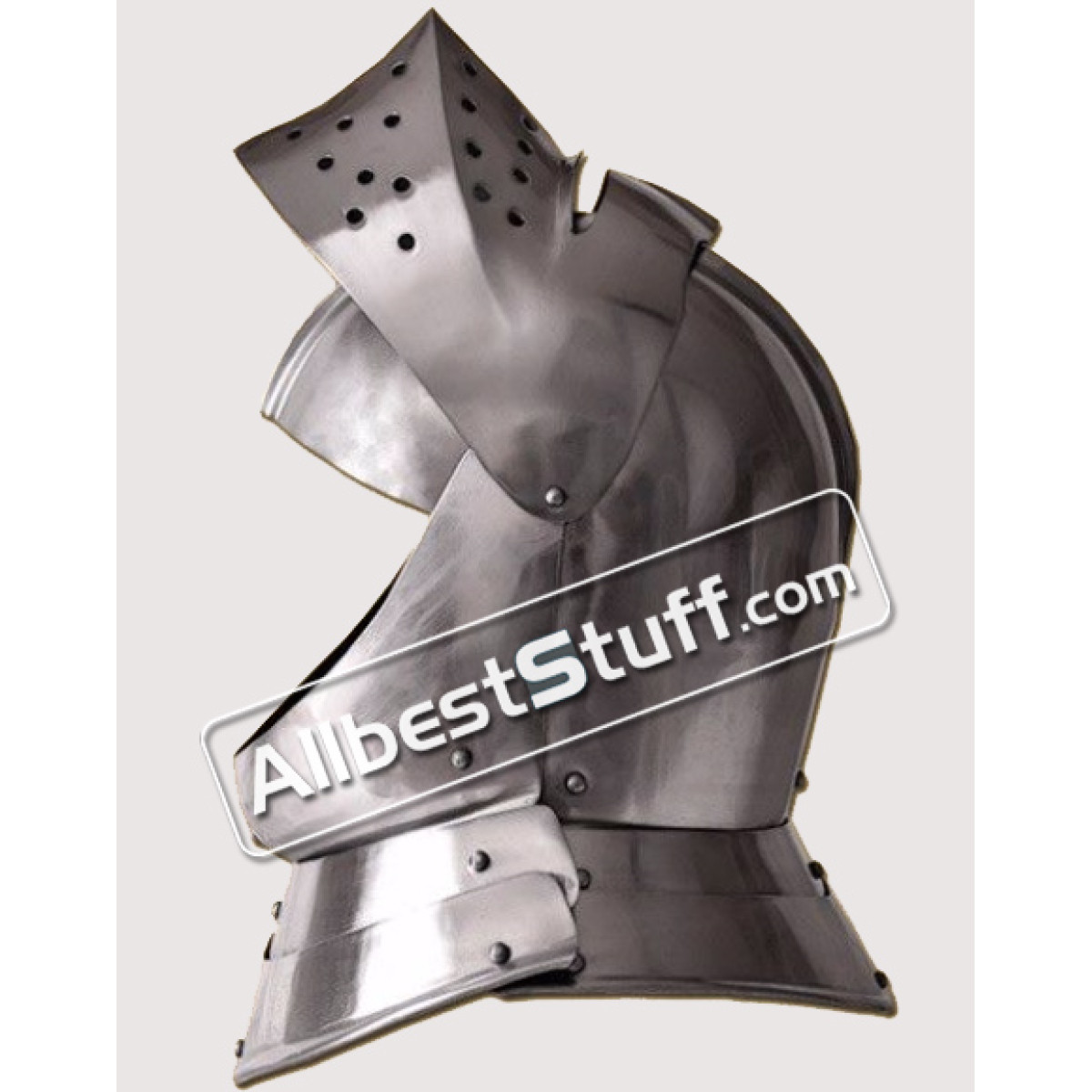 A medieval English closed helmet is a type of helmet that was worn by knights and other soldiers during the medieval period in England. It was designed to protect the head, neck, and face in combat or during training exercises.The closed helmet was a popular style of helmet in medieval England, and was often worn by knights who participated in tournaments or jousting matches. It was a full-face helmet, with a visor that covered the entire face and could be raised or lowered as needed. The helmet also had a neck guard and a top crest to protect the head from blows. The closed helmet was made from metal, typically steel or iron, and was often decorated with engravings, heraldic symbols, or other embellishments. It was worn over other types of armor, such as a breastplate and gauntlets, to provide additional protection to the body.