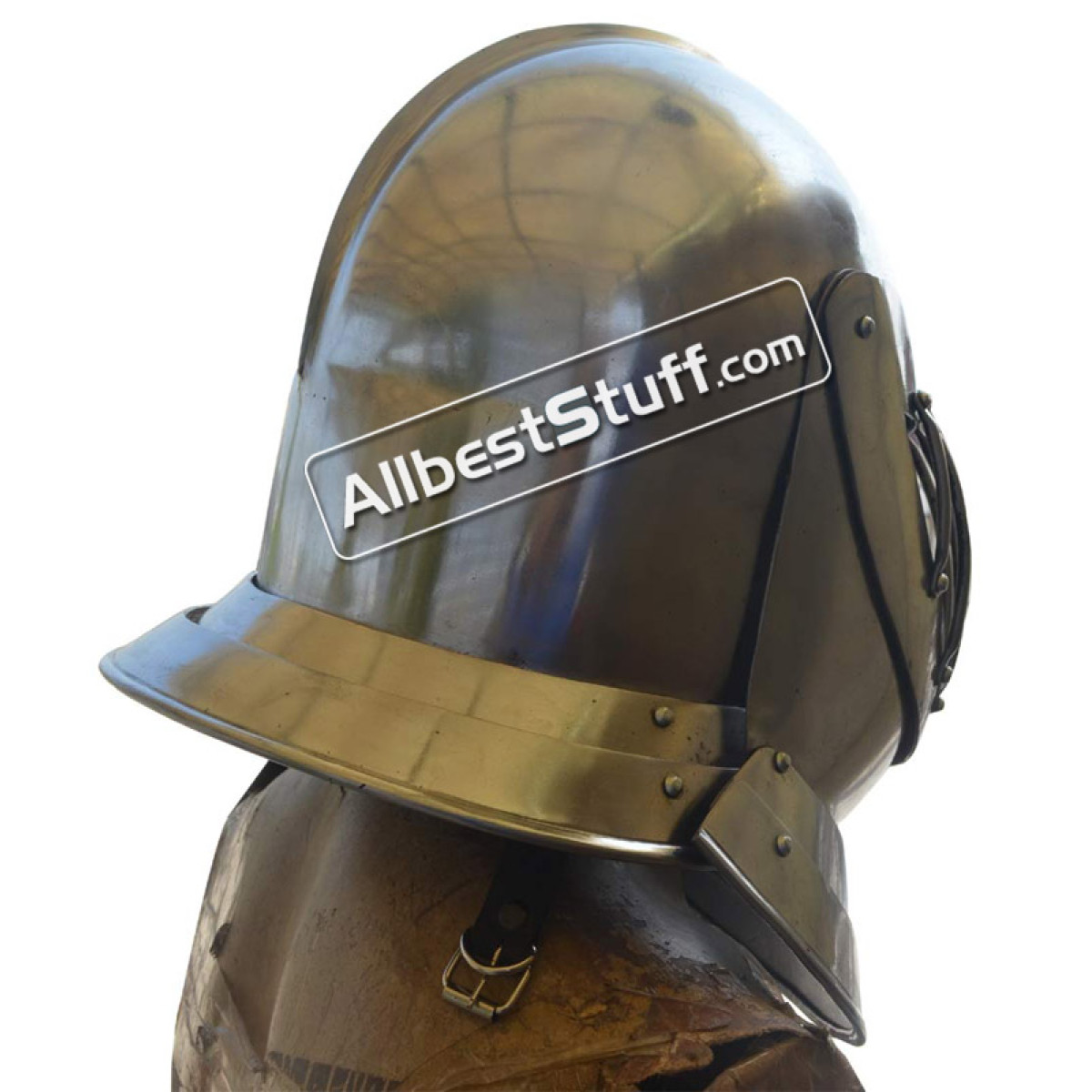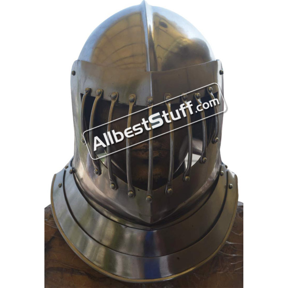 A product of the late Medieval and early Renaissance, the Close Helm shares an appearance that is, at a glance, quite similar to the Armet. The notable difference between the two is that the front half of the Armet opens laterally when fitting it to the head, whereas the front half of the close-helm opens vertically. Standard Adult Size fully wearable.
