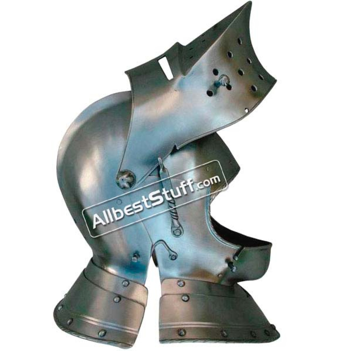 This helmet is made after a 16th century German original. Helmets like this were used both for tournaments and warfare. Helmets like this were worn in a large diversity in whole Europe. The helmet can be opened in three parts, this enlarges the field of view without exposing the chin and the neck. The peaked visor contains air holes and is extra peaked to conduct sword blows. The helmet can be locked. Standard Adult Size fully wearable.