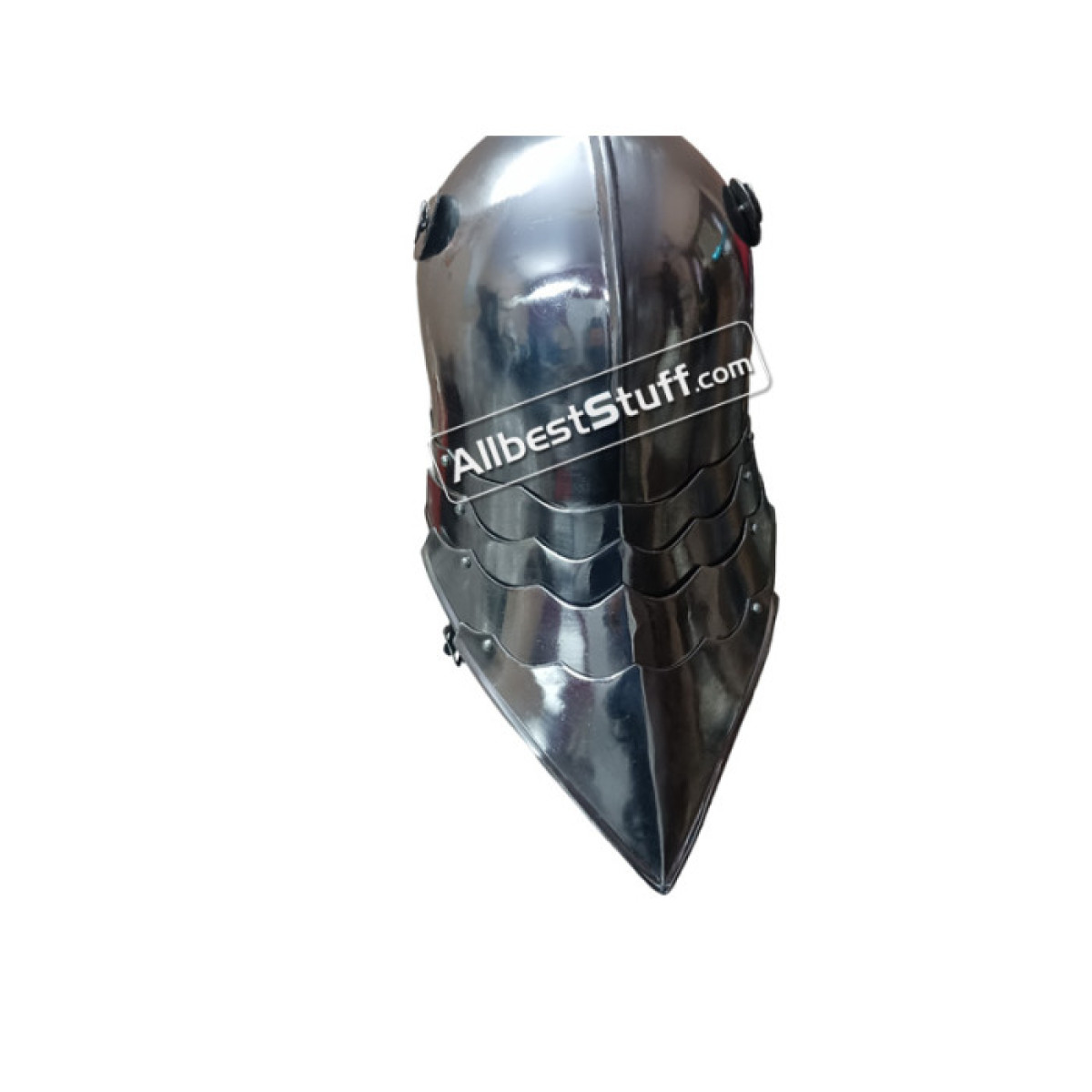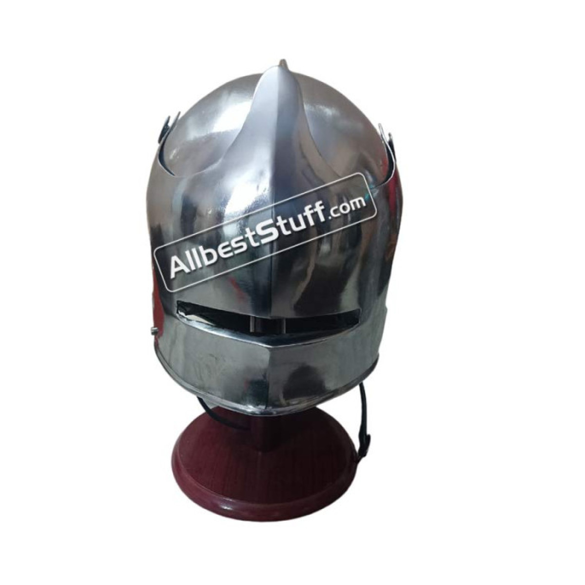 Medieval German Sallet Helmet 16 Gauge Steel Battle Ready, Our authentic reconstruction of this German Sallet 1490 is driven from 16 Gauge thick steel . The visor is attached with hand forged rivets cloverleaf. The moveable visor is locked by a pin mounted in the lowest stage. The helmet has a leather inlay and chin strap with buckle. The late medieval helmet type Sallet was usually worn with a matching , beard or gorget. Standard Adult Size fully wearable.