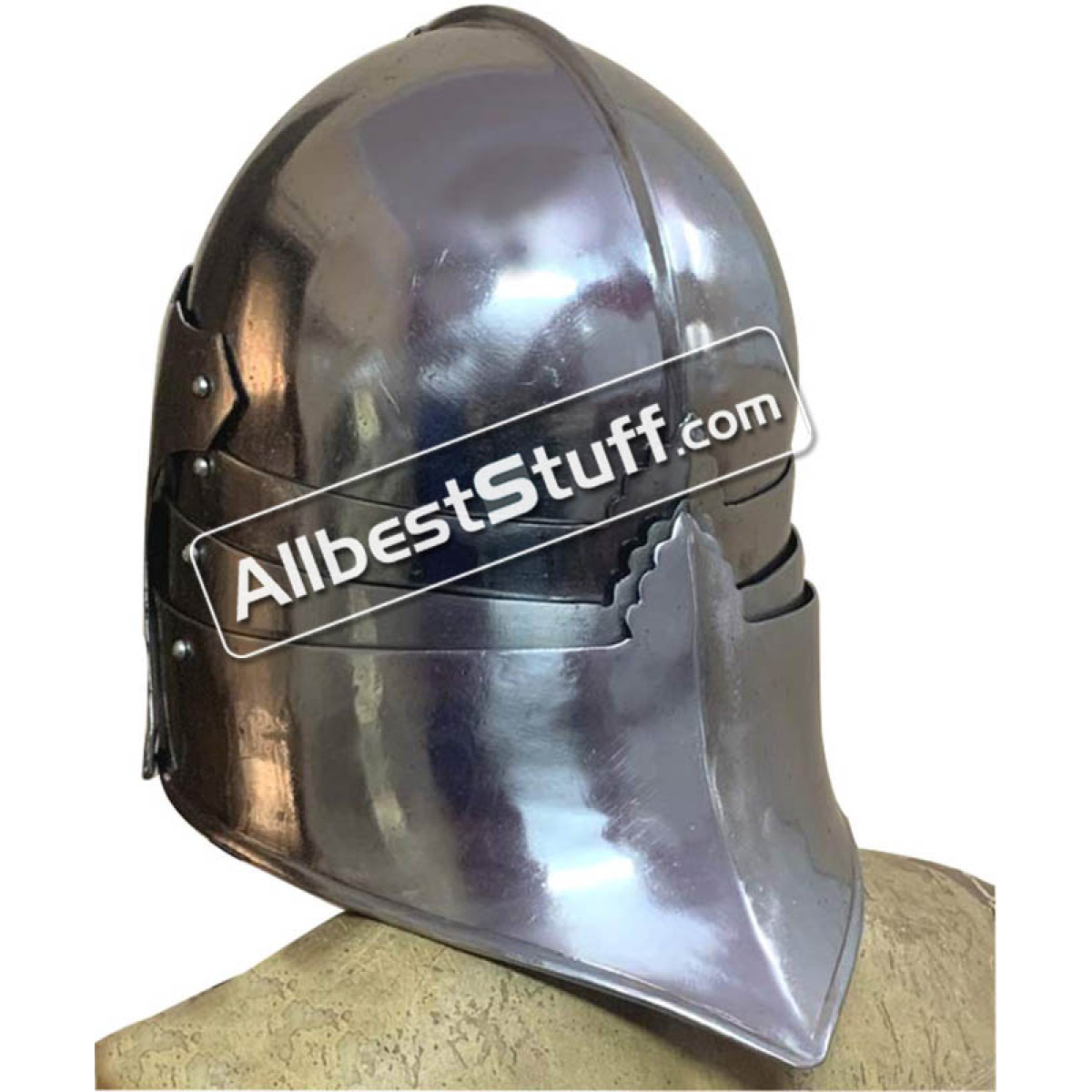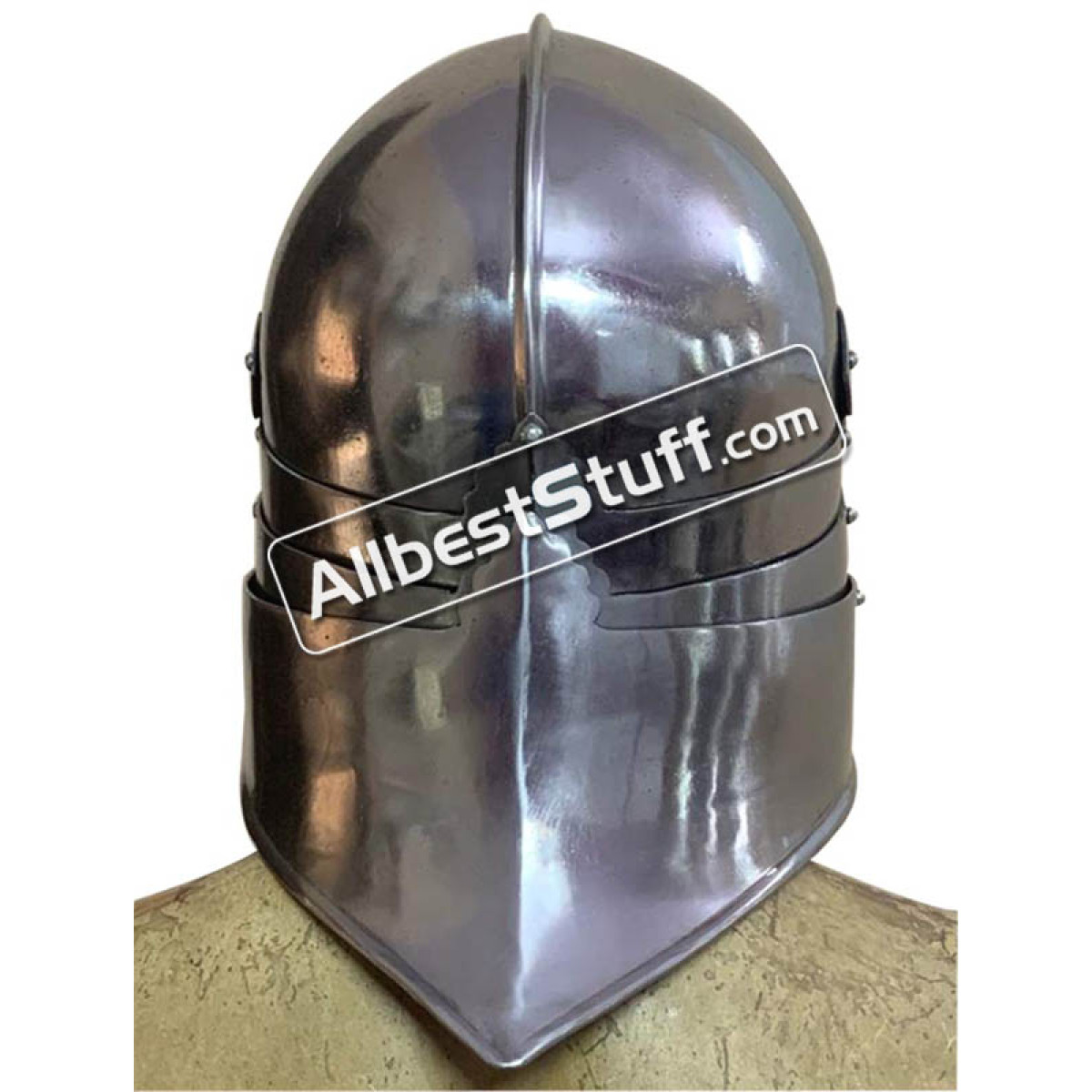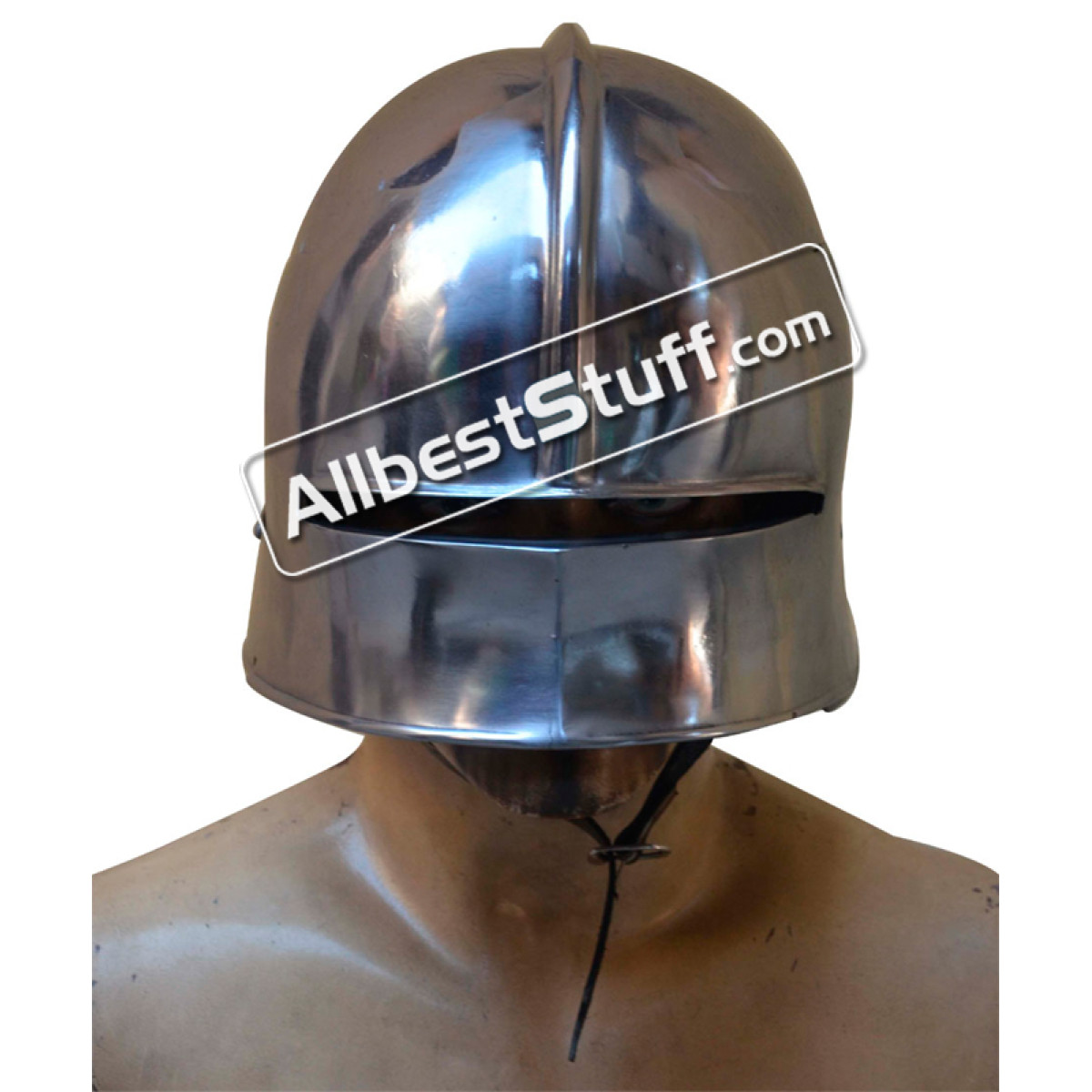 Medieval German Sallet Helmet Strong 14 Gauge Steel Battle Ready is an authentic copy of a late medieval German sallet 1480 AD. The Sallet helmet is hand made from 14 Gauge steel and is suitable for full contact re-enactment. An elaborate lock fixes the visor. The helmet is fitted with an adjustable Leather liner and a riveted leather chin strap and brass buckle. Standard Adult Size fully wearable.
