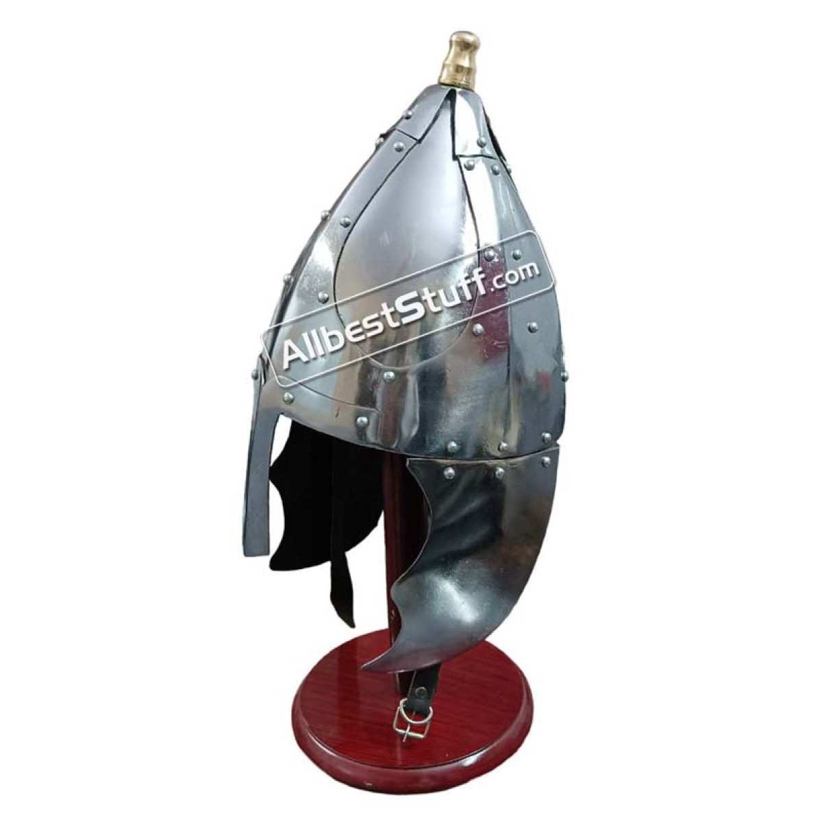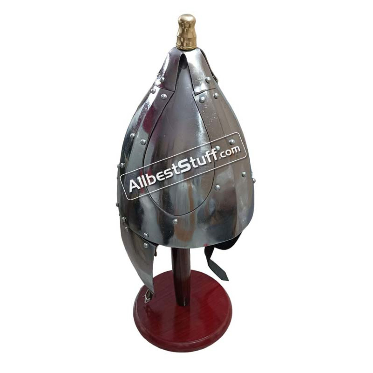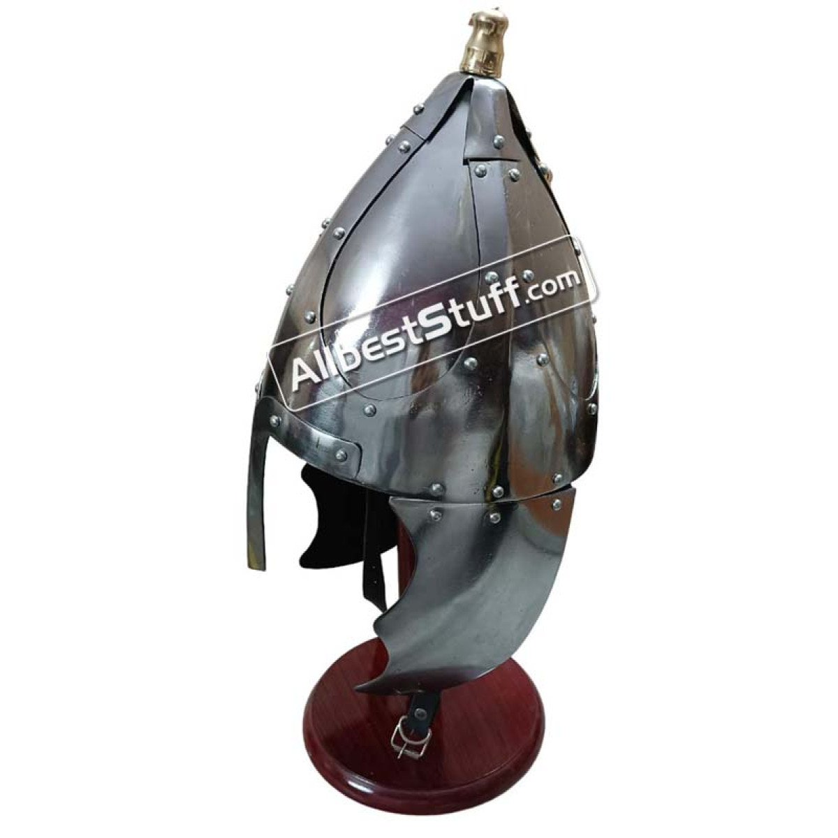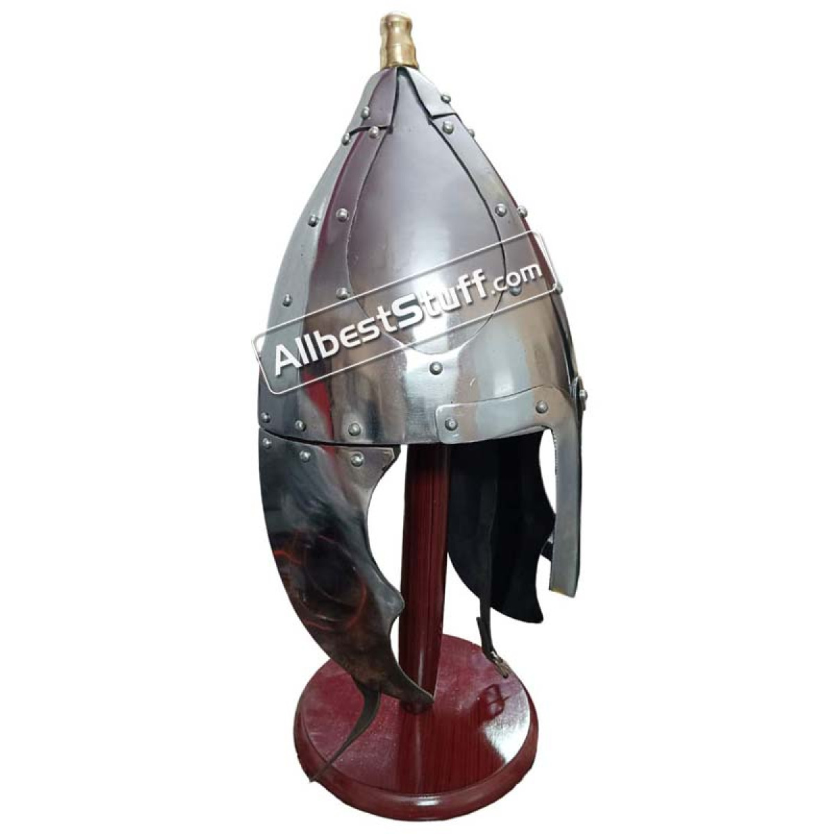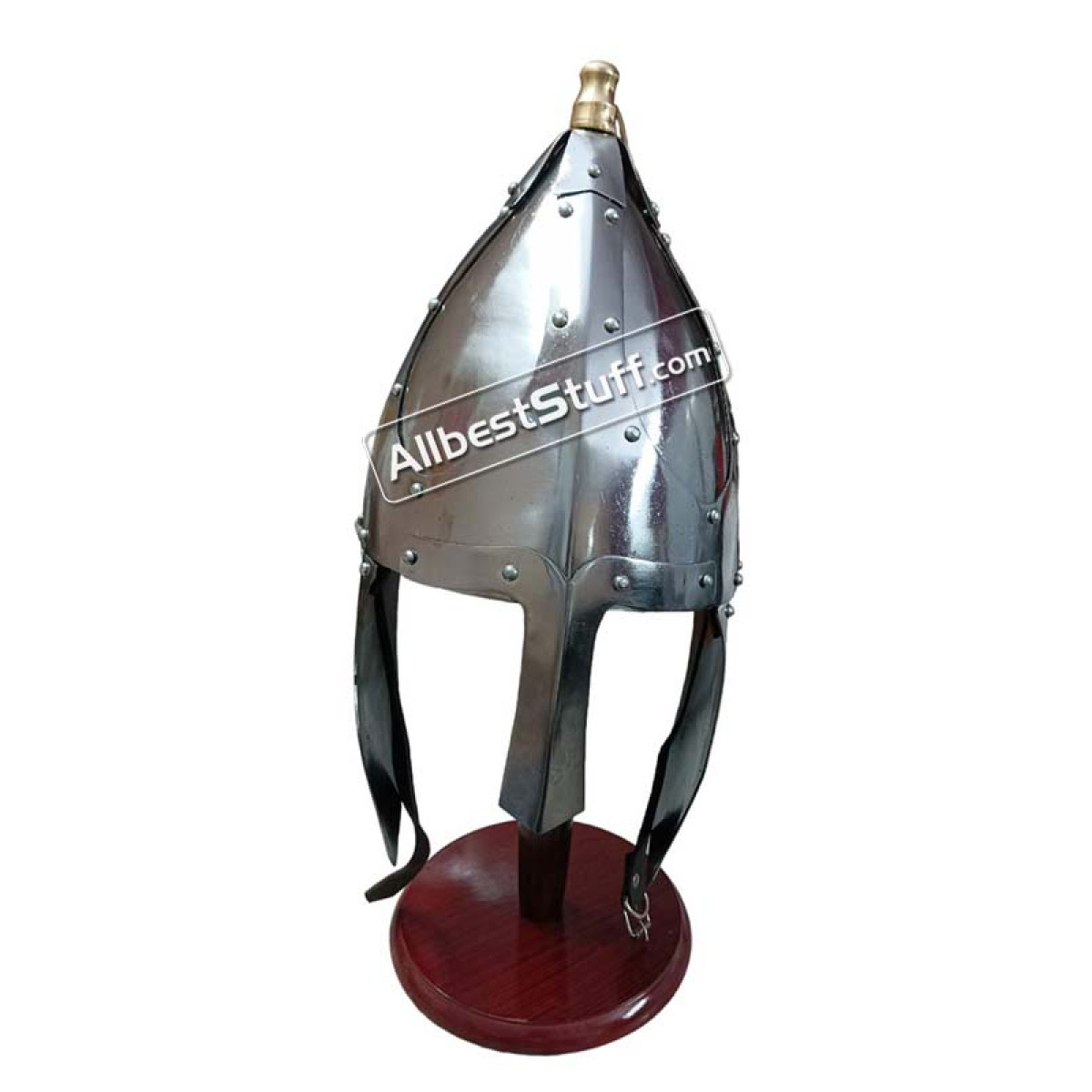 This helmet replica is modeled after the Germanic spangenhelm around 500 AD. Typical for this era is the shape of the pointed hull, as well as the nasal fins and cheeks. The helmet is equipped with a very comfortable leather inlay with chin straps. Due to the processing method (overlapping clips), we classify this helmet as ready for conditional battle. Use a heavy inner padding inside for protection. Standard Adult Size fully wearable.