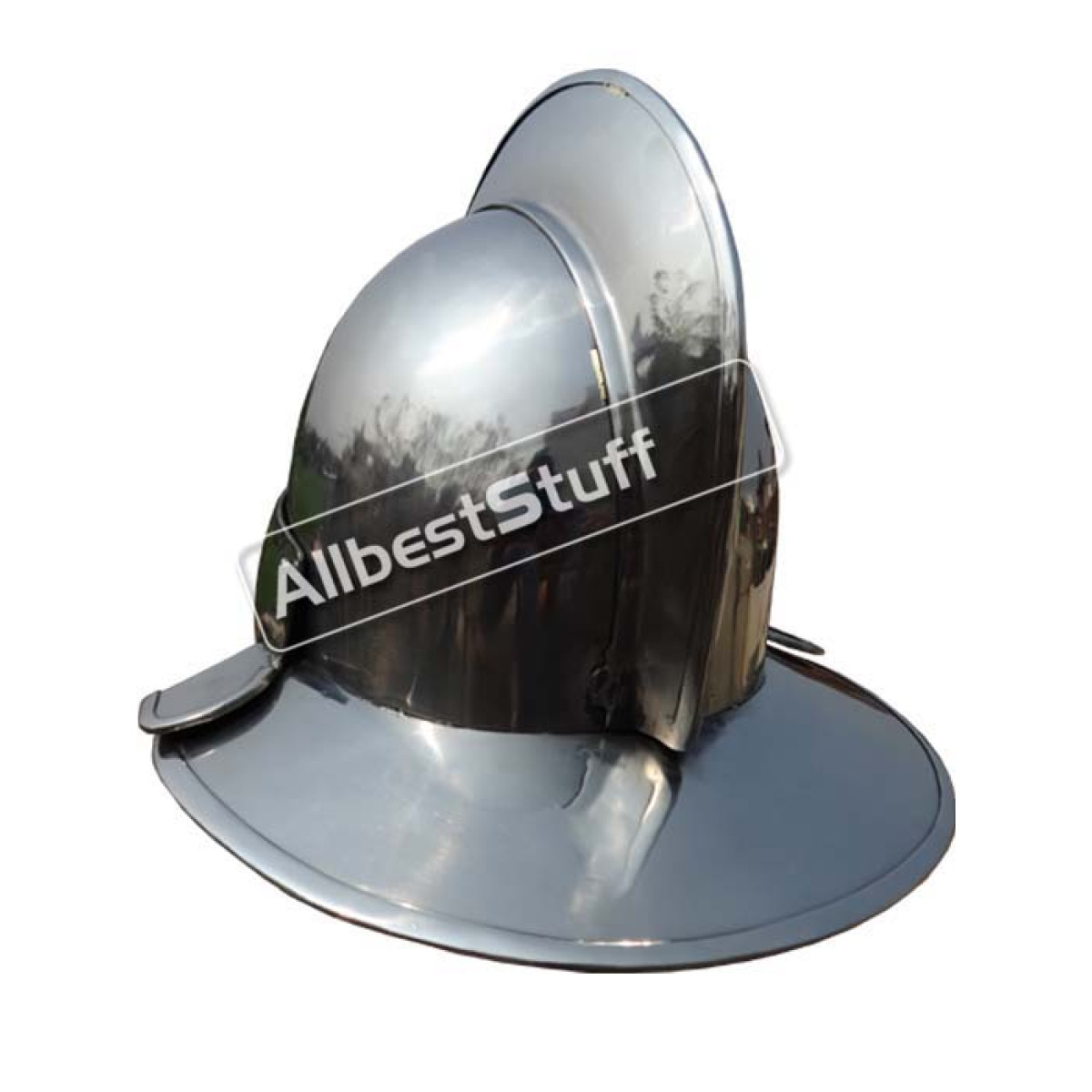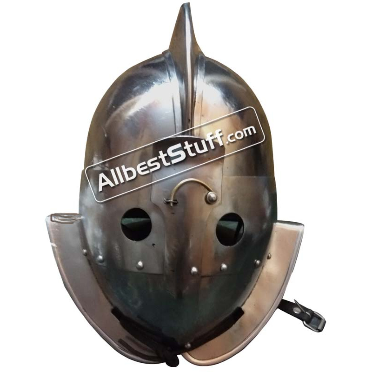 A true Viking Helmet Available in 14 Gauge and 16 Gauge made in mild steel capable of sustaining hard blows and protect the head during an SCA event. Full Face protection, use heavy inner padding for comfort wear.