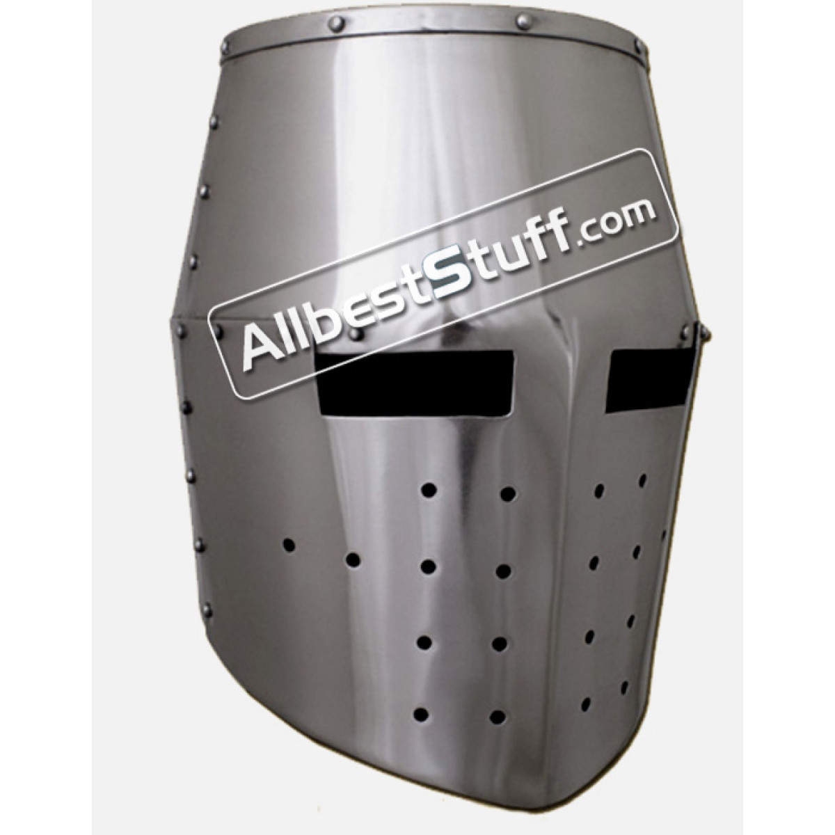 This helmet replica follows originals from the 13th century. The "Great Helmet" was often worn over a smaller, lighter helmet (for example secret helmet).They helmets were common throughout Europe in the middle ages, and numerous contemporary images, miniatures and originals found in Germany, Flanders, England, Italy, Switzerland, Austria, etc. prove the popularity of this helmet type. Use a heavy inner padding inside for protection. Standard Adult Size fully wearable.