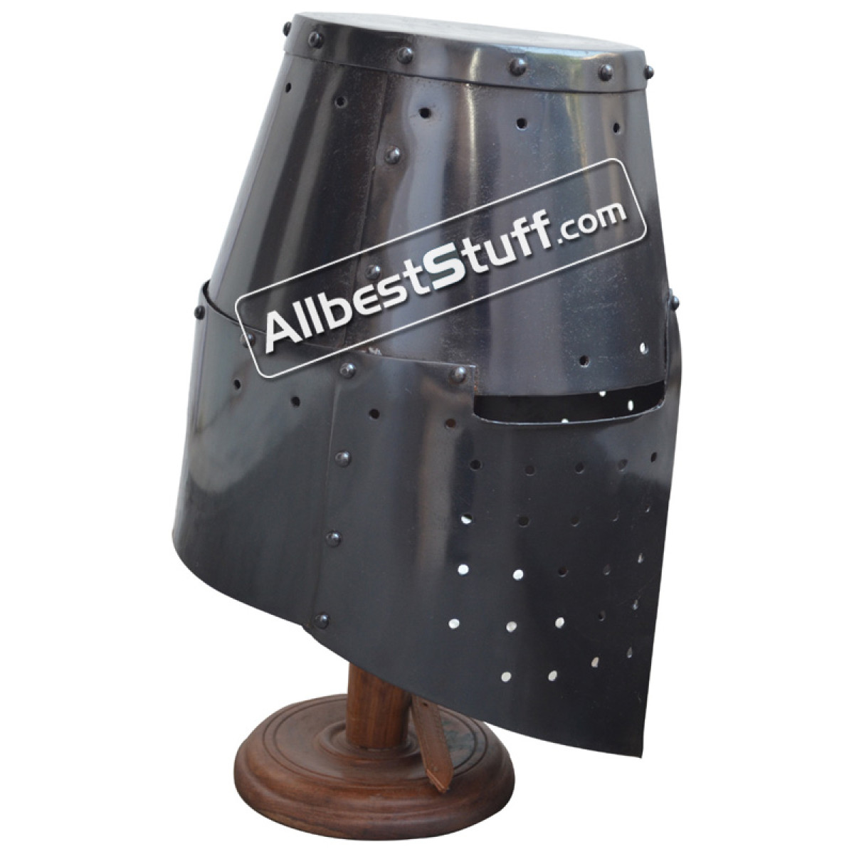 This Great helm is made from 16 Gauge mild steel with leather chin strap & Brass Buckle. Narrow eye slits in its original raw finish, given liberty to do a paint job according to your need or use it just like this. Tough 16 Gauge over 7 lbs in weight steel helmet is fully capable of absorbing the shock of combat.