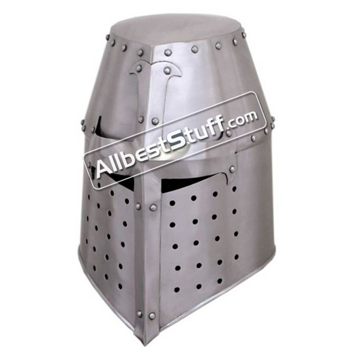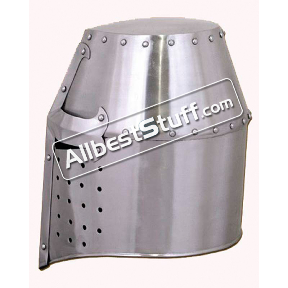 The great helm was a flat-topped cylinder of steel that completely covered the head and had only very small openings for the eyes and mouth. Later designs gained more of a curved design, particularly on the top, to deflect or lessen the impact of blows. This Great helm is made from 18 Gauge mild steel with leather chin strap. Narrow eye slits in its original raw finish, given liberty to do a paint job according to your need or use it just like this. Tough 18 Gauge over 7 lbs in weight steel helmet is fully capable of absorbing the shock of combat.