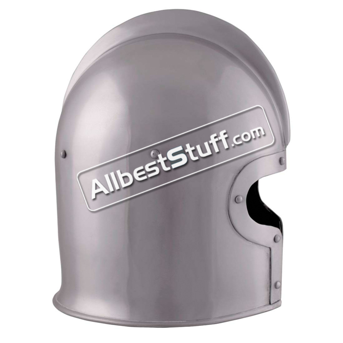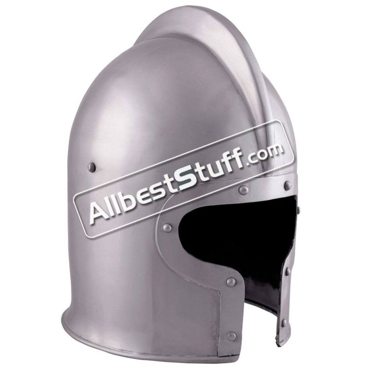 Typical Italian Barbute helmet shape circa 1440 AD. Made from elaborately worked and riveted 16 Gauge steel. Standard Adult Size fully wearable.