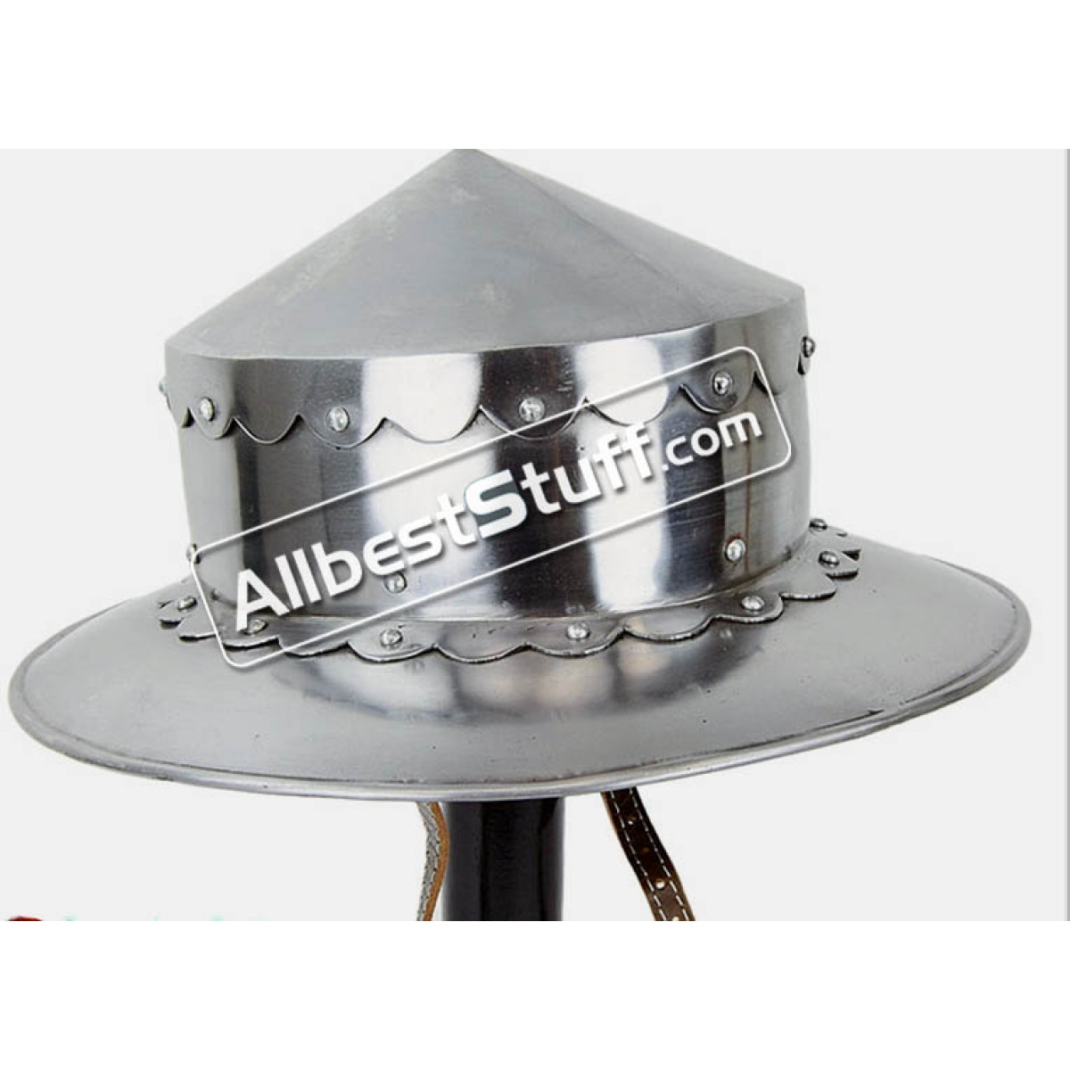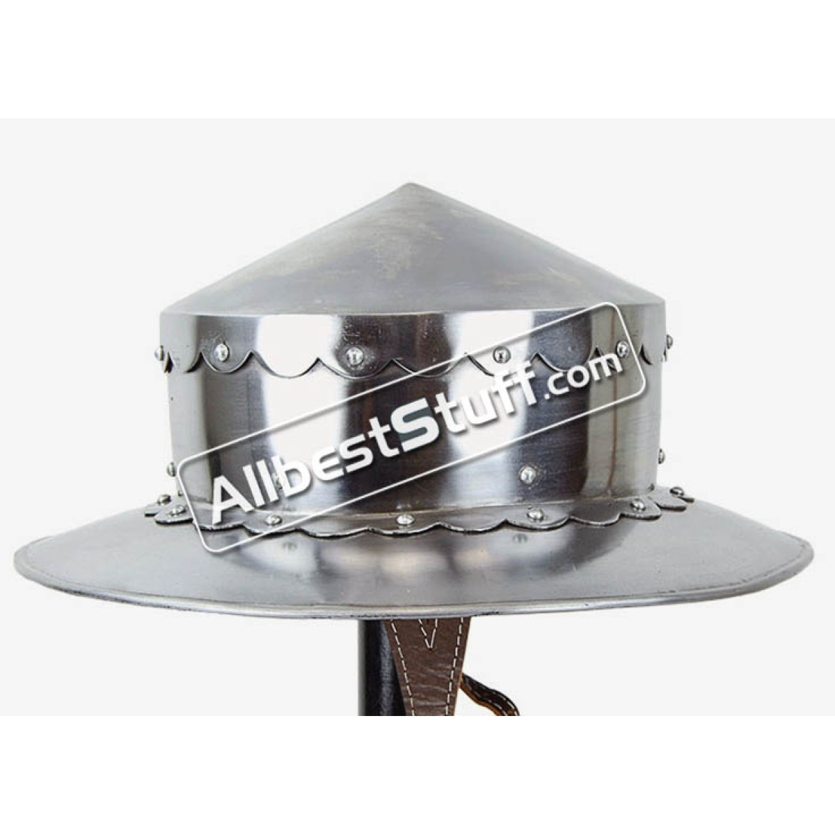 The 12th Century Conical Kettle Hat is a medieval kettle helmet and is constructed from 14 gauge steel. Standard Adult Size fully wearable.