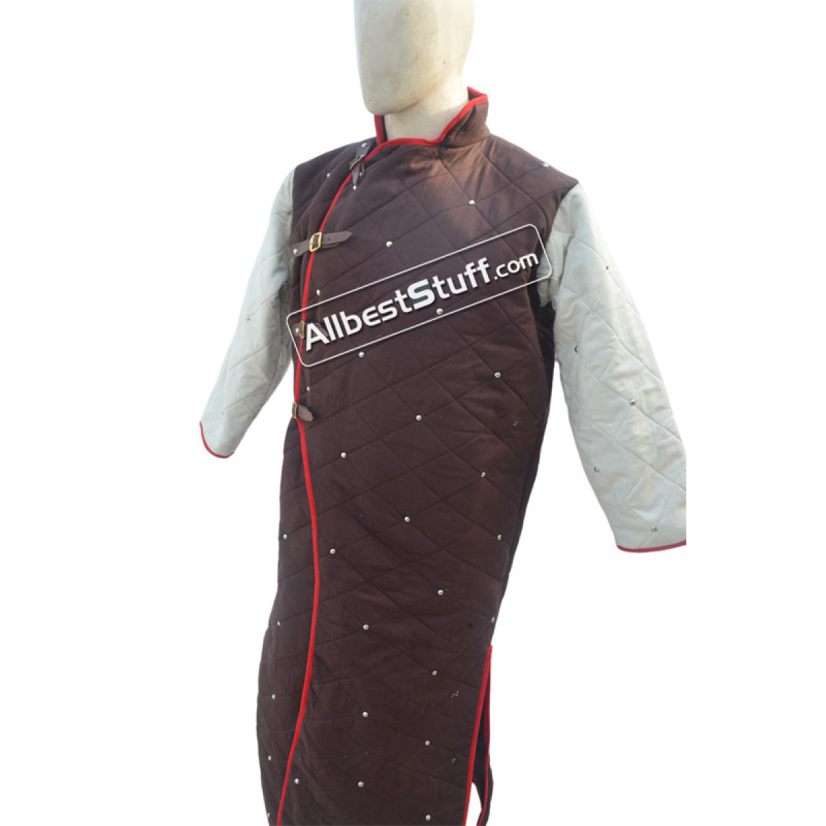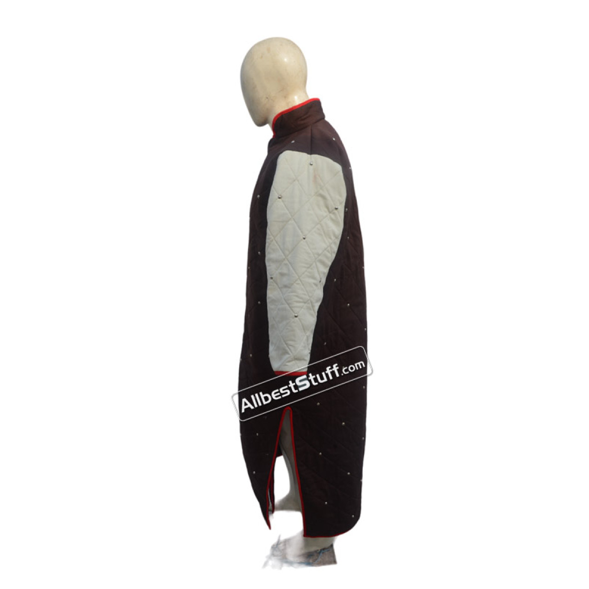 The interior of the gambeson is lined with cotton felt. Long Length of with Long sleeves available in combination of choice of color combination offering authentic medieval look. White color remains constant on Sleeves while there is an option of changing main color.