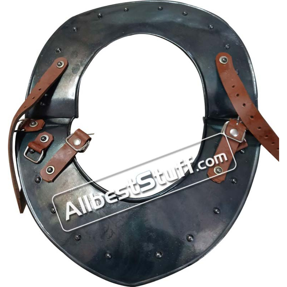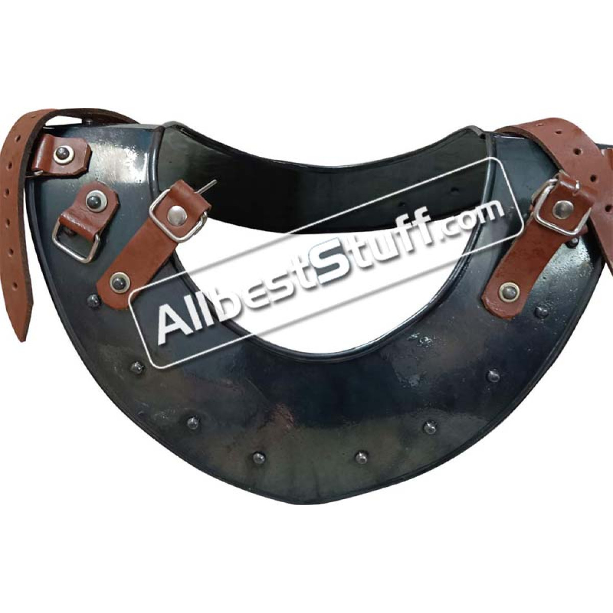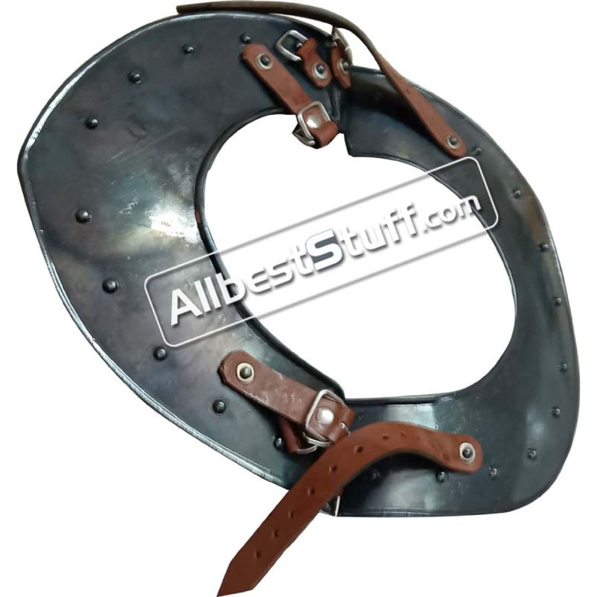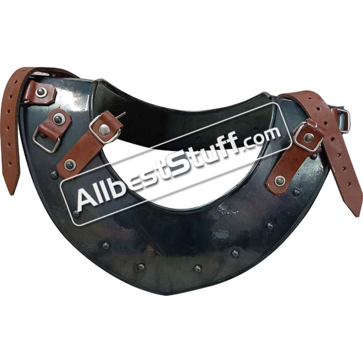 The perfect piece to complete your medieval warrior ensemble, the Steel Gorget offers excellent protection to the neck of the wearer. This steel gorget displays a bright metal finish that goes great with other plate armour. Buckles enable shoulder armour like the Large Steel Spaulders be easily linked up with the sides of this metal gorget. We recommend wearing a padded collar or other arming wear with this steel armour for increased comfort.