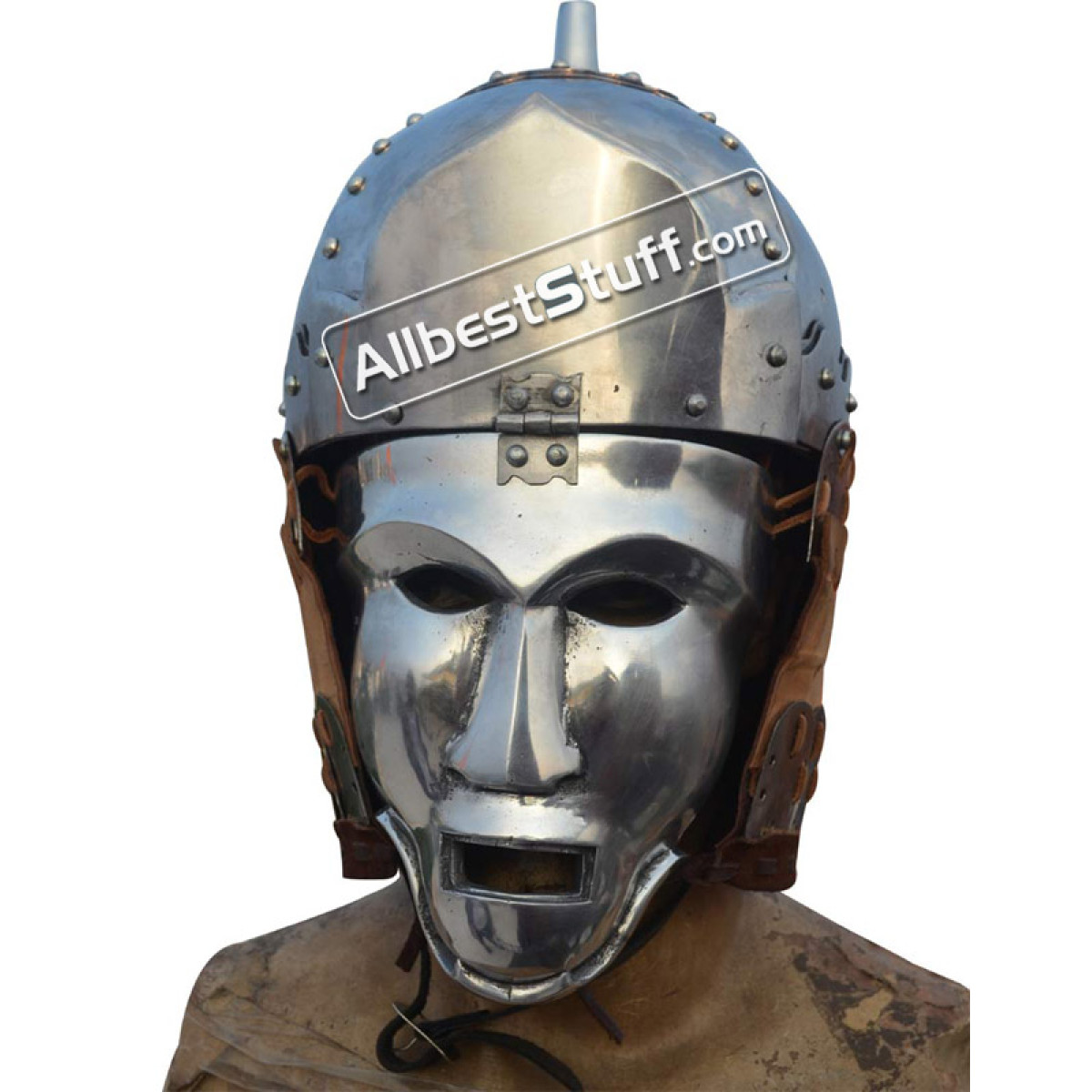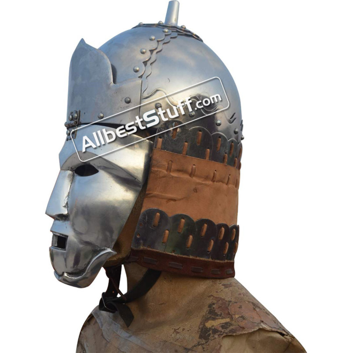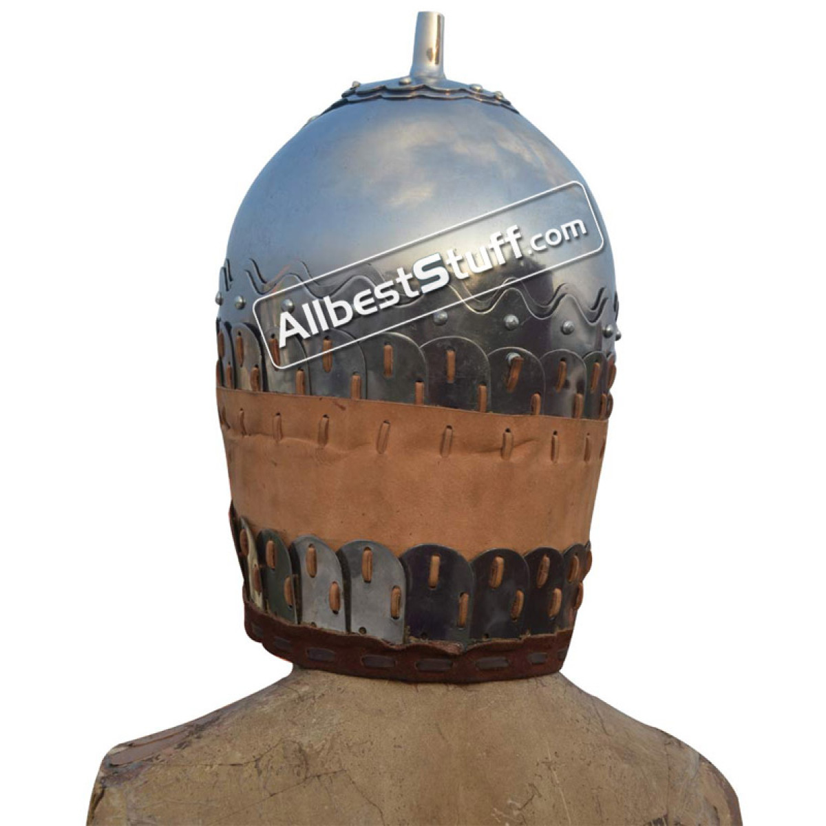 This Helmet Made of 16 Gauge Steel 14th century found in Mongolia. The exceptionally strong helmet was presumably worn by the heavy cavalrymen of the army of the Golden Horde. The helmet is provided with a beautiful frontal plate, possibly a late development from the Roman sports helmet. The neck is protected by an iron lamellar Armor.