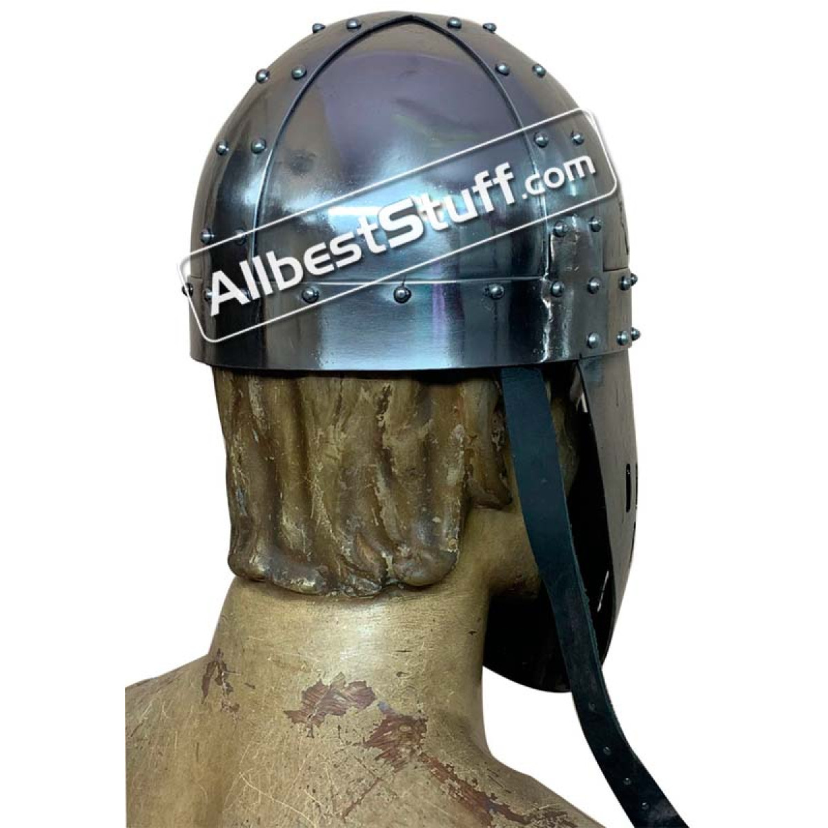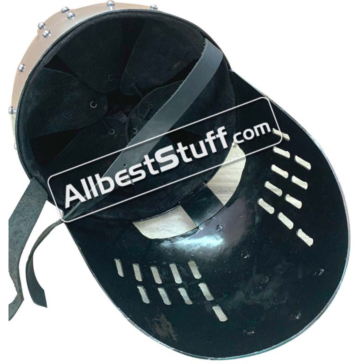 This is the Norman Faceplate Spangenhelm 14G Steel Viking Helmet with Leather Liner. This is a fully battle ready Viking helmet made of 14 gauge steel. This style of helmet cover the top of the head and has a visor that covers the front of the face but lacks protection for the back of the head.. This replica is made from 14 Gauge steel with buff finish.