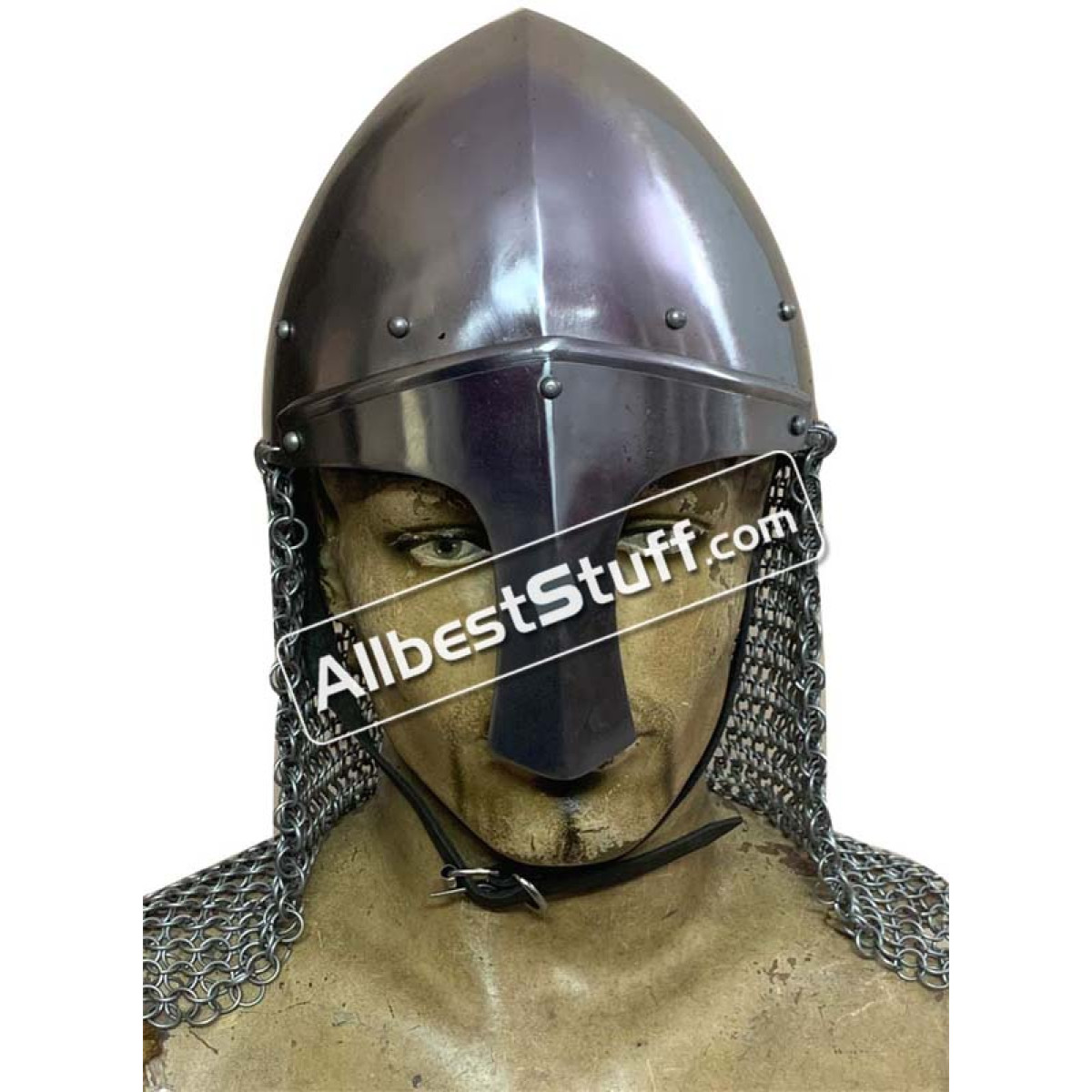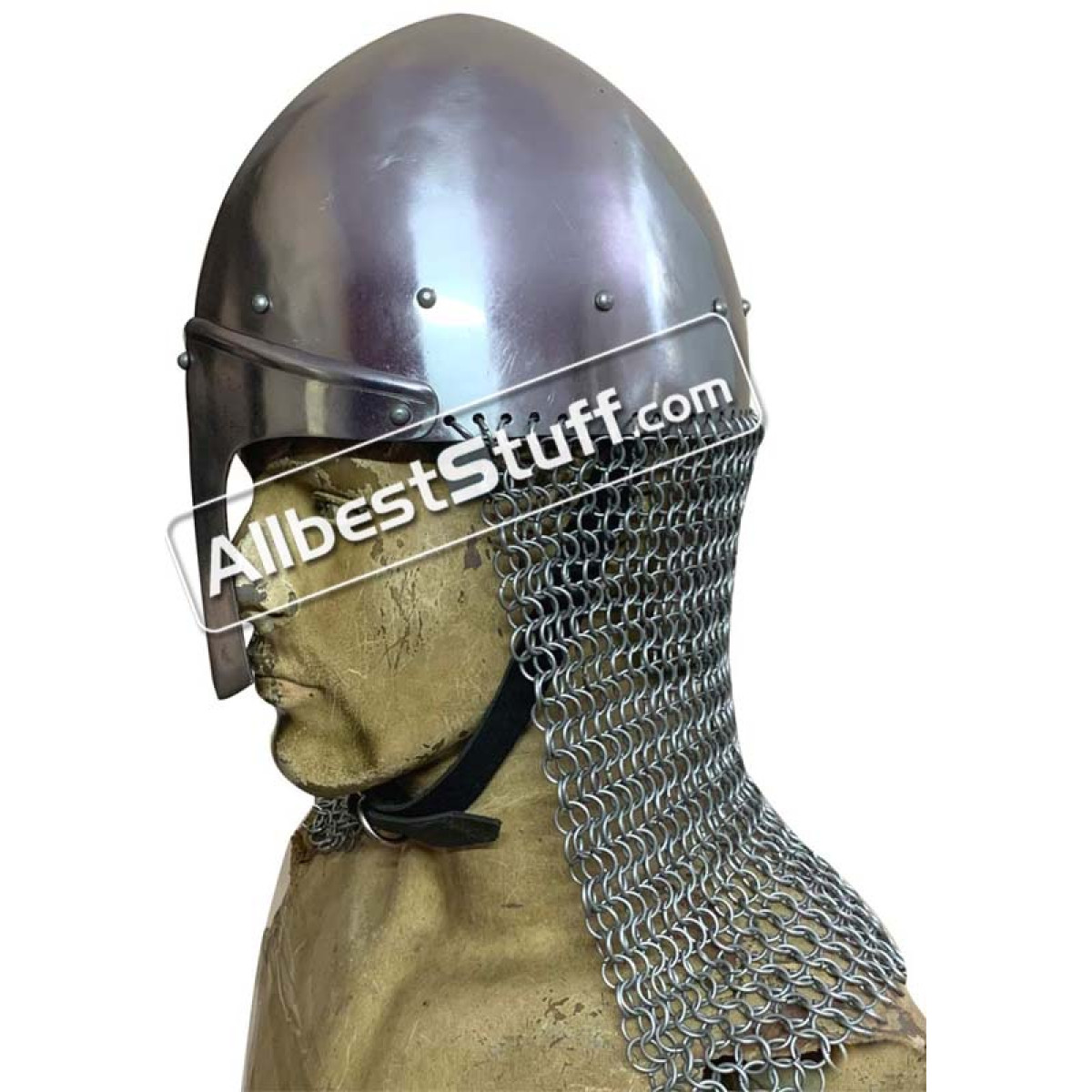The Norman Helmet Nasal helmet with Butted Chain mail aventail. Typical helmet shape with nasal protection and Butted Steel chain maille aventail for protection of neck and shoulder. Medieval Norman Nasal Helmet was used from the Early Middle Ages until the High Middle Ages. The Norman Helmet has a Steel butted chain mail aventail to protect the of the neck. Standard Adult Size fully wearable.
