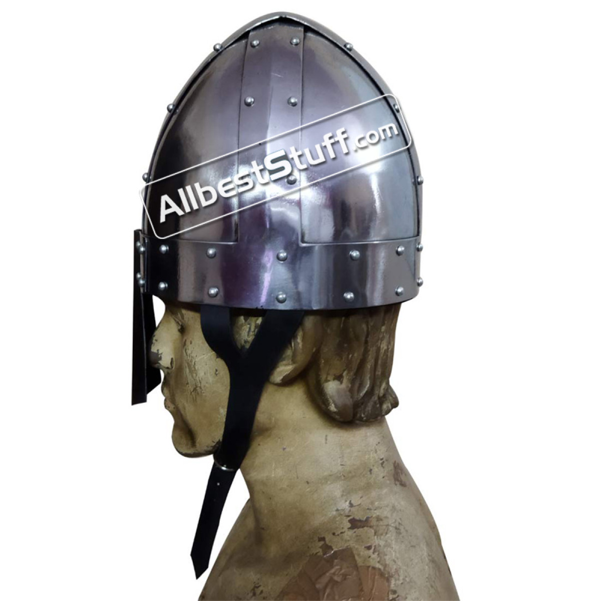 this battle-ready replica of a Norman Spangen helmet from the 11th century. The Norman spangenhelm is made of 14 steel. The four parts of the norman spangenberg shell are welded and riveted .This processing and the overlap of the individual clips ensure highest strength and great protection during re-enactment. Use a heavy inner padding inside for protection. Standard Adult Size fully wearable.