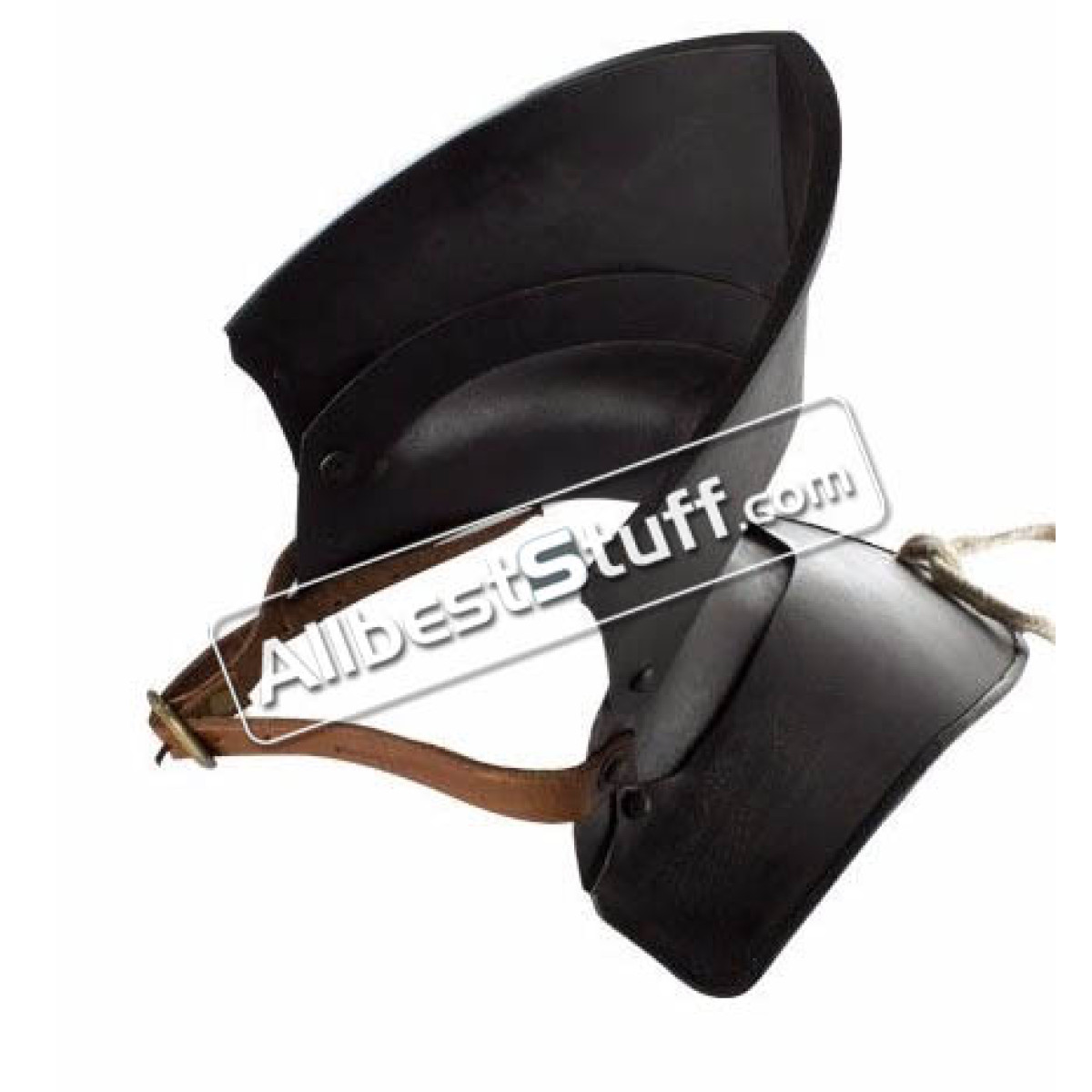 The gorget is made from 18 Gauge steel with rivets. It has no sharp edges making it safe for your LARP weapons. Can be adjusted around your neck for a perfect fit by means of a leather strap and buckle. This bevor will keep you protected against any frontal attack without losing your vision or your freedom of movement.