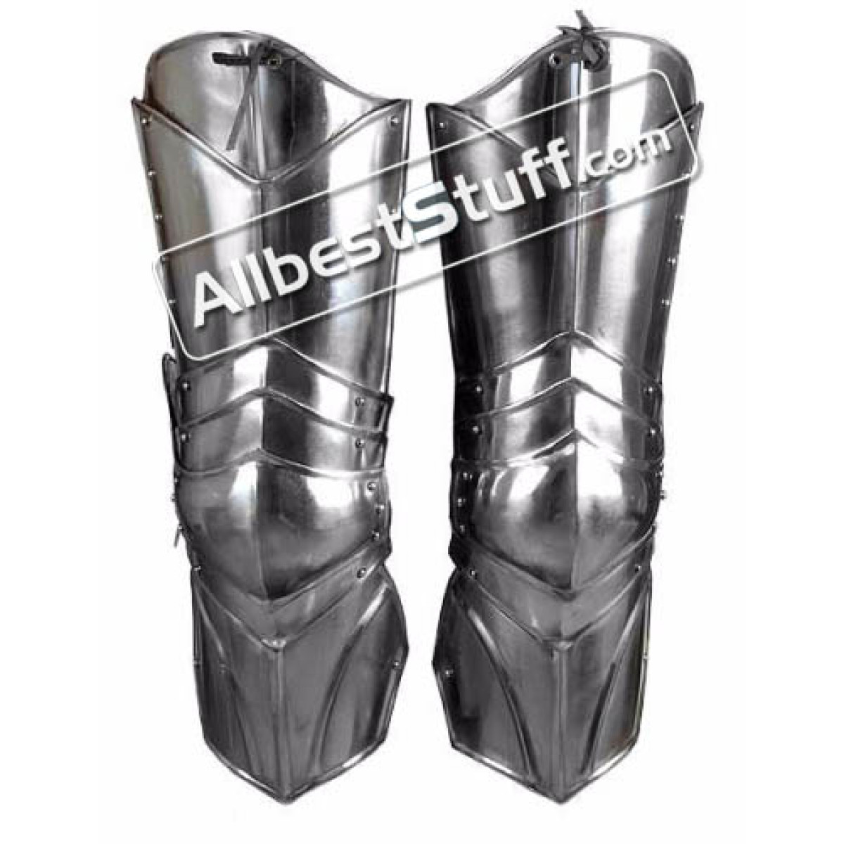 LARP Gothic Leg Protection consists of cuisse’s to protect the lower thighs, articulated poleyn’s covering the knees, and half demi greaves protecting the upper shins and sides of the calves. The poleyon knee-cups are articulated, composed of four overlaying plates and fitted with a projecting plate adding cover to the under-protected hamstring. The leg protectors are held up with straps tied to a belt and held in place via guiding straps around the thighs and calves. The Gothic leg Protection is made from mild steel with rolled edges that form ridges around the rims.Specific:Made from : 18 Gauge Mild SteelFinish : Buff FinishCondition : Brand NewWidth : 9 inchesHeight: 20 inches approx.Gauge : Choose from optional