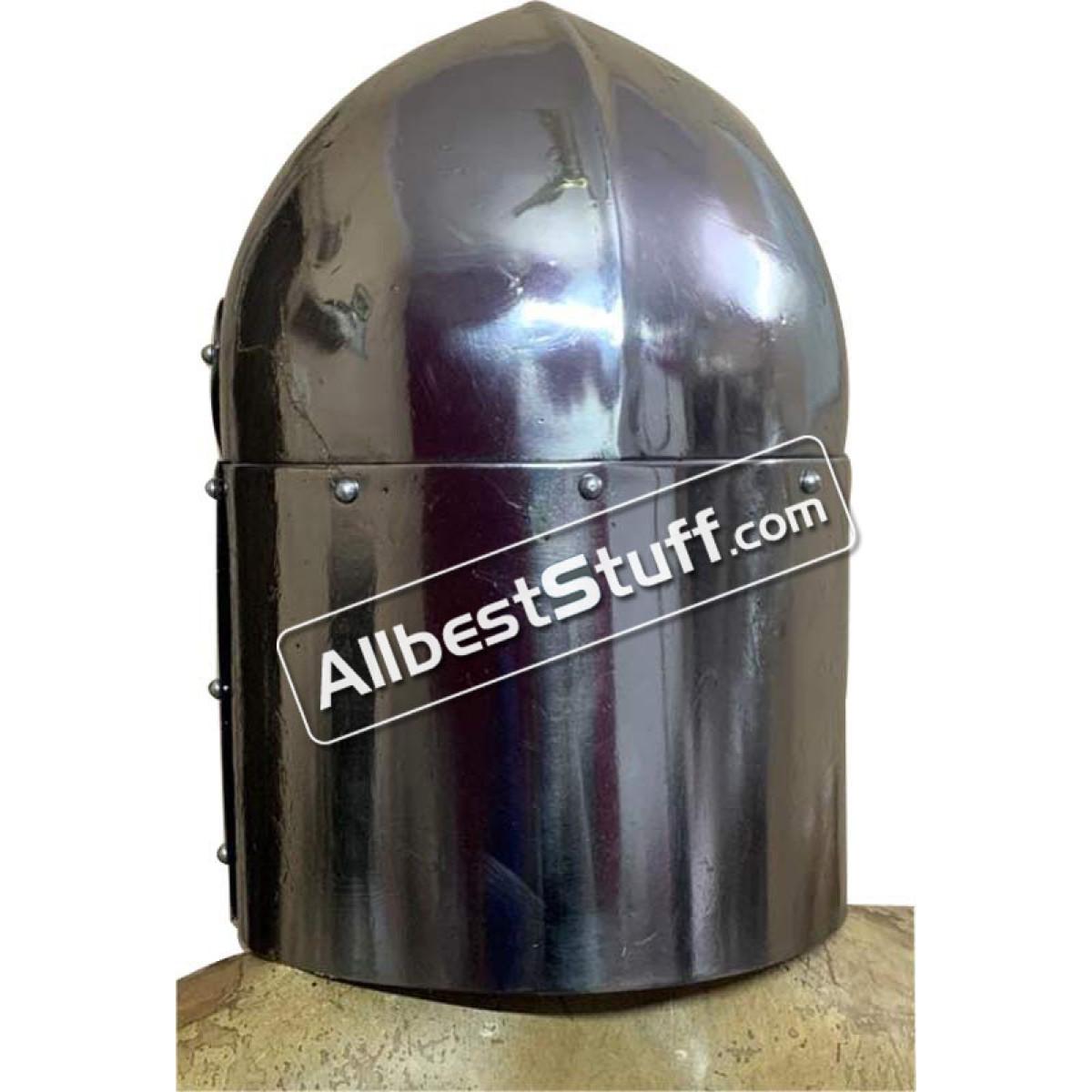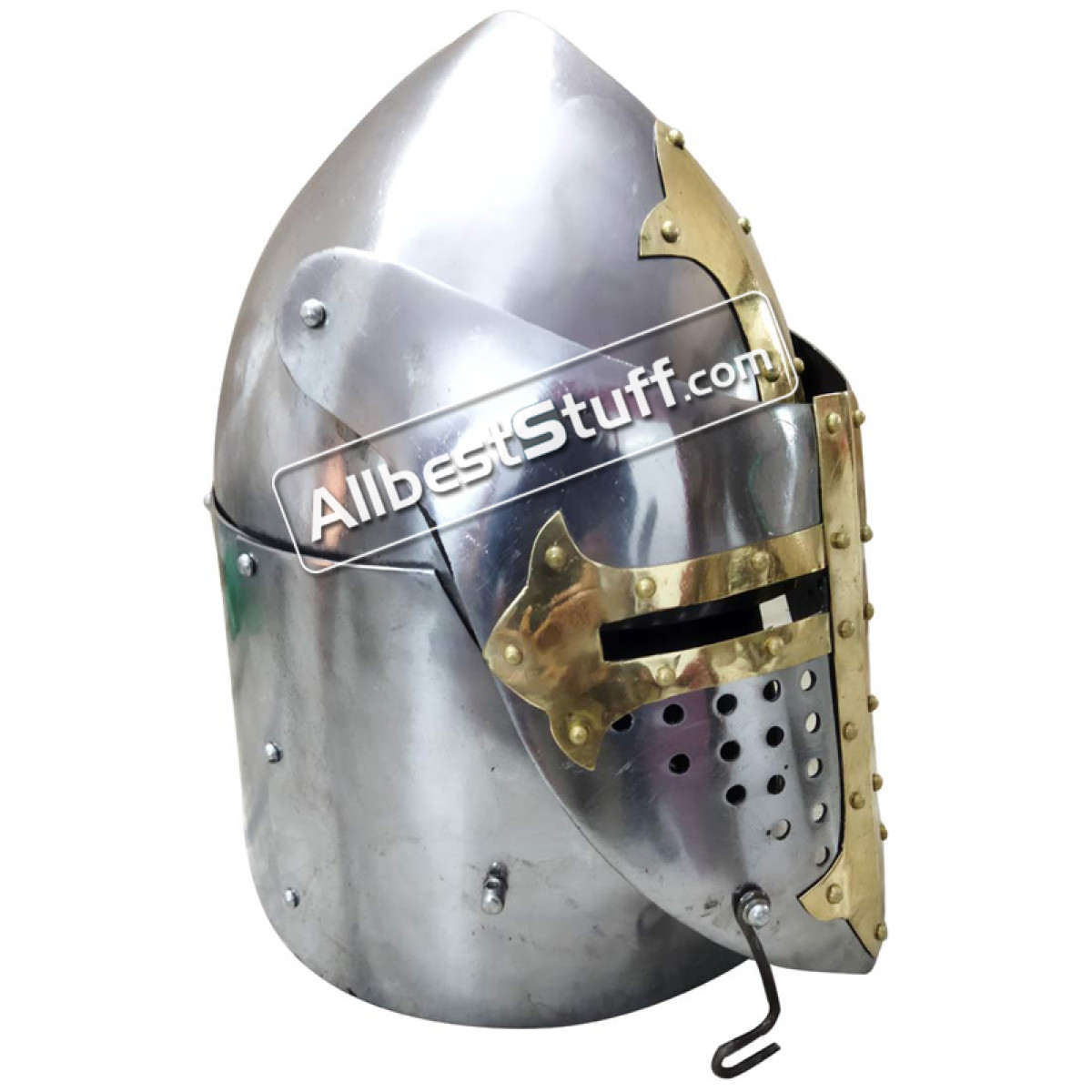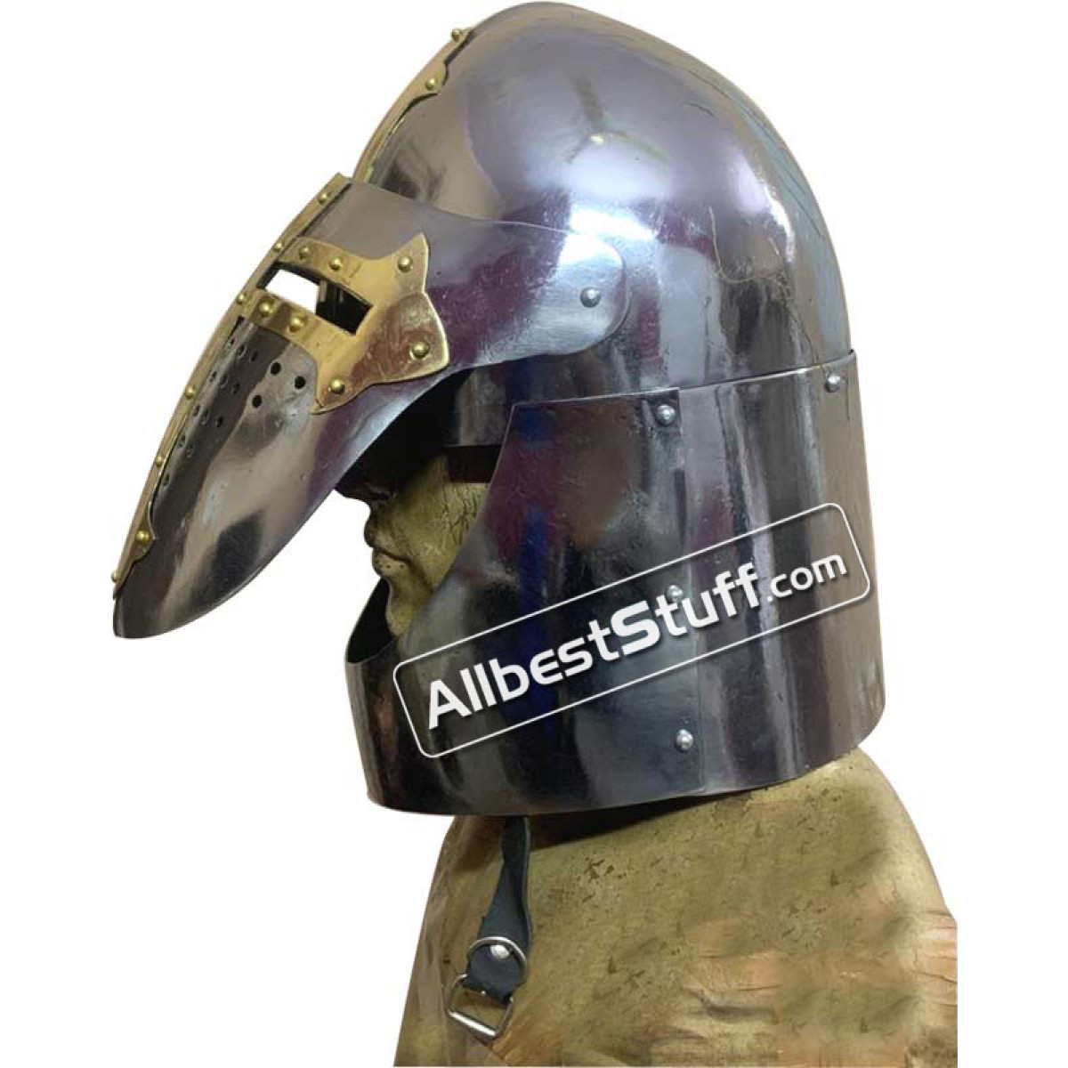 this Helmet early 14th century, the “Sugar Loaf” Helmet is becoming a type of bascinet. The visor gives the option of full face protection or having it open for a wider range of vision. The brass cross is typical of the design of the period. Great helms with a more conical bowl were also called Sugar loaf helmets on account of their resemblance to a sugar loaf. This shape gained popularity by the early 14th century. This replica distinguishes itself in that it features a hinged visor. The helmet is hand-crafted out of 16 Gauge steel. Standard Adult Size fully wearable.