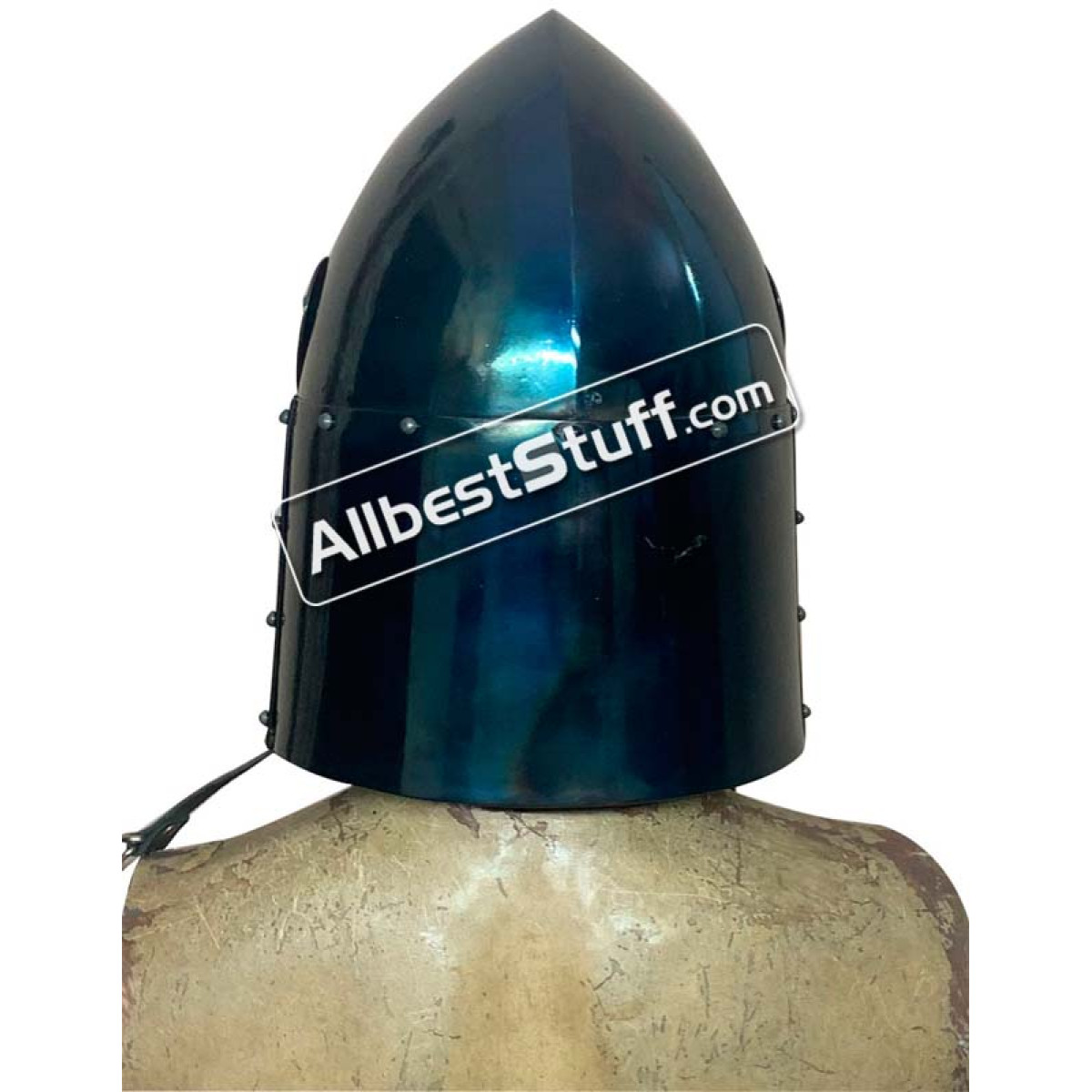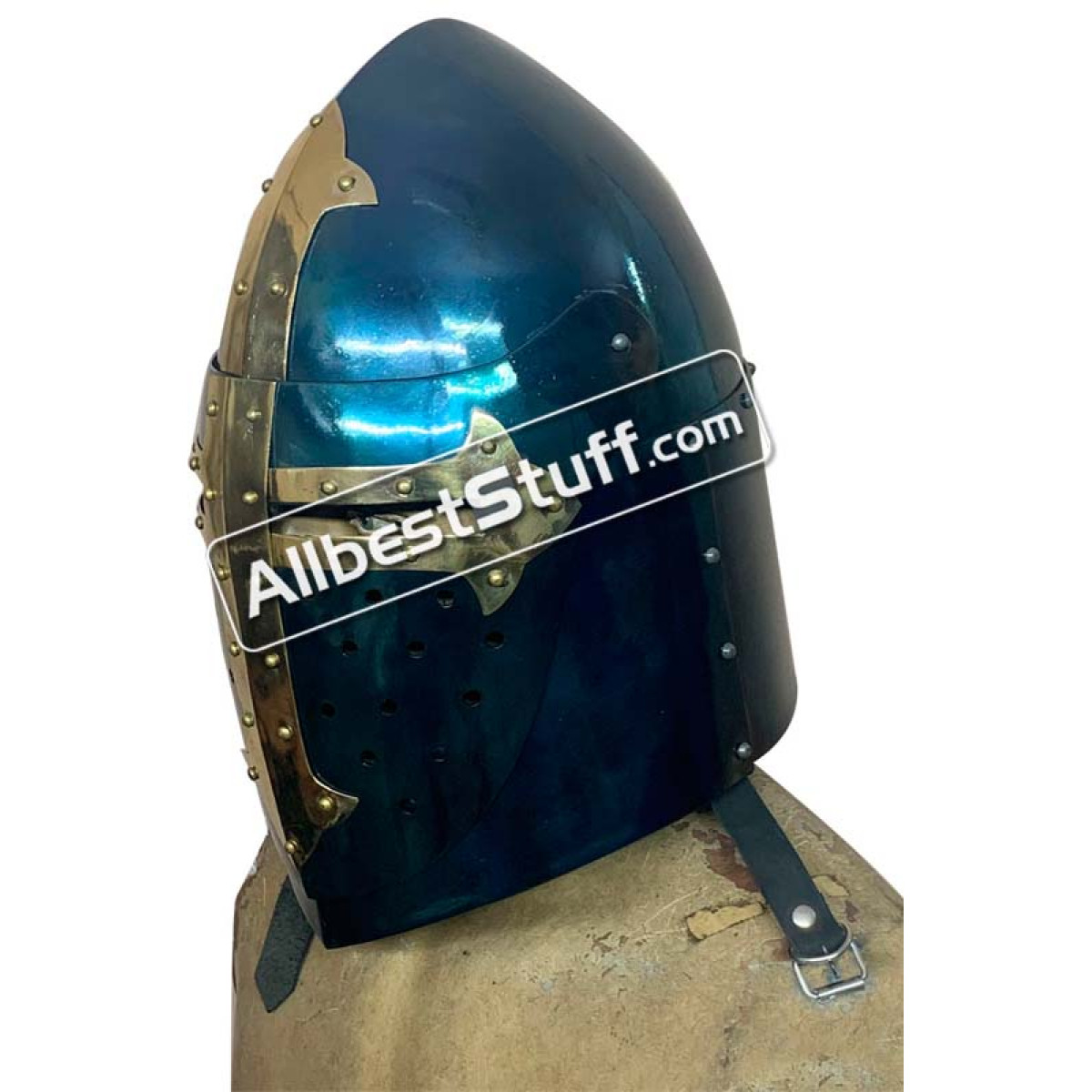 At this point in the early 14th century, the “Sugar Loaf” Helmet is becoming a type of bascinet. The visor gives the option of full face protection or having it open for a wider range of vision. The brass cross is typical of the design of the period. Great helms with a more conical bowl were also called Sugar loaf helmets on account of their resemblance to a sugar loaf. This shape gained popularity by the early 14th century. This replica distinguishes itself in that it features a hinged visor. The helmet is hand-crafted out of 16 Gauge steel. Standard Adult Size fully wearable.