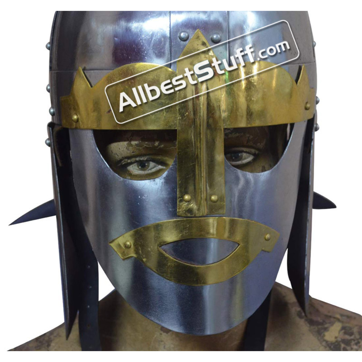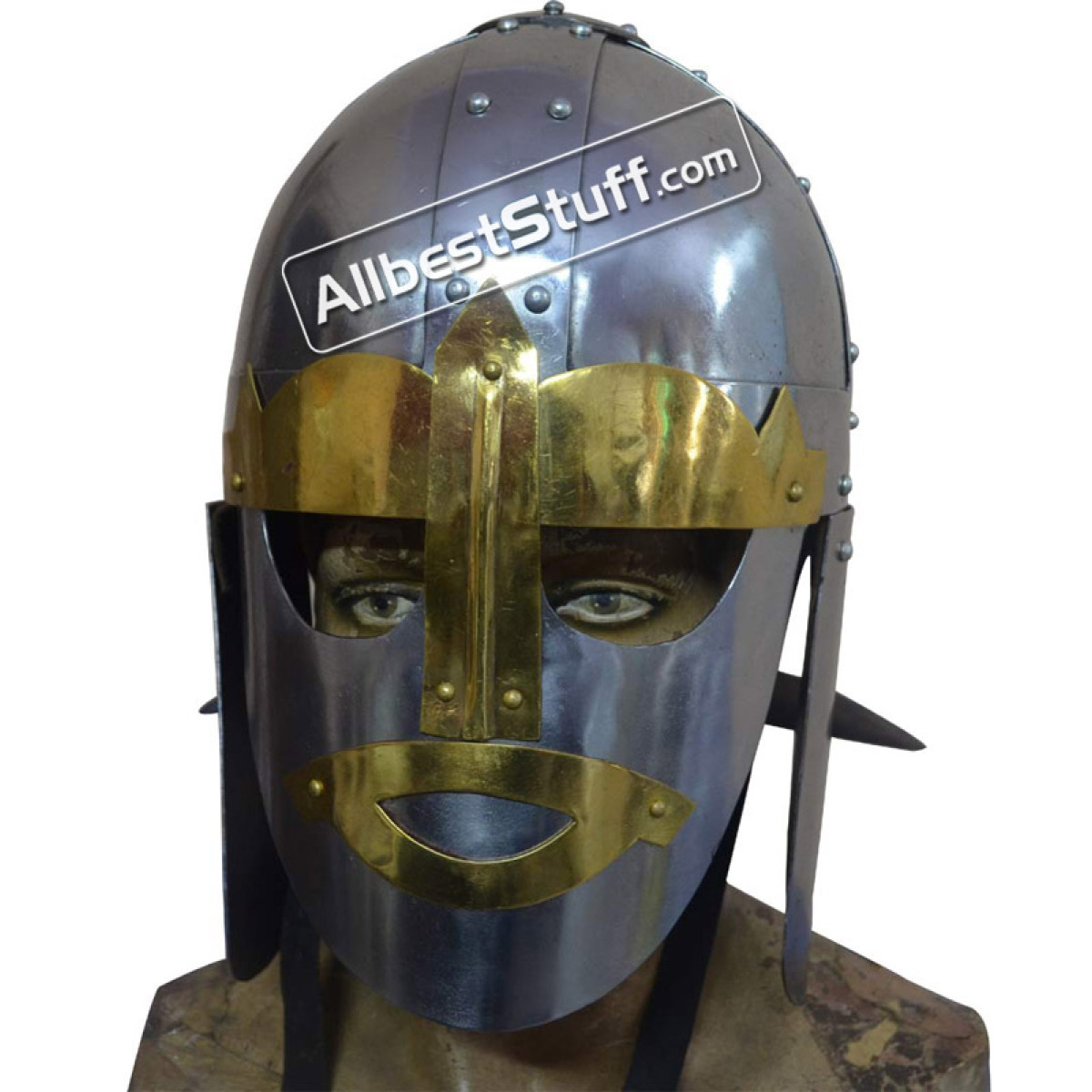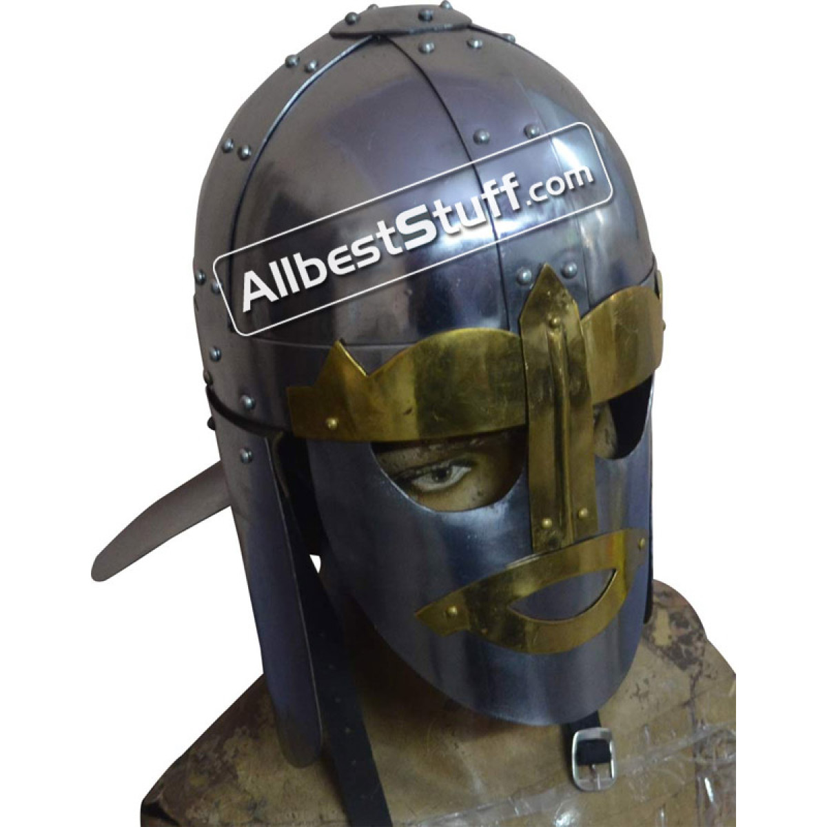 Sutton Hoo was located in the English county of Suffolk and is the site of two 6th and 7th century cemetaries and thus comes the inspiration for the Medieval Sutton Hoo Helmet. This location bears great significance in early medieval history, sorting out myth from fact. Featuring 18 gauge steel construction, this Spangenhelm style piece is highlighted by brass fittings and has nose and neck guards, as well as hinged cheek pieces for maximum protection. With unique style, this helmet is perfect for costumes, collections, and reenactments.