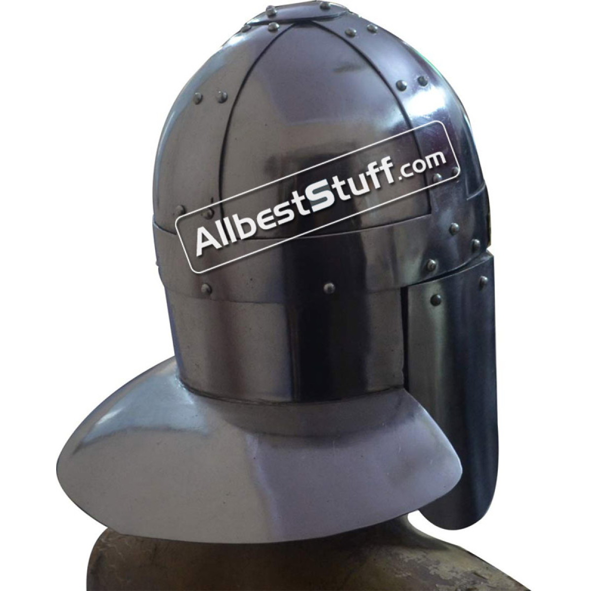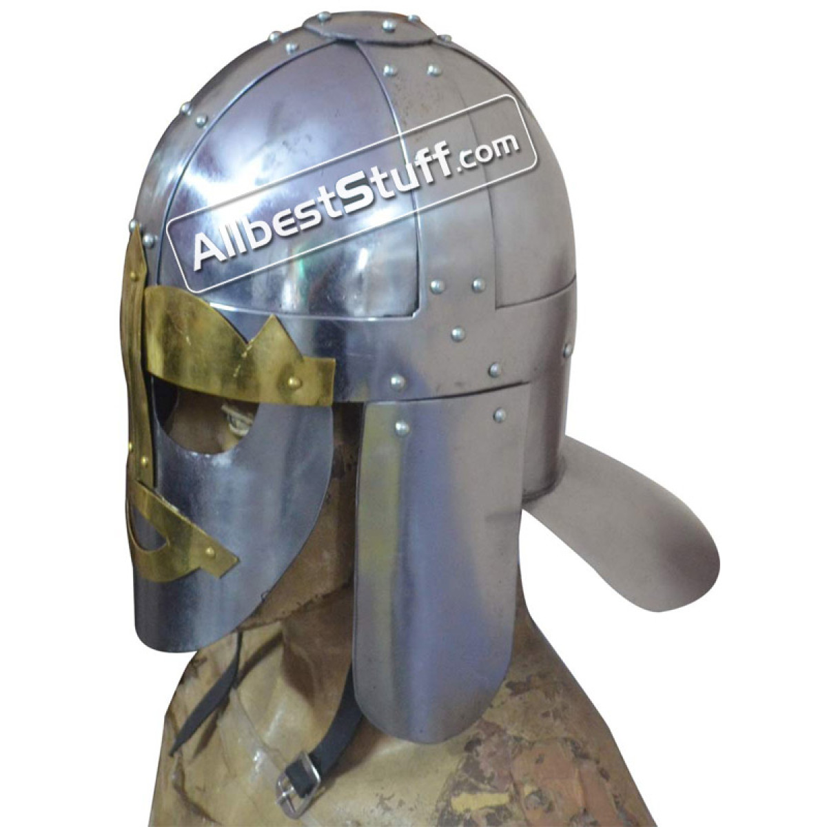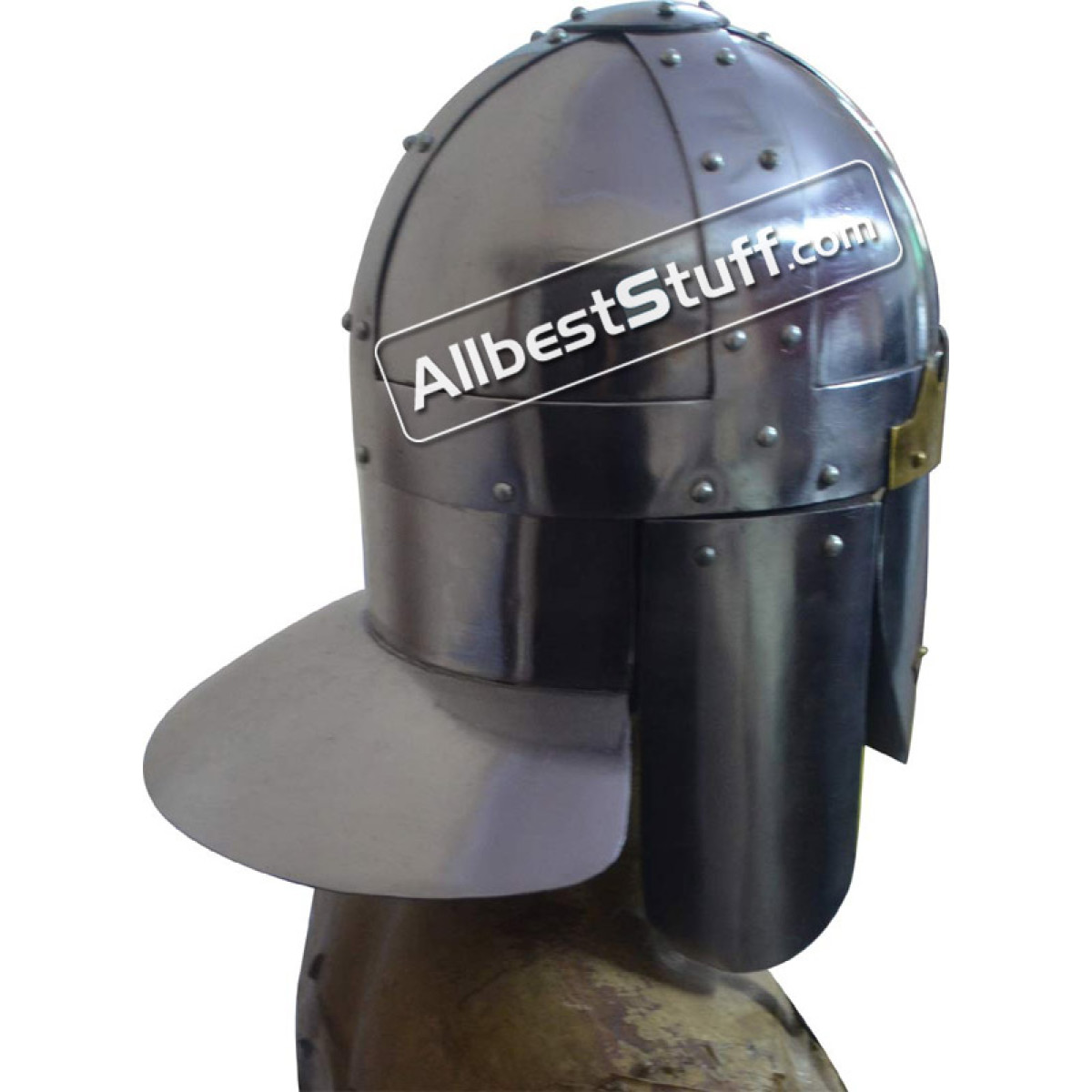Sutton Hoo was located in the English county of Suffolk and is the site of two 6th and 7th century cemetaries and thus comes the inspiration for the Medieval Sutton Hoo Helmet. This location bears great significance in early medieval history, sorting out myth from fact. Featuring 18 gauge steel construction, this Spangenhelm style piece is highlighted by brass fittings and has nose and neck guards, as well as hinged cheek pieces for maximum protection. With unique style, this helmet is perfect for costumes, collections, and reenactments.