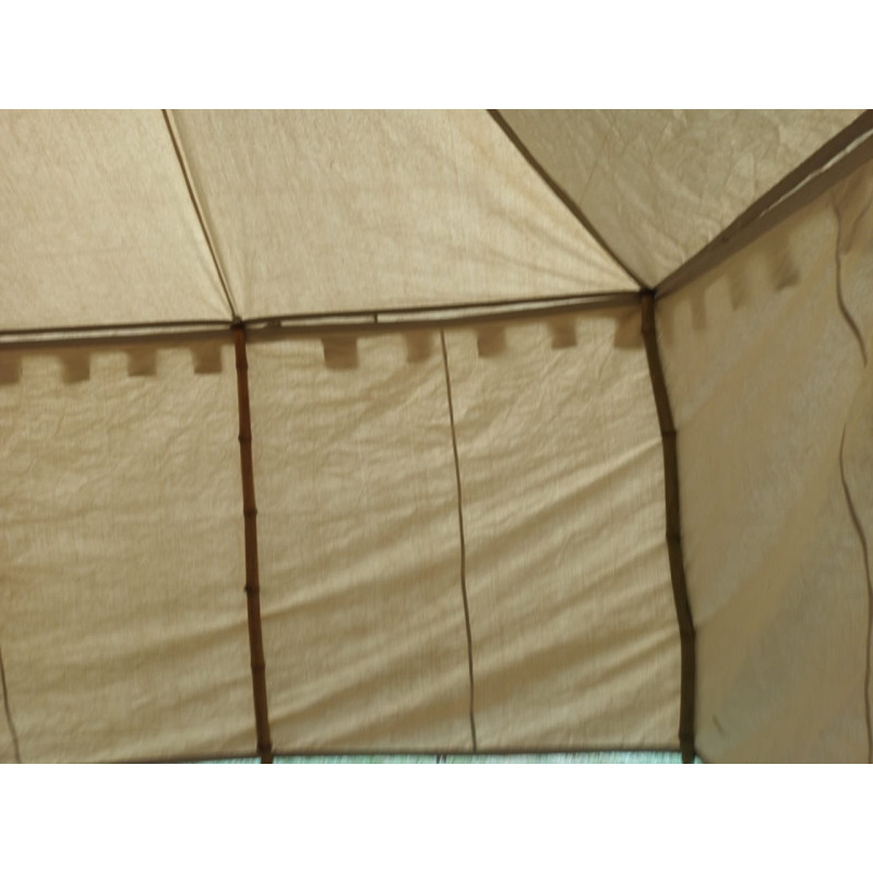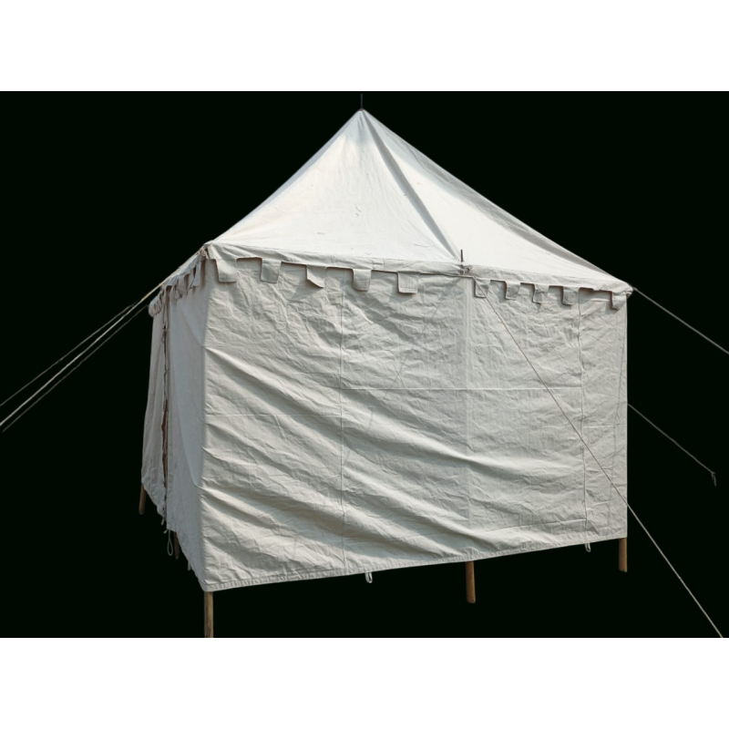 Medieval TentThis Medieval Tent is low cost, yet spacious and functional tents, suitable for military camps, medieval markets or LARP events. The Medieval Square tent is adorned with a headband that runs all the way around. The lower edge closes with a band that prevents dirt and dust from entering. The separate side wall simply needs to be connected to the roof by means of small hooks. The medieval tent can also be used as an awning by simply leaving the outer side. Indian Medieval Armour is offering 4 sizes from small to large in this tent.Dimensions: 2 x 2 M tent Entrance height: approx. 1.80 mCenter height: approx. 2.6 mSide height: approx. 1.80 mNatural (cotton, 350 g/m2)